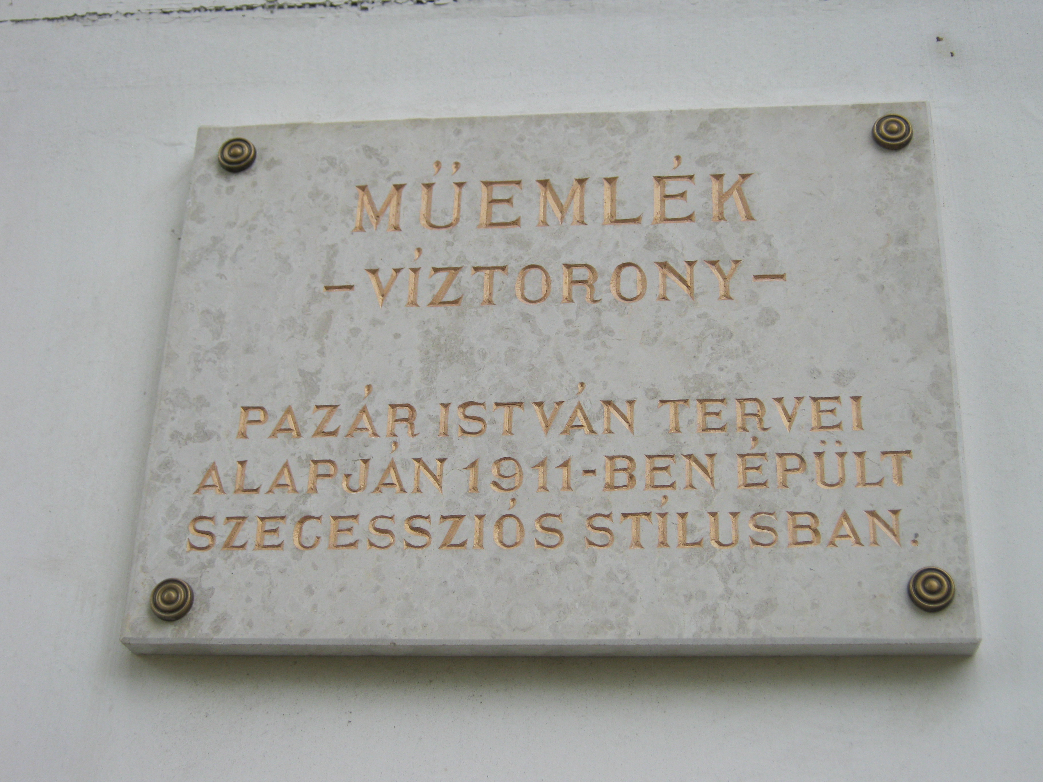 Nyilvános 1339 | 1860 | Nyíregyháza-Sóstó, Víztorony | Sóstófürdő szimbóluma a szintén Pazár István által 1911-ben tervezett víztorony. A felfelé keskenyedő vörös téglaoszlopot kiszélesedő, nyolcszögletű toronyrész koronázza. A 60 köbméteres víztorony ma már nem működik, ipari műemlékké nyilvánították. Földszintjén idegenforgalmi iroda és pizzabár működik. Felh. irod.: Látnivalók Szabolcs-Szatmár-Bereg megyében. Miskolc, Well-PRess, 1990 A fénykép 2010 augusztus elején készült |