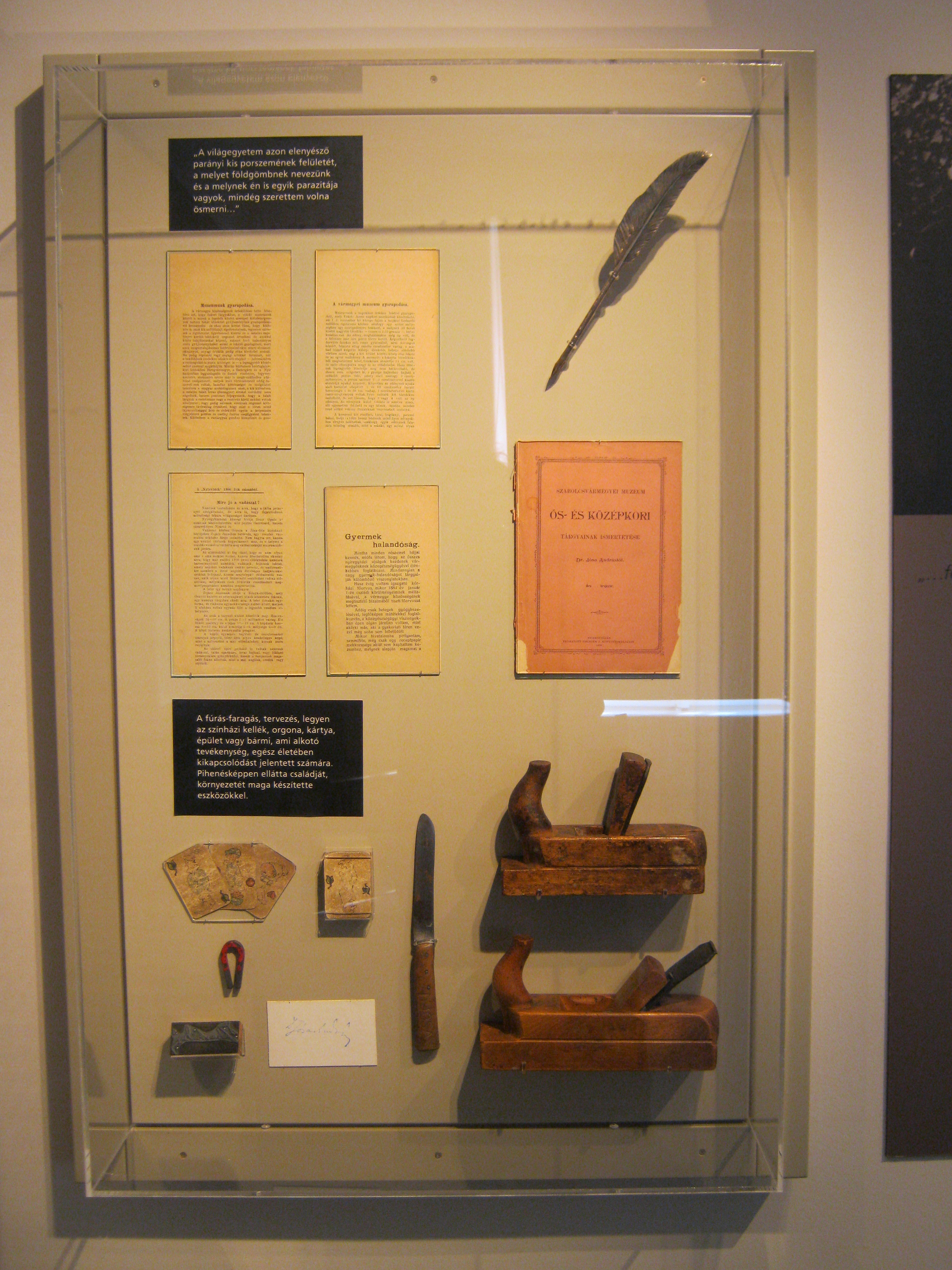 Nyilvános 1421 | 1899 | Nyíregyháza, Benczúr tér 21. Jósa András Múzeum | Magyarország egyik legrégibb múzeumát Dr. Jósa András alapította 1868-ban, akinek ma nevét viseli. Jósa András (1834-1918) Szabolcs vármegye legendás orvosa volt. Színes, sokoldalú egyéniségként amatőr régészettel is foglalkozott. A múzeum elődét még korábbi lakóhelyén, Nagykállón (lásd: Nagykálló, Somogyi B. u. 5-7.) szervezte meg Szabolcs Megyei Régészeti Egylet néven, ugyanis akkor még Nagykálló volt a megyeszékhely. Nyíregyháza megyei központtá válása után a gyűjtemény és ő maga is ide költözött (lásd még: Nyíregyháza, Malom u. 3.). Az első kiállítást is ő rendezte 1899-ben, akkor még a vármegyeháza (lásd:Nyíregyháza, Hősök tere 5.) épületében. A képen a Jósa-emlékkiállítás egyik tárlója látható, benne az orvos-muzeológus famegmunkáló szerszámaival. Felh. irod.: Látnivalók Szabolcs-Szatmár-Bereg megyében. Miskolc, Well-PRess, 1999 http://jam.nyirbone.hu A fénykép 2010 augusztus elején készült. |