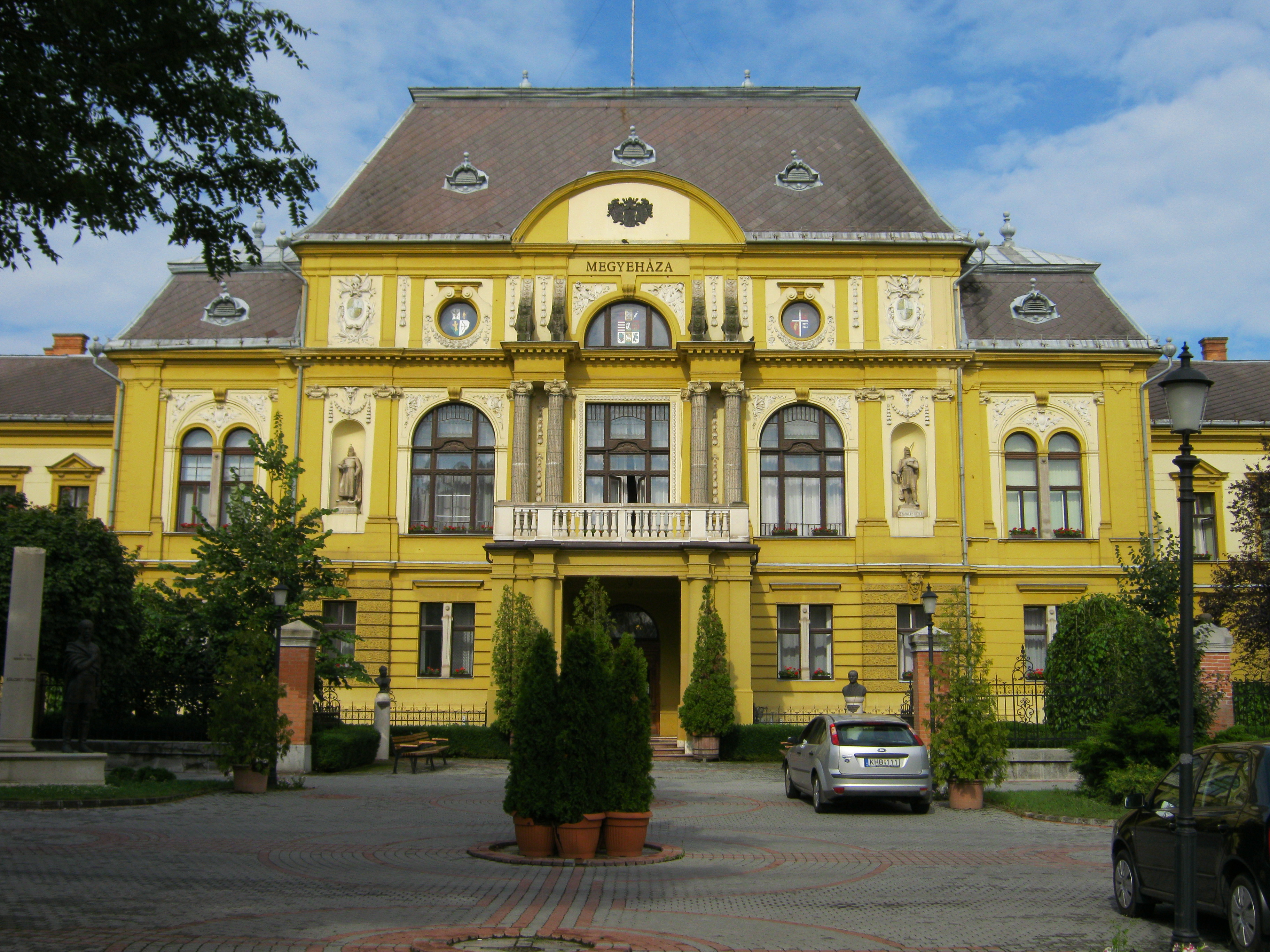 Nyilvános 1373 | 1775 | Nyíregyháza, Hősök tere 5. Megyeháza | Az eklektikus stílusú megyeháza 1891-1892-ben, Alpár Ignác tervei szerint épült. Homlokzatát Szabolcs vezér és az államalapító István király szobrai díszítik. Az épületplasztikák és díszítmények Verán József munkái. Nyíregyháza 1876-ban lett megyeszékhely, korábban Nagykálló töltötte be ezt a szerepet. A megyeháza épületében volt a még Nagykállón megalapított megyei múzeum első otthona. Dolgozott itt dr. Jósa András, az intézmény létrehozója, aki kitűnő orvosként régészettel is foglalkozott, őt az 1910-es évektől dr. Kiss Lajos néprajztudós váltotta fel. Felh. irod.: Látnivalók Szabolcs-Szatmár-Bereg megyében. Miskolc, Well-PRess, 1999 Margócsy József: Utcák terek emléktáblák 3. Nyíregyháza, Városi Tanács, 1989 A fénykép 2010 augusztus elején készült. |