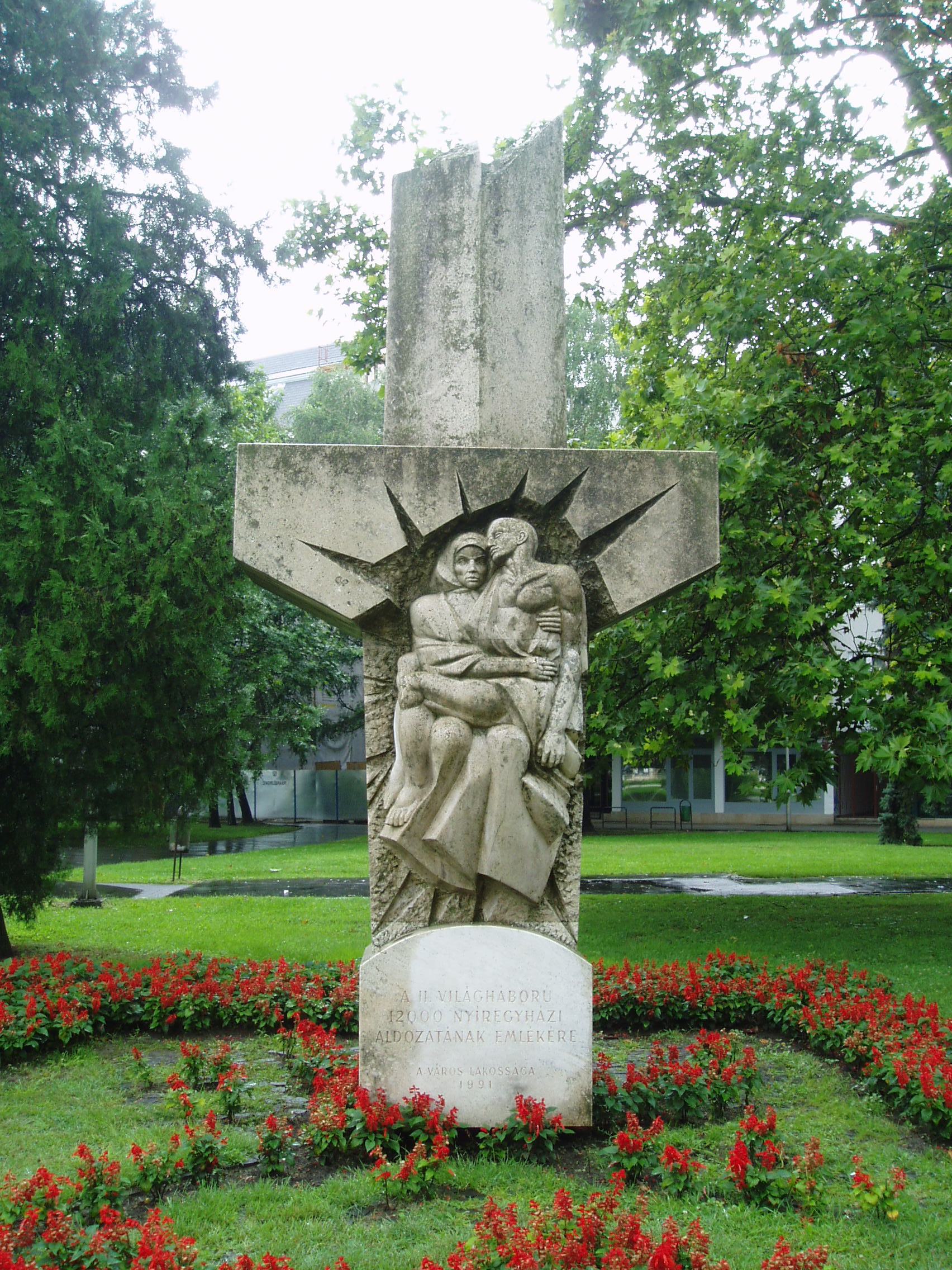 Nyilvános 1403 | 2236 | Nyíregyháza, Országzászló tér: A II. világháború nyíregyházi áldozatai | A szépen kialakított parkban 1991-ben helyezték el a második világháború nyíregyházi áldozatainak kőből faragott, kereszt alakú emlékművét. Gyurcsek Ferenc alkotását Antall József miniszterelnök avatta fel. Felh. irod.: www.szoborlap.hu A fénykép 2010 augusztus elején készült. |