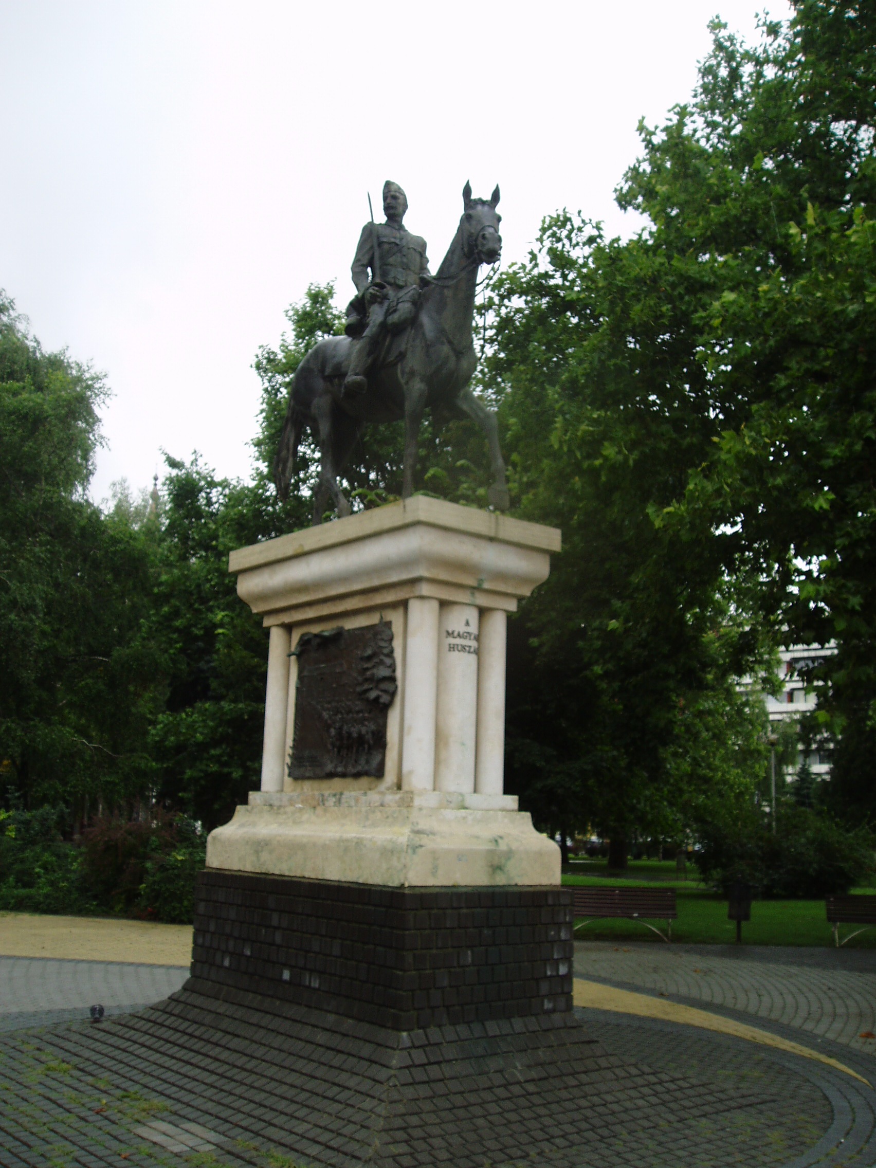 Nyilvános 1390 | 2197 | Nyíregyháza, Országzászló tér: Magyar huszár emlékmű | Győrfi Sándor alkotása az Országzászló téren elhelyezett "A magyar huszár" című emlékmű. Főalakja egy díszszemlén léptető, Bocskai sapkás huszárt ábrázol. A talapzat két oldalán látható domborművek közül az egyik a Hadik-huszárok rohamát idézi fel a napóleoni háborúk korából, míg a másik utolsó kivonulásukat a frontra 1944 nyarán. A kivonuló katonák hátterében a nyíregyházi laktanya épületét örökítette meg a szobrász. Felh. irod.: www.szoborlap.hu A fénykép 2010 augusztus elején készült. |