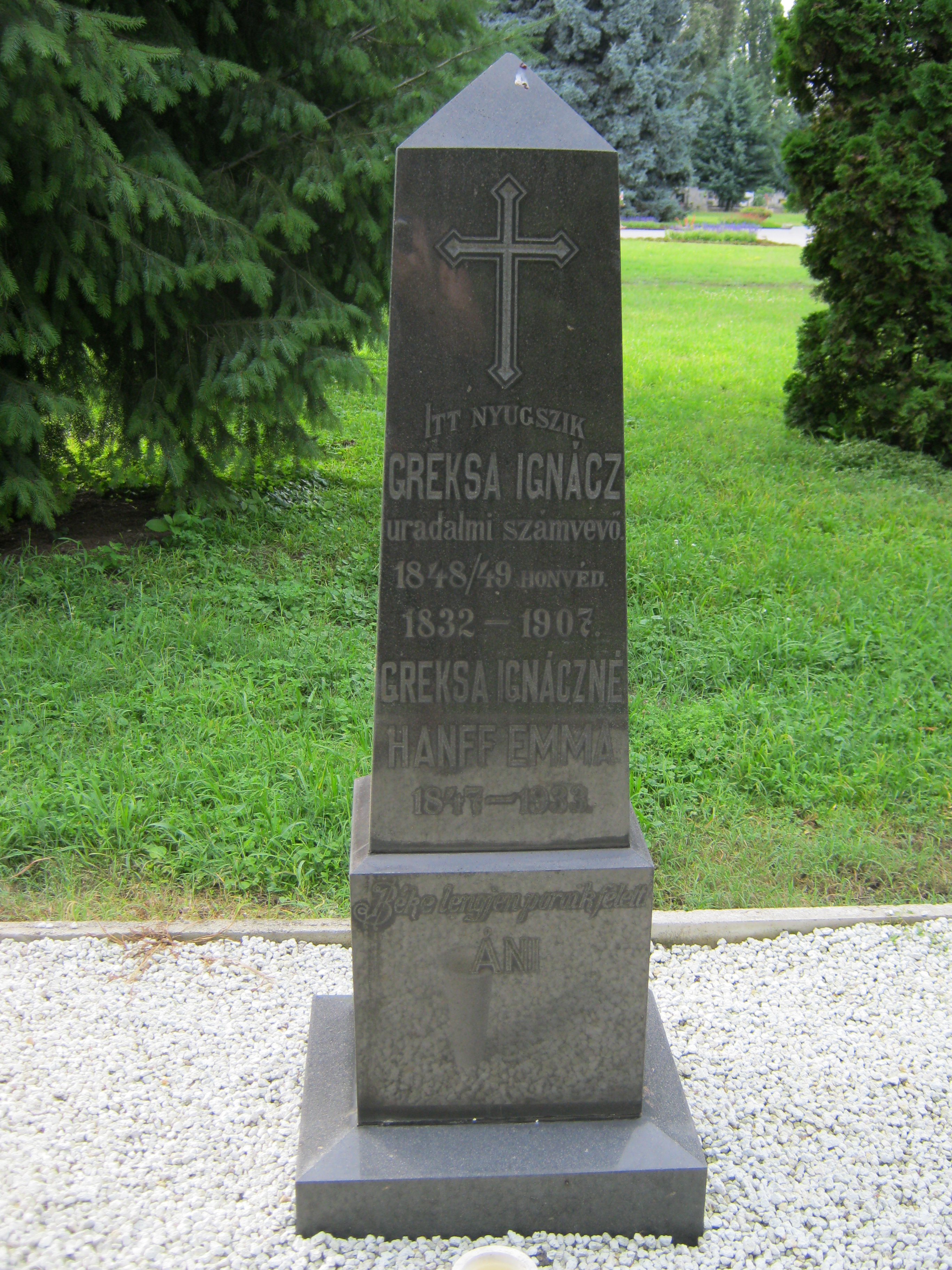 Nyilvános 1395 | 1846 | Nyíregyháza, Pazonyi tér, Északi temető: Greksa Ignác | A Dózsa György út vezet Nyíregyháza Északi temetőjébe. A díszsírhelyek sorában itt találjuk Greksa Ignác (1832-1907) uradalmi számvevő, 1848-as honvéd sírkövét. Felh. irod.: Fazekas Árpád - Szekrényes András: Nyíregyháza temetői. Nyíregyháza, 1990 A fénykép 2010 augusztus elején készült |