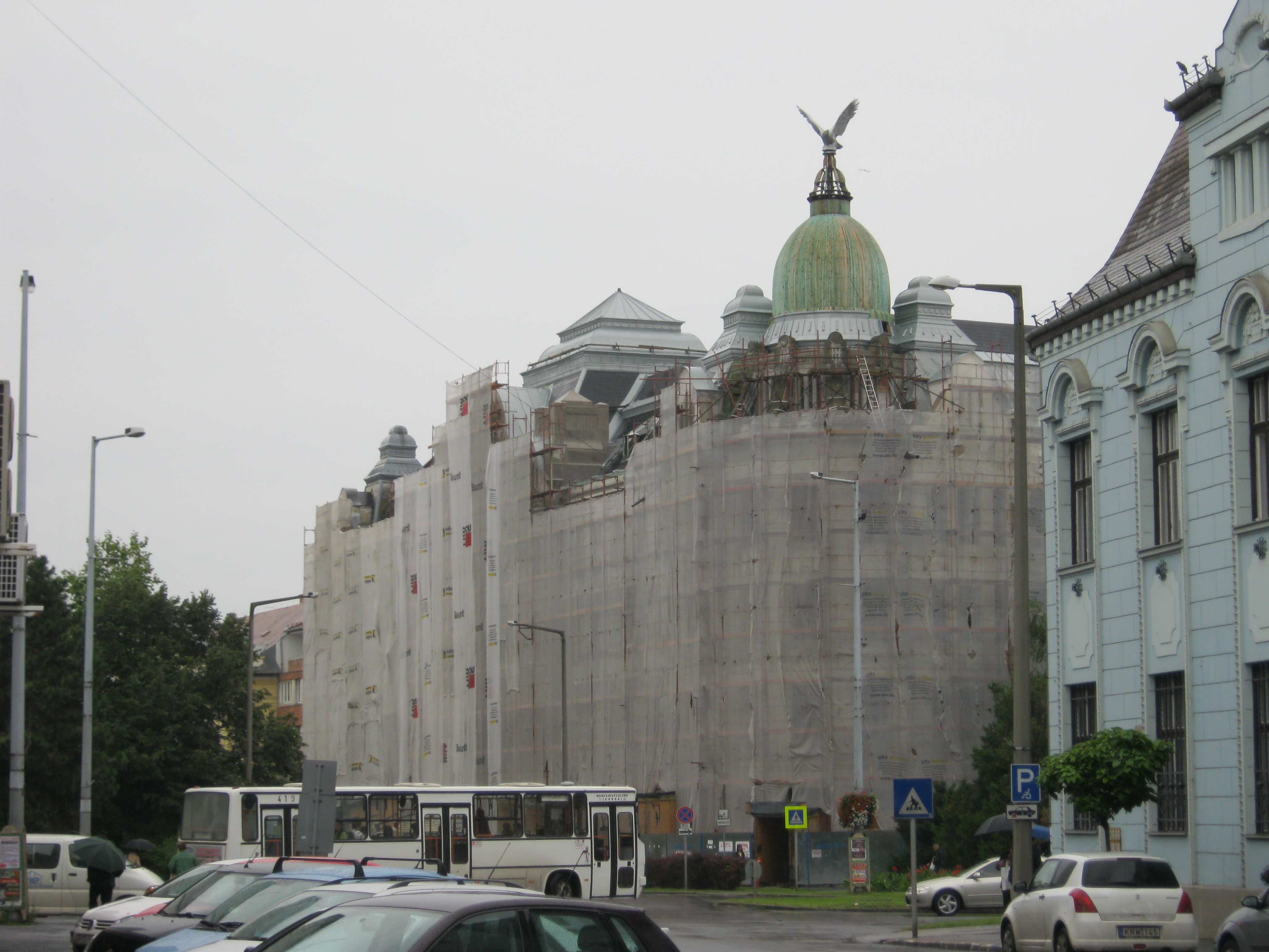Nyilvános 1352 | 1802 | Nyíregyháza, Széchenyi utca 1. Nyírvíz-palota | Az Országzászló tér nyugati oldalán indul a város egykori főútvonala, a Széchenyi utca. Itt van a bejárata a hatalmas tömböt elfoglaló Nyírvíz-palotának, amely 1913-ban épült a Nyírvíz-szabályozó Társulat székházának Papp Gyula és Szabolcs Ferenc tervei alapján. A városban mind építészetileg, mind városképileg meghatározó épület szecessziós és eklektikus jegyeket visel magán. A lépcsőház díszes ablakai (87 négyzetméter), a lift és a függőfolyosó lengő ajtajainak maratott üvegei (43 négyzetméter), valamint a homlokzat gyönyörű díszei Róth Miksa műhelyében (lásd: Budapest, 07. Nefelejcs u. 26.) készültek. Eredetileg a földszinten üzletek, szolgálati lakások, az emeleteken bérlakások, hivatal helyiségek nyertek elhelyzést. Személy- és teherfelvonóval, házi vízvezetékrendszerrel és központi fűtéssel rendelkezett. Két kapubejárata lett a Széchenyi utca és az Országzászló tér felől nyílik, amelyek ikerlépcsőházban találkoznak. Kupoláján rétisas látható, amely az eltűnt eredeti másolata. (Ottjártamkor felállványozva találtam, de mivel fontos épület, ebben az állapotában is lefényképeztem. KK.) Felh. irod.: www.nyirviz.hu A fénykép 2010 augusztus elején készült |
