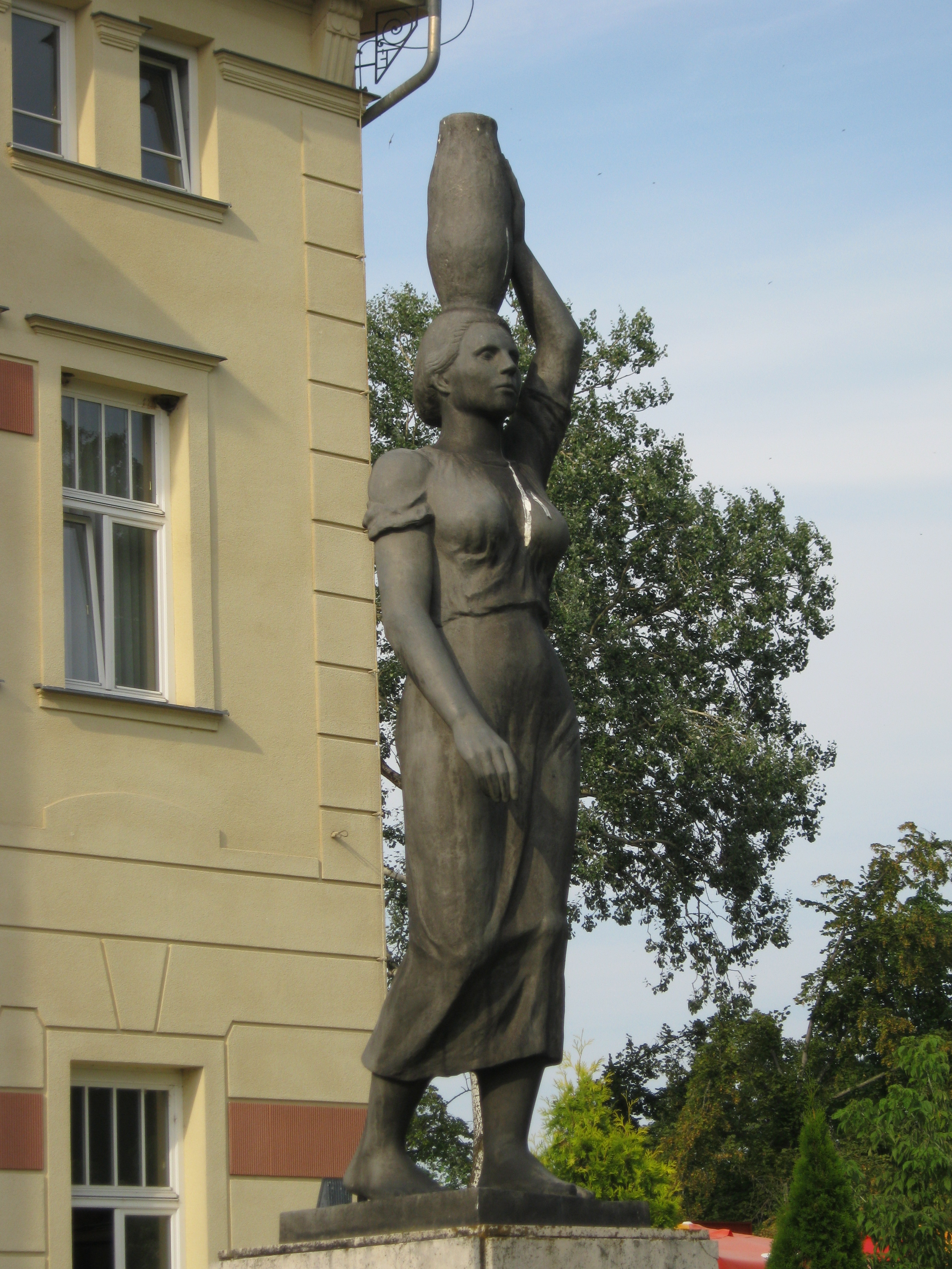 Nyilvános 1337 | 1825 | Nyíregyháza-Sóstó, Krúdy-Vigadó előtt: Korsóvivő | Nyíregyháza-Sóstó első köztéri szobra, Halmágyi István: Koesósvivő című alkotása (1940) a Krúdy Vigadó előtt áll. Felh. irod.: www.szoborlap,hu A fénykép 2010 augusztus elején készült |