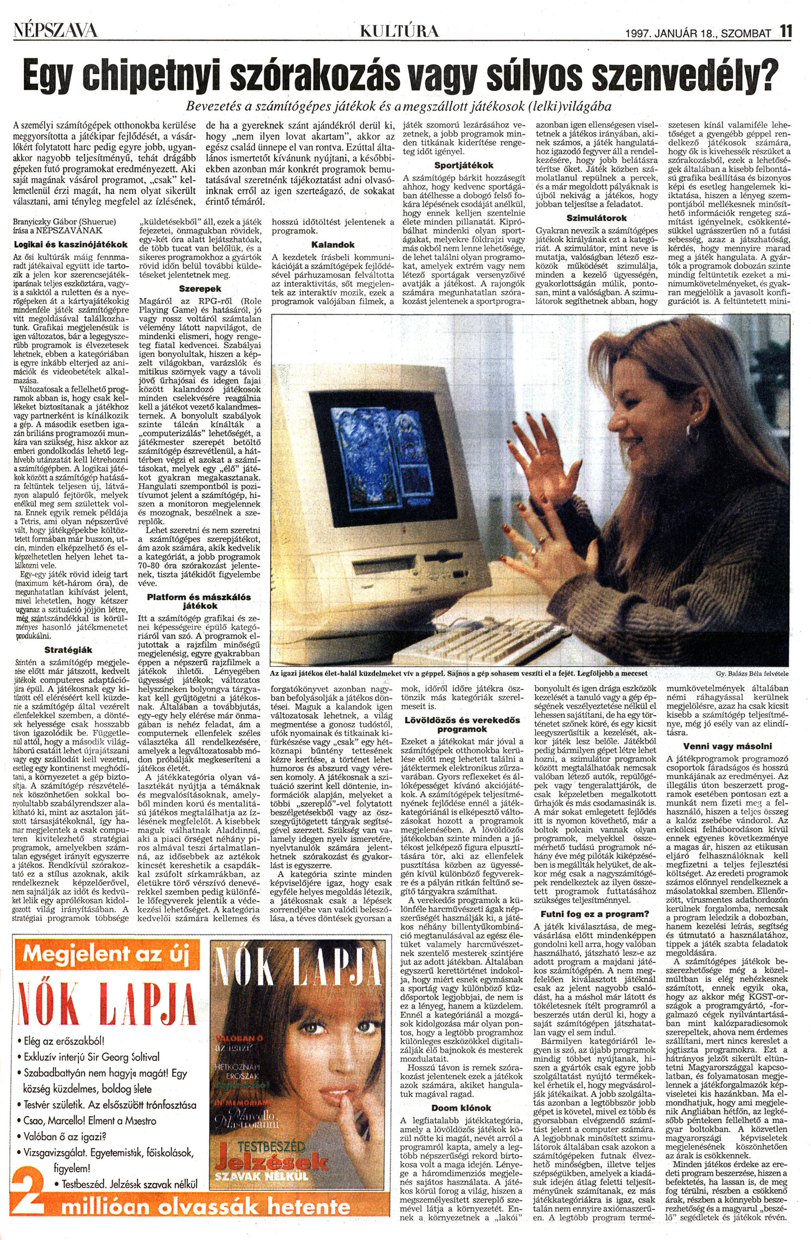 Nyilvános 2020 | 3247 | Népszava 1997.01.18. 11old - Egy chipetnyi szórakozás vagy súlyos szenvedély | A következő szöveg a cikk szövegéből keletkezett automata szövegfelismertető segítségével NÉPSZAVA KULTÚR V . 1997. JANUÁR 18., SZOMBAT 11 Egy chipetnyi szórakozás vagy súlyos szenvedély? Bevezetés a számítógépes játékok és a megszállott játékosok (lelkivilágába A személyi számítógépek otthonokba kerülése meggyorsította a játékipar fejlődéséi, a vásárlókért folytatóit harc pedig egyre jobb, ugyanakkor nagyobb teljesítményű, tehát drágább gépeken futó programokat eredményezett. Aki saját magának vásárol programot, „csak" kellemetlenül érzi magát, ha nem olyat sikerült választani, ami tényleg megfelel az ízlésének. átékoi élet-halál küzdelmeket vív a géppel. Sajnos a gép sohasem veszíti el a fejét. Legföljebb a meccset Gy. Balázs Béla felvétele Branyiezky Gábor (Shuerue) Írása a NÉPSZAVÁNAK Logikai és kaszinó játékok Az ősi kultúrák máig fennmaradt játékaival együtt ide tartozik a jelen kor szerencsejátékiparának teljes eszköztára, vagyis a sakktól a ruletten és a nyerőgépeken át a kártyajátékokig mindenféle játék számítógépre vitt megoldásával találkozhatunk. Grafikai megjelenésük is igen változatos, bár a legegyszerűbb programok is élvezetesek lehetnek, ebben a kategóriában is egyre inkább elterjed az animációk és vídeobetétek alkal- Változatosak a fellelhető programok abban is, hogy csak kellékeket biztosítanak a játékhoz vagy partnerként is kínálkozik a gép. A második esetben igazan briliáns programozói munkára van szükség, hisz akkor az emberi gondolkodás lehető leghívebb utánzatát kell létrehozni a számitógépben. A logikai játékok között a számítógép hatására feltűntek teljesen új, látványon alapuló fejtörők, melyek enélkül meg sem születtek volna. Ennek egyik remek példája a Tetris, ami olyan népszerűvé vált, hogy játékgépekbe költöztetett formában már buszon, utcán, minden elképzelhető és elképzelhetetlen helyen lehet találkozni vele. Egy-egy játék rövid ideig tart (maximum két-három óra), de megunhatatlan kihívást jelent, mivel lehetetlen, hogy kétszer ugyanaz a szituáció jöjjön létre, meg szántszándékkal is körülményes hasonló játékmenetet (redukálni. Stratégiák Sanlén a számítógép megjelenése előtt már játszott, kedvelt játékok computeres adaptációjára épül. A játékosnak egy kitűzött cél eléréséért kell küzdenie a számítógép által vezérelt ellenfelekkel szemben, a döntések helyessége csak hosszabb tavon igazolódik be. Függetlenül attól, hogy a második világháború csatáit lehet újrajátszani \'??agy egy szállodát kell vezetni, esetleg egy kontinenst meghódítani, a környezetet a gép biztosítja. A számítógép részvételének köszönhetően sokkal bonyolultabb szabályrendszer alakítható ki, mint az asztalon játszott társasjátékoknál, így hamar megjelentek a csak computeren kivitelezhető stratégiai programok, amelyekben számtalan egységet irányít egyszerre a játékos. Rendkívül szórakoztató ez a stílus azoknak, akik rendelkeznek képzelöerövel, nem sajnálják az időt és kedvüket lelik egy aprólékosan kidolgozott világ irányításában. A stratégiai programok többsége de ha a gyereknek szánt ajándékról derül ki, hogy „nem ilyen lovat akartam", akkor az egész család ünnepe el van rontva. Ezúttal általános ismertetőt kívánunk nyújtani, a későbbiekben azonban már konkrét programok bemutatásával szeretnénk tájékoztatást adni olvasóinknak erről az igen szerteágazó, de sokakat érintő témáról. hosszú időtöltést jelentenek a programok. Kalandok A kezdetek írásbeli kommuni-kációját a számítógépek fejlődésével párhuzamosan felváltotta az interaktivitás, sőt megjelentek az interaktív mozik, ezek a programok valójában filmek, a „küldetésekből" áll, ezek a játék fejezetei, önmagukban rövidek, egy-két óra alatt lejátszhatóak, de több tucat van belőlük, és a sikeres programokhoz a gyártók rövid időn belül további küldetéseket jelentetnek meg. Szerepek Magáról az RPG-röl (Role Playing Game) és hatásáról, jó vagy rossz voltáról számtalan vélemény látott napvilágot, de mindenki elismeri, hogy rengeteg fiatal kedvencei. Szabályai igen bonyolultak, hiszen a képzelt világokban, varázslók és mitikus szörnyek vagy a távoli jövő űrhajósai és idegen fajai között kalandozó játékosok minden cselekvésére reagálnia kell a játékot vezető kalandmesternek. A bonyolult szabályok szinte tálcán kínálták a „computerizálás" lehetőségét, a játékmester szerepét betöltő számítógép észrevétlenül, a háttérben végzi el azokat a számításokat, melyek egy „élő" játékot gyakran megakasztanak. Hangulati szempontból is pozitívumot jelent a számítógép, hiszen a monitoron megjelennek és mozognak, beszélnek a szereplők. Lehet szeretni és nem szeretni a számítógépes szerepjátékot, ám azok számára, akik kedvelik a kategóriát, a jobb programok 70-80 óra szórakozást jelentenek, tiszta játékidőt figyelembe véve. Platform és maszkáié* játékok forgatókönyvet azonban nagyfa b f lyásolják a játékos döntései. Maguk a kalandok igen változatosak lehetnek, a világ m gm tése a gonosz tudóstól, ifók nyomainak és titkainak ki-fürkészése vagy „csak" egy hét-k p bűntény tettesének kézr kerítése, a történet lehet humoros és abszurd vagy vérese komoly. A játékosnak a szituáció szerint kell döntenie, in-f rmá ók alapján, melyeket a több szereplő"-vel folytatott beszélg tésekböl vagy az ösz-gyujtógetett tárgyak segítségé 1 érzett. Szükség van va-1 m 1 degen nyelv ismeretére, ílvtanulók szá