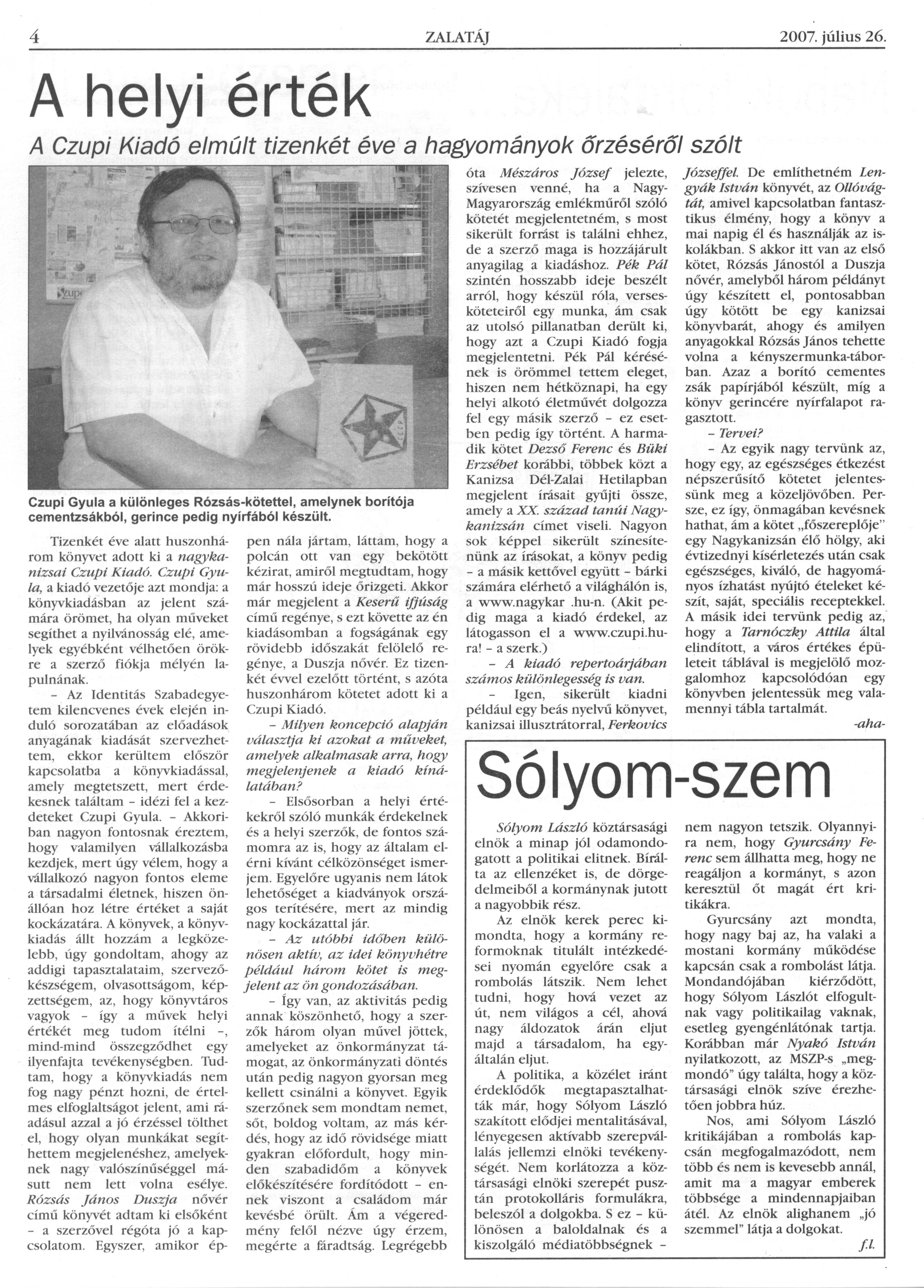 Nyilvános 1664 | 3102 | Zalatáj 2007. július 26. 650. szám 4. oldal | A helyi érték A Czupi Kiadó elmúlt tizenkét éve a hagyományok őrzéséről szólt Czupi Gyula a különleges Rózsás-kötettel, amelynek borítója cementzsákból, gerince pedig nyírfából készült. Tizenkét éve alatt huszonhárom könyvet adott ki a nagykanizsai Czupi Kiadó. Czupi Gyula, a kiadó vezetője azt mondja: a könyvkiadásban az jelent számára örömet, ha olyan műveket segíthet a nyilvánosság elé, amelyek egyébként vélhetően örökre a szerző fiókja mélyén lapulnának. – Az Identitás Szabadegyetem kilencvenes évek elején induló sorozatában az előadások anyagának kiadását szervezhettem, ekkor kerültem először kapcsolatba a könyvkiadással, amely megtetszett, mert érdekesnek találtam – idézi fel a kezdeteket Czupi Gyula. – Akkoriban nagyon fontosnak éreztem, hogy valamilyen vállalkozásba kezdjek, mert úgy vélem, hogy a vállalkozó nagyon fontos eleme a társadalmi életnek, hiszen önállóan hoz létre értéket a saját kockázatára. A könyvek, a könyvkiadás állt hozzám a legközelebb, úgy gondoltam, ahogy az addigi tapasztalataim, szervezőkészségem, olvasottságom, képzettségem, az, hogy könyvtáros vagyok – így a művek helyi értékét meg tudom ítélni –, mind-mind összegződhet egy ilyenfajta tevékenységben. Tudtam, hogy a könyvkiadás nem fog nagy pénzt hozni, de értelmes elfoglaltságot jelent, ami ráadásul azzal a jó érzéssel tölthet el, hogy olyan munkákat segíthettem megjelenéshez, amelyeknek nagy valószínűséggel másutt nem lett volna esélye. Rózsás János Duszja nővér című könyvét adtam ki elsőként – a szerzővel régóta jó a kapcsolatom. Egyszer, amikor éppen nála jártam, láttam, hogy a polcán ott van egy bekötött kézirat, amiről megtudtam, hogy már hosszú ideje őrizgeti. Akkor már megjelent a Keserű ifjúság című regénye, s ezt követte az én kiadásomban a fogságának egy rövidebb időszakát felölelő regénye, a Duszja nővér. Ez tizenkét évvel ezelőtt történt, s azóta huszonhárom kötetet adott ki a Czupi Kiadó. – Milyen koncepció alapján választja ki azokat a műveket, amelyek alkalmasak arra, hogy megjelenjenek a kiadó kínálatában? – Elsősorban a helyi értékekről szóló munkák érdekelnek és a helyi szerzők, de fontos számomra az is, hogy az általam elérni kívánt célközönséget ismerjem. Egyelőre ugyanis nem látok lehetőséget a kiadványok országos terítésére, mert az mindig nagy kockázattal jár. – Az utóbbi időben különösen aktív, az idei könyvhétre például három kötet is megjelent az ön gondozásában. – Így van, az aktivitás pedig annak köszönhető, hogy a szerzők három olyan művel jöttek, amelyeket az önkormányzat támogat, az önkormányzati döntés után pedig nagyon gyorsan meg kellett csinálni a könyvet. Egyik szerzőnek sem mondtam nemet, sőt, boldog voltam, az más kérdés, hogy az idő rövidsége miatt gyakran előfordult, hogy minden szabadidőm a könyvek előkészítésére fordítódott – ennek viszont a családom már kevésbé örült. Ám a végeredmény felől nézve úgy érzem, megérte a fáradtság. Legrégebb óta Mészáros József jelezte, szívesen venné, ha a Nagy-Magyarország emlékműről szóló kötetét megjelentetném, s most sikerült forrást is találni ehhez, de a szerző maga is hozzájárult anyagilag a kiadáshoz. Pék Pál szintén hosszabb ideje beszélt arról, hogy készül róla, versesköteteiről egy munka, ám csak az utolsó pillanatban derült ki, hogy azt a Czupi Kiadó fogja megjelentetni. Pék Pál kérésének is örömmel tettem eleget, hiszen nem hétköznapi, ha egy helyi alkotó életművét dolgozza fel egy másik szerző – ez esetben pedig így történt. A harmadik kötet Dezső Ferenc és Büki Erzsébet korábbi, többek közt a Kanizsa Dél-Zalai Hetilapban megjelent írásait gyűjti össze, amely a XX. század tanúi Nagykanizsán címet viseli. Nagyon sok képpel sikerült színesítenünk az írásokat, a könyv pedig – a másik kettővel együtt – bárki számára elérhető a világhálón is, a www.nagykar.hu-n. (Akit pedig maga a kiadó érdekel, az látogasson el a www.czupi.hu-ra! – a szerk.) – A kiadó repertoárjában számos különlegesség is van. – Igen, sikerült kiadni például egy beás nyelvű könyvet, kanizsai illusztrátorral, Ferkovics Józseffel. De említhetném Lengyák István könyvét, az Ollóvágtát, amivel kapcsolatban fantasztikus élmény, hogy a könyv a mai napig él és használják az iskolákban. S akkor itt van az első kötet, Rózsás Jánostól a Duszja nővér, amelyből három példányt úgy készített el, pontosabban úgy kötött be egy kanizsai könyvbarát, ahogy és amilyen anyagokkal Rózsás János tehette volna a kényszermunka-táborban. Azaz a borító cementes zsák papírjából készült, míg a könyv gerincére nyírfalapot ragasztott. – Tervei? – Az egyik nagy tervünk az, hogy egy, az egészséges étkezést népszerűsítő kötetet jelentessünk meg a közeljövőben. Persze, ez így, önmagában kevésnek hathat, ám a kötet „főszereplője” egy Nagykanizsán élő hölgy, aki évtizednyi kísérletezés után csak egészséges, kiváló, de hagyományos ízhatást nyújtó ételeket készít, saját, speciális receptekkel. A másik idei tervünk pedig az, hogy a Tarnóczky Attila által elindított, a város értékes épületeit táblával is megjelölő mozgalomhoz kapcsolódóan egy könyvben jelentessük meg valamennyi tábla tartalmát. -aha- |