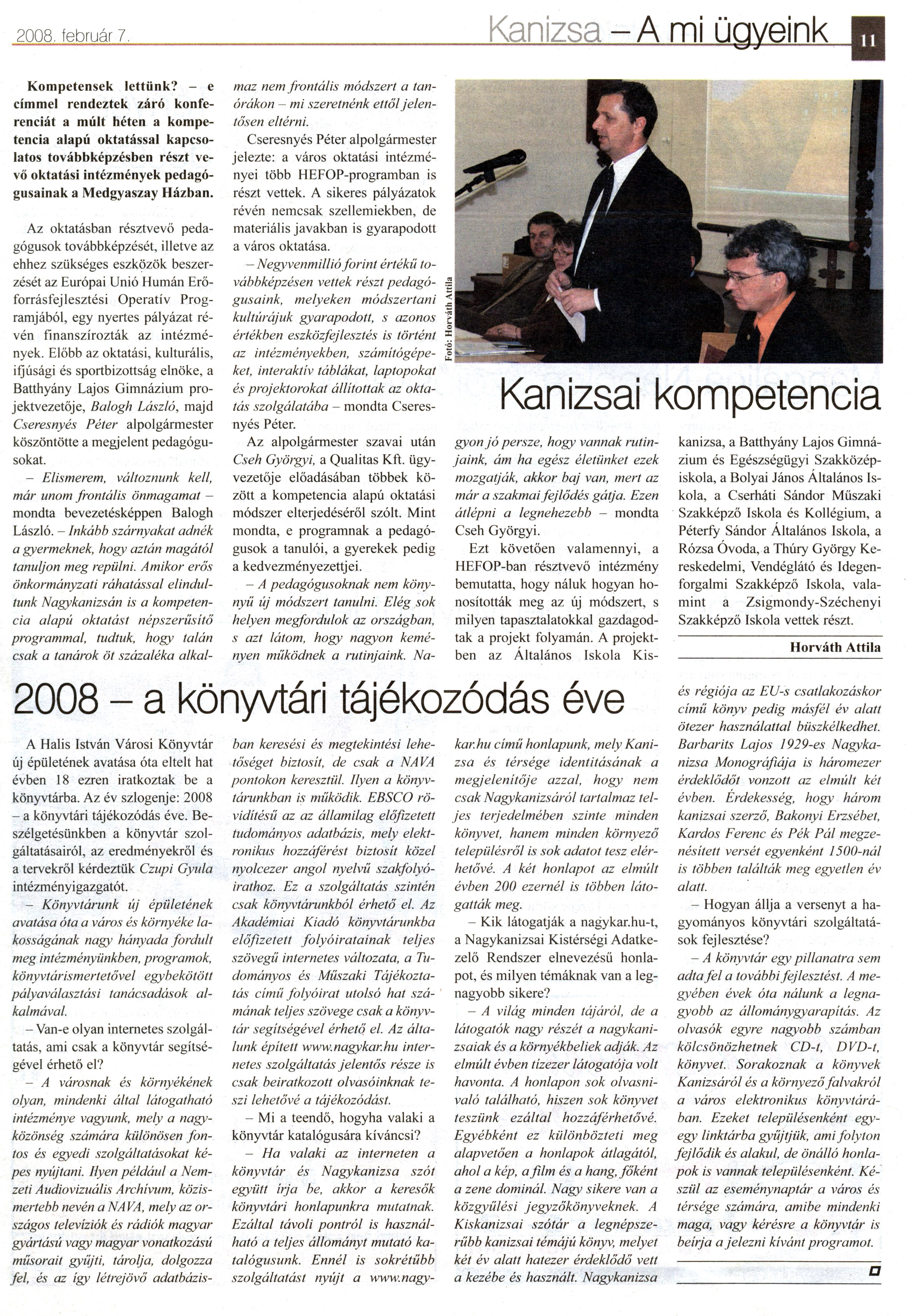 Nyilvános 2535 | 4923 | Kanizsa 2008. február 7. 11. oldal | 2008 - A könyvtári tájékozódás éve 2008 - a könyvtári tájékozódás éve A Halis István Városi Könyvtár új épületének avatása óta eltelt hat évben 18 ezren iratkoztak be a könyvtárba. Az év szlogenje: 2008 - a könyvtári tájékozódás éve. Beszélgetésünkben a könyvtár szolgáltatásairól, az eredményekről és a tervekről kérdeztük Czupi Gyula intézményigazgatót. - Könyvtárunk új épületének avatása óta a város és környéke lakosságának nagy hányada fordult meg intézményünkben, programok, könyvtárismertetővel egybekötött pályaválasztási tanácsadások alkalmával. - Van-e olyan internetes szolgáltatás, ami csak a könyvtár segítségével érhető el? - A városnak és környékének olyan, mindenki által látogatható intézménye vagyunk, mely a nagyközönség számára különösen fontos és egyedi szolgáltatásokat képes nyújtani. Ilyen például a Nemzeti Audiovizuális Archívum, közismertebb nevén a NAVA, mely az országos televíziók és rádiók magyar gyártású vagy magyar vonatkozású műsorait gyűjti, tárolja, dolgozza fel, és az így létrejövő adatbázis- ban keresési és megtekintési lehetőséget biztosit, de csak a NAVA pontokon keresztül. Ilyen a könyvtárunkban is működik. EBSCO rövidítésű az az államilag előfizetett tudományos adatbázis, mely elektronikus hozzáférést biztosit közel nyolcezer angol nyelvű szakfolyóirathoz. Ez a szolgáltatás szintén csak könyvtárunkból érhető el. Az Akadémiai Kiadó könyvtárunkba előfizetett folyóiratainak teljes szövegű internetes változata, a Tudományos és Műszaki Tájékoztatás című folyóirat utolsó hat számának teljes szövege csak a könyvtár segítségével érhető el. Az általunk épített www.nagykar.hu internetes szolgáltatás jelentős része is csak beiratkozott olvasóinknak teszi lehetővé a tájékozódást. - Mi a teendő, hogyha valaki a könyvtár katalógusára kíváncsi? - Ha valaki az interneten a könyvtár és Nagykanizsa szót együtt írja be, akkor a keresők könyvtári honlapunkra mutatnak. Ezáltal távoli pontról is használható a teljes állományt mutató katalógusunk. Ennél is sokrétűbb szolgáltatást nyújt a www. nagy- kar, hu című honlapunk, mely Kanizsa és térsége identitásának a megjelenítője azzal, hogy nem csak Nagykanizsáról tartalmaz teljes terjedelmében szinte minden könyvet, hanem minden környező településről is sok adatot tesz elérhetővé. A két honlapot az elmúlt évben 200 ezernél is többen látogatták meg. - Kik látogatják a nagykar.hu-t, a Nagykanizsai Kistérségi Adatkezelő Rendszer elnevezésű honlapot, és milyen témáknak van a legnagyobb sikere? — A világ minden tájáról, de a látogatók nagy részét a nagykanizsaiak és a környékbeliek adják. Az elmúlt évben tízezer látogatója volt havonta. A honlapon sok olvasnivaló található, hiszen sok könyvet teszünk ezáltal hozzáférhetővé. Egyébként ez különbözteti meg alapvetően a honlapok átlagától, ahol a kép, a film és a hang, főként a zene dominál. Nagy sikere van a közgyűlési jegyzökönyveknek. A Kiskanizsai szótár a legnépszerűbb kanizsai témájú könyv, melyet két év alatt hatezer érdeklődő vett a kezébe és használt. Nagykanizsa és régiója az EU-s csatlakozáskor című könyv pedig másfél év alatt ötezer használattal büszkélkedhet. Barbarits Lajos 1929-es Nagykanizsa Monográfiája is háromezer érdeklődőt vonzott az elmúlt két évben. Érdekesség, hogy három kanizsai szerző, Bakonyi Erzsébet, Kardos Ferenc és Pék Pál megzenésített versét egyenként 1500-nál is többen találták meg egyetlen év alatt. - Hogyan állja a versenyt a hagyományos könyvtári szolgáltatások fejlesztése? - A könyvtár egy pillanatra sem adta fel a további fejlesztést. A megyében évek óta nálunk a legnagyobb az állománygyarapítás. Az olvasók egyre nagyobb számban kölcsönözhetnek CD-t, DVD-t, könyvet. Sorakoznak a könyvek Kanizsáról és a környező falvakról a város elektronikus könyvtárában. Ezeket településenként egy-egy linktárba gyűjtjük, ami folyton fejlődik és alakul, de önálló honlapok is vannak településenként. Készül az eseménynaptár a város és térsége számára, amibe mindenki maga, vagy kérésre a könyvtár is beírja a jelezni kívánt programot. |