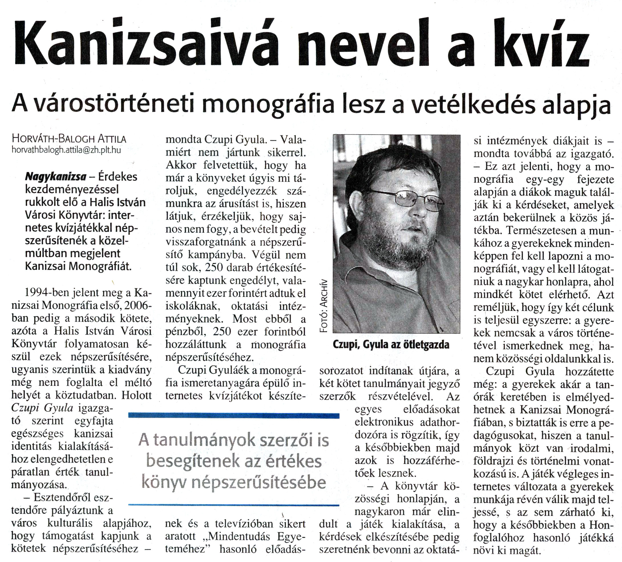 Nyilvános 1773 | 2569 | Zalai Hírlap 2008.09.29. 228. szám 7. oldal - Kanizsaivá nevel a kvíz | A cikk szövege: Kanizsaivá nevel a kvíz A várostörténeti monográfia lesz a vetélkedés alapja A tanulmányok szerzői is besegítenek az értékes könyv népszerűsítésébe Horváth-Balogh Attila horvathbalogh.attila@zh.plt.hu Nagykanizsa - Érdekes kezdeményezéssel rukkolt elő a Halis István Városi Könyvtár: internetes kvízjátékkal népszerűsítenék a közelmúltban megjelent Kanizsai Monográfiát. 1994-ben jelent meg a Kanizsai Monográfia első, 2006-ban pedig a második kötete, azóta a Halis István Városi Könyvtár folyamatosan készül ezek népszerűsítésére, ugyanis szerintük a kiadvány még nem foglalta el méltó helyét a köztudatban. Holott Czupi Gyula igazgató szerint egyfajta egészséges kanizsai identitás kialakításához elengedhetetlen e páratlan érték tanulmányozása. - Esztendőről esztendőre pályáztunk a város kulturális alapjához, hogy támogatást kapjunk a kötetek népszerűsítéséhez - mondta Czupi Gyula. - Valamiért nem jártunk sikerrel. Akkor felvetettük, hogy ha már a könyveket úgyis mi tároljuk, engedélyezzék számunkra az árusítást is, hiszen látjuk, érzékeljük, hogy sajnos nem fogy, a bevételt pedig visszaforgatnánk a népszerűsítő kampányba. Végül nem túl sok, 250 darab értékesítésére kaptunk engedélyt, valamennyit ezer forintért adtuk el iskoláknak, oktatási intézményeknek. Most ebből a pénzből, 250 ezer forintból hozzáláttunk a monográfia népszerűsítéséhez. Czupi Gyuláék a monográfia ismeretanyagára épülő internetes kvízjátékot készíte- nek és a televízióban sikert aratott „Mindentudás Egyeteméhez" hasonló előadás- Czupi, Gyula az ötletgazda sorozatot indítanak útjára, a két kötet tanulmányait jegyző szerzők részvételével. Az egyes előadásokat elektronikus adathordozóra is rögzítik, így a későbbiekben majd azok is hozzáférhetőek lesznek. - A könyvtár közösségi honlapján, a nagykaron már elindult a játék kialakítása, a kérdések elkészítésébe pedig szeretnénk bevonni az oktatá- si intézmények diákjait is -mondta továbbá az igazgató. - Ez azt jelenti, hogy a monográfia egy-egy fejezete alapján a diákok maguk találják ki a kérdéseket, amelyek aztán bekerülnek a közös játékba. Természetesen a munkához a gyerekeknek mindenképpen fel kell lapozni a monográfiát, vagy el kell látogatniuk a nagykar honlapra, ahol mindkét kötet elérhető. Azt reméljük, hogy így két célunk is teljesül egyszerre: a gyerekek nemcsak a város történetével ismerkednek meg, hanem közösségi oldalunkkal is. Czupi Gyula hozzátette még: a gyerekek akár a tanórák keretében is elmélyedhetnek a Kanizsai Monográfiában, s biztatták is erre a pedagógusokat, hiszen a tanulmányok közt van irodalmi, földrajzi és történelmi vonatkozású is. A játék végleges internetes változata a gyerekek munkája révén válik majd teljessé, s az sem zárható ki, hogy a későbbiekben a Honfoglalóhoz hasonló játékká növi ki magát. |