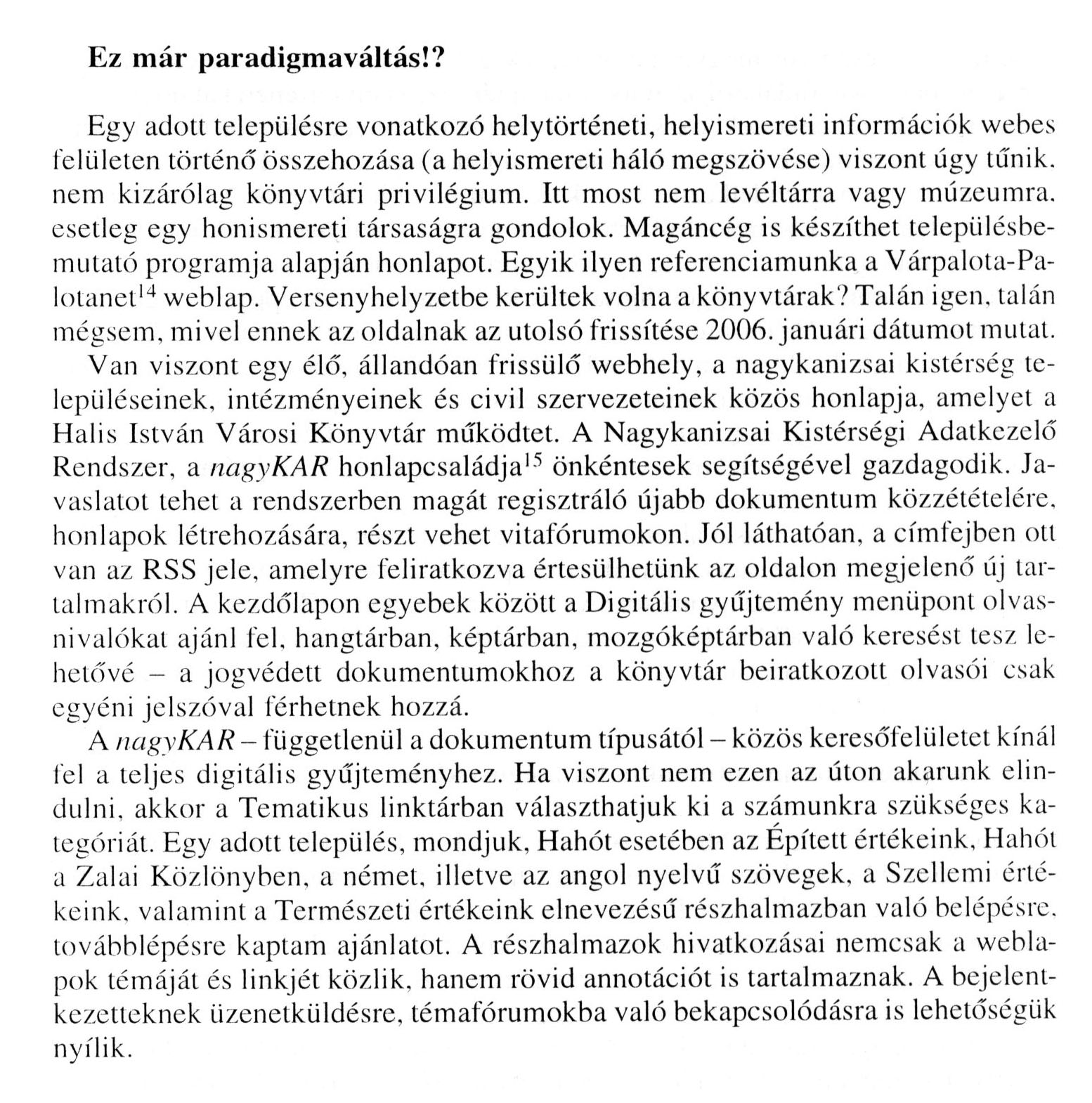 Nyilvános 1572 | 2940 | Könyv, Könyvtár, Könyvtáros 2008. október 24. oldal - Kégli Ferenc: Egy helyismeret-kutató barangolása Wégtelen Web Wilágban - részlet - 024. oldal | Cím: Könyv, Könyvtár, Könyvtáros Egyéb címadat; közreműködő: / Az Informatikai és Könyvtári Szövetség, a Magyar Könyvtárosok Egyesülete, a Nemzeti Kulturális Örökség Minisztériuma, az Országos Széchényi Könyvtár ; szerk. biz. elnök: Biczák Péter Budapest : Országos Széchényi Könyvtár Évek: 1951- Periodicitás: havonként ISSN: ISSN 1216-6804 A cikk szövege: Ez már paradigmaváltás!? Egy adott településre vonatkozó helytörténeti, helyismereti információk webes felületen történő összehozása (a helyismereti háló megszövése) viszont úgy tűnik, nem kizárólag könyvtári privilégium. Itt most nem levéltárra vagy múzeumra, esetleg egy honismereti társaságra gondolok. Magáncég is készíthet településbe-mutató programja alapján honlapot. Egyik ilyen referenciamunka a Várpalota-Pa-lotanet14 weblap. Versenyhelyzetbe kerültek volna a könyvtárak? Talán igen. talán mégsem, mivel ennek az oldalnak az utolsó frissítése 2006. januári dátumot mutat. Van viszont egy élő, állandóan frissülő webhely, a nagykanizsai kistérség településeinek, intézményeinek és civil szervezeteinek közös honlapja, amelyet a Halis István Városi Könyvtár működtet. A Nagykanizsai Kistérségi Adatkezelő Rendszer, a nagyKAR honlapcsaládja15 önkéntesek segítségével gazdagodik. Javaslatot tehet a rendszerben magát regisztráló újabb dokumentum közzétételére, honlapok létrehozására, részt vehet vitafórumokon. Jól láthatóan, a címfejben ott van az RSS jele, amelyre feliratkozva értesülhetünk az oldalon megjelenő új tartalmakról. A kezdőlapon egyebek között a Digitális gyűjtemény menüpont olvasnivalókat ajánl fel, hangtárban, képtárban, mozgóképtárban való keresést tesz lehetővé - a jogvédett dokumentumokhoz a könyvtár beiratkozott olvasói csak egyéni jelszóval férhetnek hozzá. A nagyKAR - függetlenül a dokumentum típusától - közös keresőfelületet kínál fel a teljes digitális gyűjteményhez. Ha viszont nem ezen az úton akarunk elindulni, akkor a Tematikus linktárban választhatjuk ki a számunkra szükséges kategóriát. Egy adott település, mondjuk. Hahót esetében az Épített értékeink, Hahót a Zalai Közlönyben, a német, illetve az angol nyelvű szövegek, a Szellemi értékeink, valamint a Természeti értékeink elnevezésű részhalmazban való belépésre, továbblépésre kaptam ajánlatot. A részhalmazok hivatkozásai nemcsak a weblapok témáját és linkjét közlik, hanem rövid annotációt is tartalmaznak. A bejelentkezetteknek üzenetküldésre, témafórumokba való bekapcsolódásra is lehetőségük nyílik. |