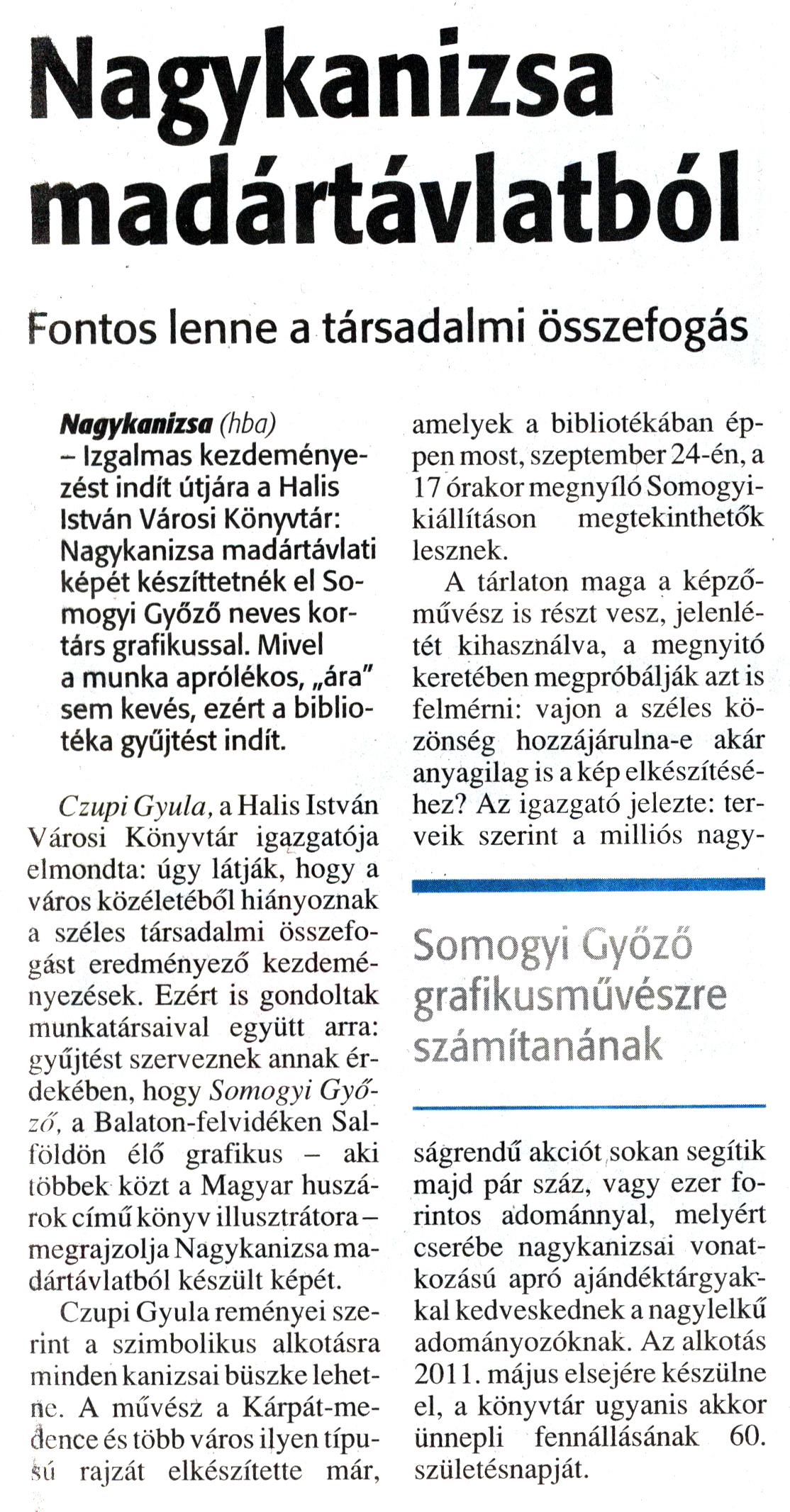 Nyilvános 1531 | 1787 | Zalai Hírlap 2009. szeptember 15. 216. szám 7. oldal - Nagykanizsa madártávlatból | A cikk szövege: Nagykanizsa madártávlatból Fontos lenne a társadalmi összefogás Somogyi Győző grafikusművészre számítanának Nagykanizsa (hba) - Izgalmas kezdeményezést indít útjára a Halis István Városi Könyvtár: Nagykanizsa madártávlati képét készíttetnék el Somogyi Győző neves kortárs grafikussal. Mivel a munka aprólékos, „ára" sem kevés, ezért a bibliotéka gyűjtést indít. Czupi Gyula, a Halis István Városi Könyvtár igazgatója elmondta: úgy látják, hogy a város közéletéből hiányoznak a széles társadalmi összefogást eredményező kezdeményezések. Ezért is gondoltak munkatársaival együtt arra: gyűjtést szerveznek annak érdekében, hogy Somogyi Győző, a Balaton-felvidéken Salföldön élő grafikus - aki többek közt a Magyar huszárok című könyv illusztrátora - megrajzolja Nagykanizsa madártávlatból készült képét. Czupi Gyula reményei szerint a szimbolikus alkotásra minden kanizsai büszke lehetne. A művész a Kárpát-medence és több város ilyen típusú rajzát elkészítette már, amelyek a bibliotékában éppen most, szeptember 24-én, a 17 órakor megnyíló Somogyikiállításon megtekinthetők lesznek. A tárlaton maga a képzőművész is részt vesz, jelenlétét kihasználva, a megnyitó keretében megpróbálják azt is felmérni: vajon a széles közönség hozzájárulna-e akár anyagilag is a kép elkészítéséhez? Az igazgató jelezte: terveik szerint a milliós nagyságrendű akciót sokan segítik majd pár száz, vagy ezer forintos adománnyal, melyért cserébe nagykanizsai vonatkozású apró ajándéktárgyakkal kedveskednek a nagylelkű adományozóknak. Az alkotás 2011. május elsejére készülne el, a könyvtár ugyanis akkor ünnepli fennállásának 60. születésnapját. |