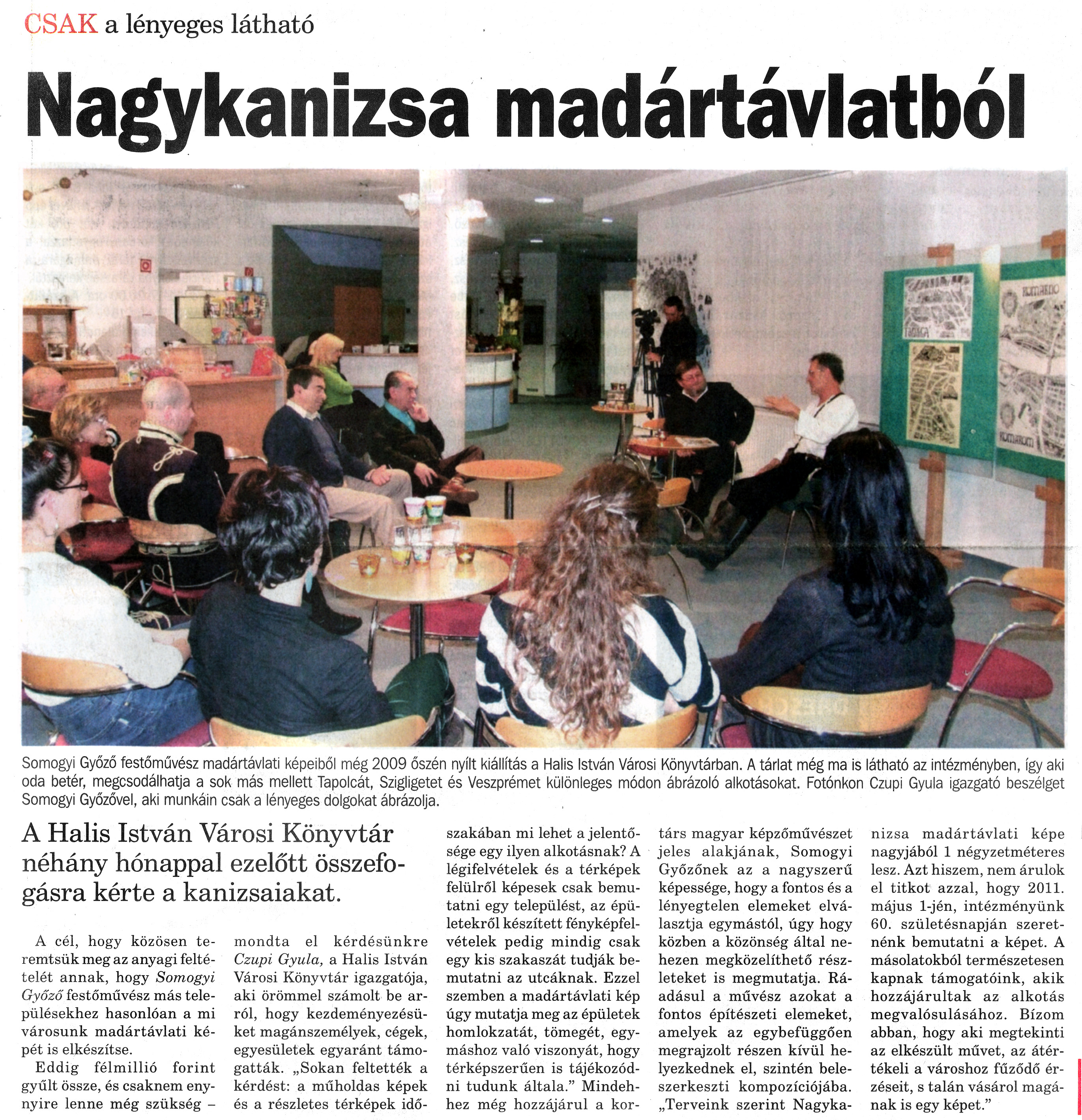 Nyilvános 1610 | 2341 | Nagykanizsai Maraton 2010. március 5. 9. szám 1. oldal - Nagykanizsa madártávlatból | A cikk szövege: CSAK a lényeges látható Nagykanizsa madártávlatból Somogyi Győző festőművész madártávlati képeiből még 2009 őszén nyílt kiállítás a Halis István Városi Könyvtárban. A tárlat még ma is látható az intézményben, így aki oda betér, megcsodálhatja a sok más mellett Tapolcát, Szigligetet és Veszprémet különleges módon ábrázoló alkotásokat. Fotónkon Czupi Gyula igazgató beszélget Somogyi Győzővel, aki munkáin csak a lényeges dolgokat ábrázolja. A Halis István Városi Könyvtár néhány hónappal ezelőtt összefogásra kérte a kanizsaiakat. A cél, hogy közösen teremtsük meg az anyagi feltételét annak, hogy Somogyi Győző festőművész más településekhez hasonlóan a mi városunk madártávlati képét is elkészítse. Eddig félmillió forint gyűlt össze, és csaknem ennyire lenne még szükség - mondta el kérdésünkre Czupi Gyula, a Halis István Városi Könyvtár igazgatója, aki örömmel számolt be arról, hogy kezdeményezésüket magánszemélyek, cégek, egyesületek egyaránt támogatták. „Sokan feltették a kérdést: a műholdas képek és a részletes térképek időszakában mi lehet a jelentősége egy ilyen alkotásnak? A légifelvételek és a térképek felülről képesek csak bemutatni egy települést, az épületekről készített fényképfelvételek pedig mindig csak egy kis szakaszát tudják bemutatni az utcáknak. Ezzel szemben a madártávlati kép úgy mutatja meg az épületek homlokzatát, tömegét, egymáshoz való viszonyát, hogy térképszerűen is tájékozódni tudunk általa." Mindehhez még hozzájárul a kortárs magyar képzőművészet jeles alakjának, Somogyi Győzőnek az a nagyszerű képessége, hogy a fontos és a lényegtelen elemeket elválasztja egymástól, úgy hogy közben a közönség által nehezen megközelíthető részleteket is megmutatja. Ráadásul a művész azokat a fontos építészeti elemeket, amelyek az egybefüggően megrajzolt részen kívül helyezkednek el, szintén beleszerkeszti kompozíciójába. „Terveink szerint Nagykanizsa madártávlati képe nagyjából 1 négyzetméteres lesz. Azt hiszem, nem árulok el titkot azzal, hogy 2011. május 1-jén, intézményünk 60. születésnapján szeretnénk bemutatni a képet. A másolatokból természetesen kapnak támogatóink, akik hozzájárultak az alkotás megvalósulásához. Bízom abban, hogy aki megtekinti az elkészült művet, az átértékeli a városhoz fűződő érzéseit, s talán vásárol magának is egy képet." |