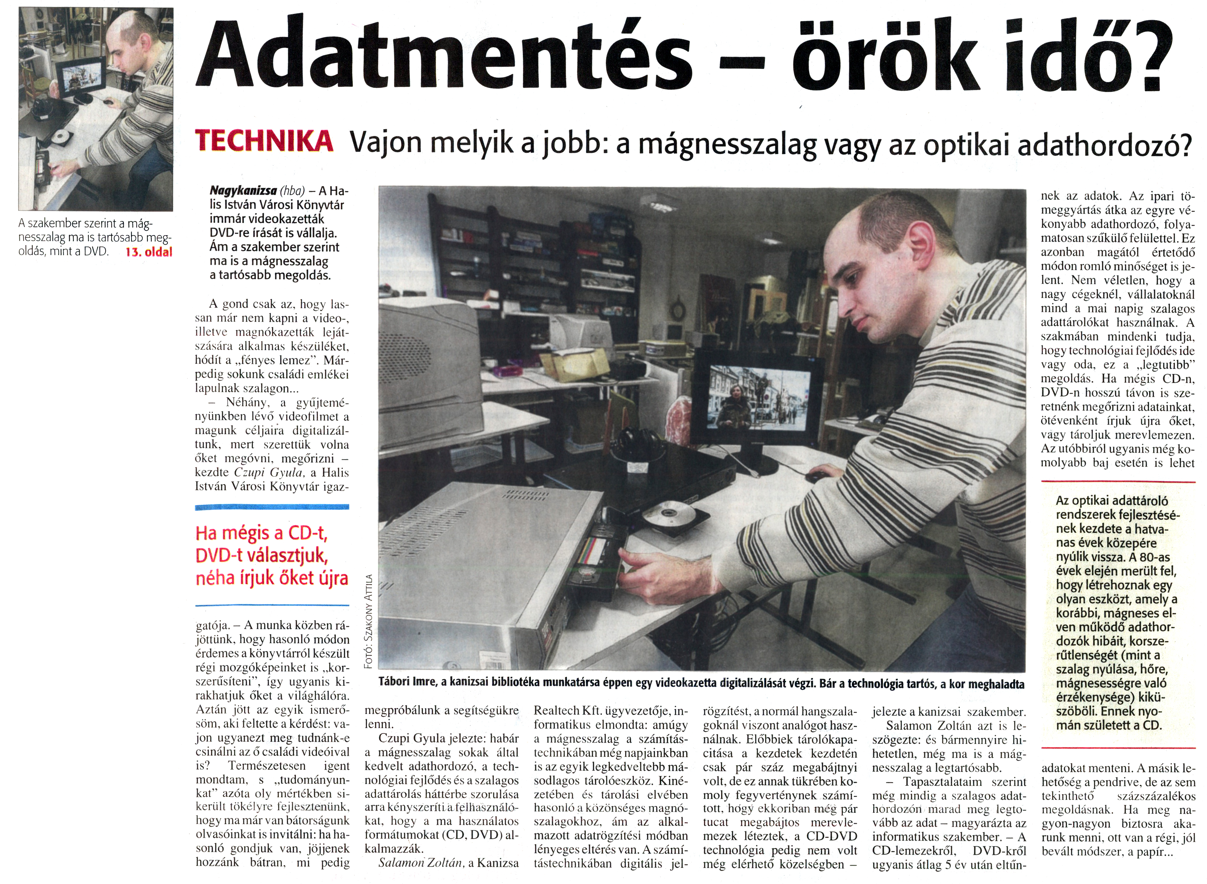 Nyilvános 1573 | 2035 | Zalai Hírlap 2010. március 18. 64. szám 13. oldal - Adatmentés - örök idő | A cikk szövege: Adatmentés - örök idő? TECHNIKA Vajon melyik a jobb: a mágnesszalag vagy az optikai adathordozó? Tábori Imre, a kanizsai bibliotéka munkatársa éppen egy videokazetta digitalizálását végzi. Bár a technológia tartós, a kor meghaladta A szakember szerint a mágnesszalag ma is tartósabb megoldás, mint a DVD. 13. oldal Nagykanizsa (hba) - A Ha-lis István Városi Könyvtár immár videokazetták DVD-re írását is vállalja. Ám a szakember szerint ma is a mágnesszalag a tartósabb megoldás. A gond csak az, hogy lassan már nem kapni a videó-, illetve magnókazetták lejátszására alkalmas készüléket, hódít a „fényes lemez". Márpedig sokunk családi emlékei lapulnak szalagon... - Néhány, a gyűjteményünkben lévő videofilmet a magunk céljaira digitalizáltunk, mert szerettük volna őket megóvni, megőrizni -kezdte Czupi Gyula, a Halis István Városi Könyvtár igaz- Ha mégis a CD-t, DVD-t választjuk, néha írjuk őket újra gatója. - A munka közben rájöttünk, hogy hasonló módon érdemes a könyvtárról készült régi mozgóképeinket is „korszerűsíteni", így ugyanis kirakhatjuk őket a világhálóra. Aztán jött az egyik ismerősöm, aki feltette a kérdést: vajon ugyanezt meg tudnánk-e csinálni az ő családi videóival is? Természetesen igent mondtam, s „tudományunkat" azóta oly mértékben sikerült tökélyre fejlesztenünk, hogy ma már van bátorságunk olvasóinkat is invitálni: ha hasonló gondjuk van, jöjjenek hozzánk bátran, mi pedig megpróbálunk a segítségükre lenni. Czupi Gyula jelezte: habár a mágnesszalag sokak által kedvelt adathordozó, a technológiai fejlődés és a szalagos adattárolás háttérbe szorulása arra kényszeríti a felhasználókat, hogy a ma használatos formátumokat (CD. DVD) alkalmazzák. Salamon Zoltán, a Kanizsa Realtech Kft. ügyvezetője, informatikus elmondta: amúgy a mágnesszalag a számítástechnikában még napjainkban is az egyik legkedveltebb másodlagos tárolóeszköz. Kinézetében és tárolási elvében hasonló a közönséges magnószalagokhoz, ám az alkalmazott adatrögzítési módban lényeges eltérés van. A számítástechnikában digitális jel- rögzítést, a normál hangszalagoknál viszont analógot használnak. Előbbiek tárolókapacitása a kezdetek kezdetén csak pár száz megabájtnyi volt, de ez annak tükrében komoly fegyverténynek számított, hogy ekkoriban még pár tucat megabájtos merevlemezek léteztek, a CD-DVD technológia pedig nem volt még elérhető közelségben - jelezte a kanizsai szakember. Salamon Zoltán azt is leszögezte: és bármennyire hihetetlen, még ma is a mágnesszalag a legtartósabb. - Tapasztalataim szerint még mindig a szalagos adathordozón marad meg legtovább az adat - magyarázta az informatikus szakember. - A CD-lemezekről, DVD-kről ugyanis átlag 5 év után eltűn- nek az adatok. Az ipari tömeggyártás átka az egyre vékonyabb adathordozó, folyamatosan szűkülő felülettel. Ez azonban magától értetődő módon romló minőséget is jelent. Nem véletlen, hogy a nagy cégeknél, vállalatoknál mind a mai napig szalagos adattárolókat használnak. A szakmában mindenki tudja, hogy technológiai fejlődés ide vagy oda, ez a „legtutibb" megoldás. Ha mégis CD-n, DVD-n hosszú távon is szeretnénk megőrizni adatainkat, ötévenként írjuk újra őket, vagy tároljuk merevlemezen. Az utóbbiról ugyanis még komolyabb baj esetén is lehet Az optikai adattároló rendszerek fejlesztésének kezdete a hatvanas évek közepére nyúlik vissza. A 80-as évek elején merült fel, hogy létrehoznak egy olyan eszközt, amely a korábbi, mágneses elven működő adathordozók hibáit, korszerűtlenségét (mint a szalag nyúlása, hőre, mágnesességre való érzékenysége) kiküszöböli. Ennek nyomán született a CD. adatokat menteni. A másik lehetőség a pendrive, de az sem tekinthető százszázalékos megoldásnak. Ha meg nagyon-nagyon biztosra akarunk menni, ott van a régi, jól bevált módszer, a papír... |
