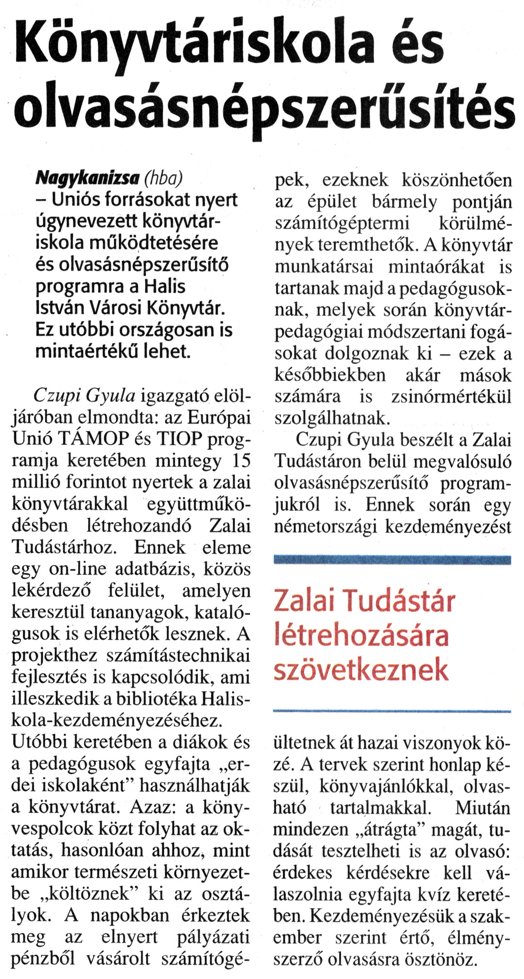 Nyilvános 1518 | 1926 | Zalai Hírlap 2010. április 1. 76. szám 4. oldal - Könyvtáriskola és olvasásnépszerűsítés | A cikk szövege: Könyvtáriskola és olvasásnépszerűsítés Zalai Tudástár létrehozására szövetkeznek Nagykanizsa (hba) - Uniós forrásokat nyert úgynevezett könyvtáriskola működtetésére és olvasásnépszerűsítő programra a Halis István Városi Könyvtár. Ez utóbbi országosan is mintaértékű lehet. Czupi Gyula igazgató elöljáróban elmondta: az Európai Unió TÁMOP és TIOP programja keretében mintegy 15 millió forintot nyertek a zalai könyvtárakkal együttműködésben létrehozandó Zalai Tudástárhoz. Ennek eleme egy on-line adatbázis, közös lekérdező felület, amelyen keresztül tananyagok, katalógusok is elérhetők lesznek. A projekthez számítástechnikai fejlesztés is kapcsolódik, ami illeszkedik a bibliotéka Haliskola-kezdeményezéséhez. Utóbbi keretében a diákok és a pedagógusok egyfajta „erdei iskolaként" használhatják a könyvtárat. Azaz: a könyvespolcok közt folyhat az oktatás, hasonlóan ahhoz, mint amikor természeti környezetbe „költöznek" ki az osztályok. A napokban érkeztek meg az elnyert pályázati pénzből vásárolt számítógépek, ezeknek köszönhetően az épület bármely pontján számítógéptermi körülmények teremthetők. A könyvtár munkatársai mintaórákat is tartanak majd a pedagógusoknak, melyek során könyvtárpedagógiai módszertani fogásokat dolgoznak ki - ezek a későbbiekben akár mások számára is zsinórmértékül szolgálhatnak. Czupi Gyula beszélt a Zalai Tudástáron belül megvalósuló olvasásnépszerűsítő programjukról is. Ennek során egy németországi kezdeményezést ültetnek át hazai viszonyok közé. A tervek szerint honlap készül, könyvajánlókkal, olvasható tartalmakkal. Miután mindezen „átrágta" magát, tudását tesztelheti is az olvasó: érdekes kérdésekre kell válaszolnia egyfajta kvíz keretében. Kezdeményezésük a szakember szerint értő, élményszerző olvasásra ösztönöz. |