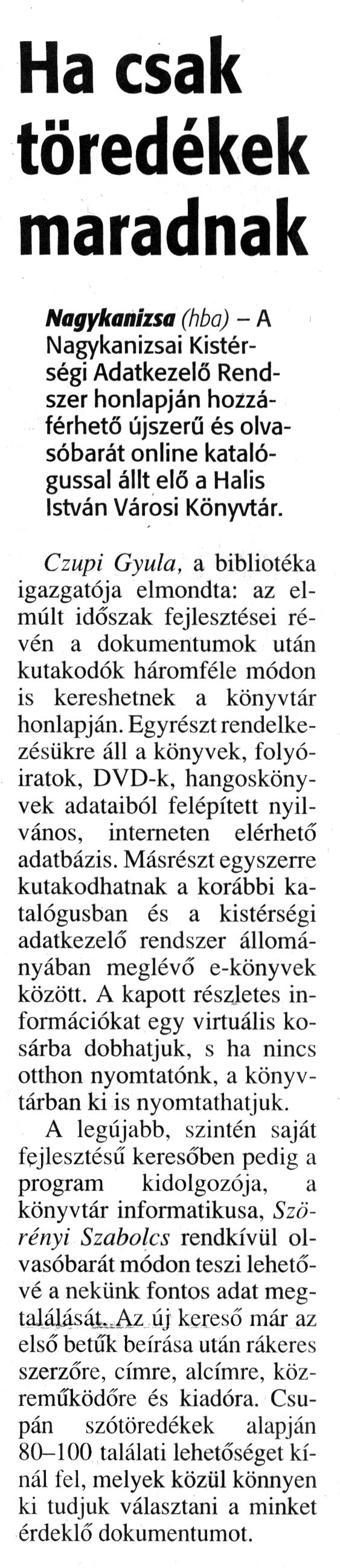 Nyilvános 1532 | 1845 | Zalai Hírlap 2010. május 20. 116. szám 15. oldal - Ha csak töredékek maradnak | A cikk szövege: Ha csak töredékek maradnak Nagykanizsa (hba) - A Nagykanizsai Kistérségi Adatkezelő Rendszer honlapján hozzáférhető újszerű és olvasóbarát online katalógussal állt elő a Halis István Városi Könyvtár. Czupi Gyula, a bibliotéka igazgatója elmondta: az elmúlt időszak fejlesztései révén a dokumentumok után kutakodók háromféle módon is kereshetnek a könyvtár honlapján. Egyrészt rendelkezésükre áll a könyvek, folyóiratok, DVD-k, hangoskönyvek adataiból felépített nyilvános, interneten elérhető adatbázis. Másrészt egyszerre kutakodhatnak a korábbi katalógusban és a kistérségi adatkezelő rendszer állományában meglévő e-könyvek között. A kapott részletes információkat egy virtuális kosárba dobhatjuk, s ha nincs otthon nyomtatónk, a könyvtárban ki is nyomtathatjuk. A legújabb, szintén saját fejlesztésű keresőben pedig a program kidolgozója, a könyvtár informatikusa, Szörényi Szabolcs rendkívül olvasóbarát módon teszi lehetővé a nekünk fontos adat megtalálását. Az új kereső már az első betűk beírása után rákeres szerzőre, címre, alcímre, közreműködőre és kiadóra. Csupán szótöredékek alapján 80-100 találati lehetőséget kínál fel, melyek közül könnyen ki tudjuk választani a minket érdeklő dokumentumot. |