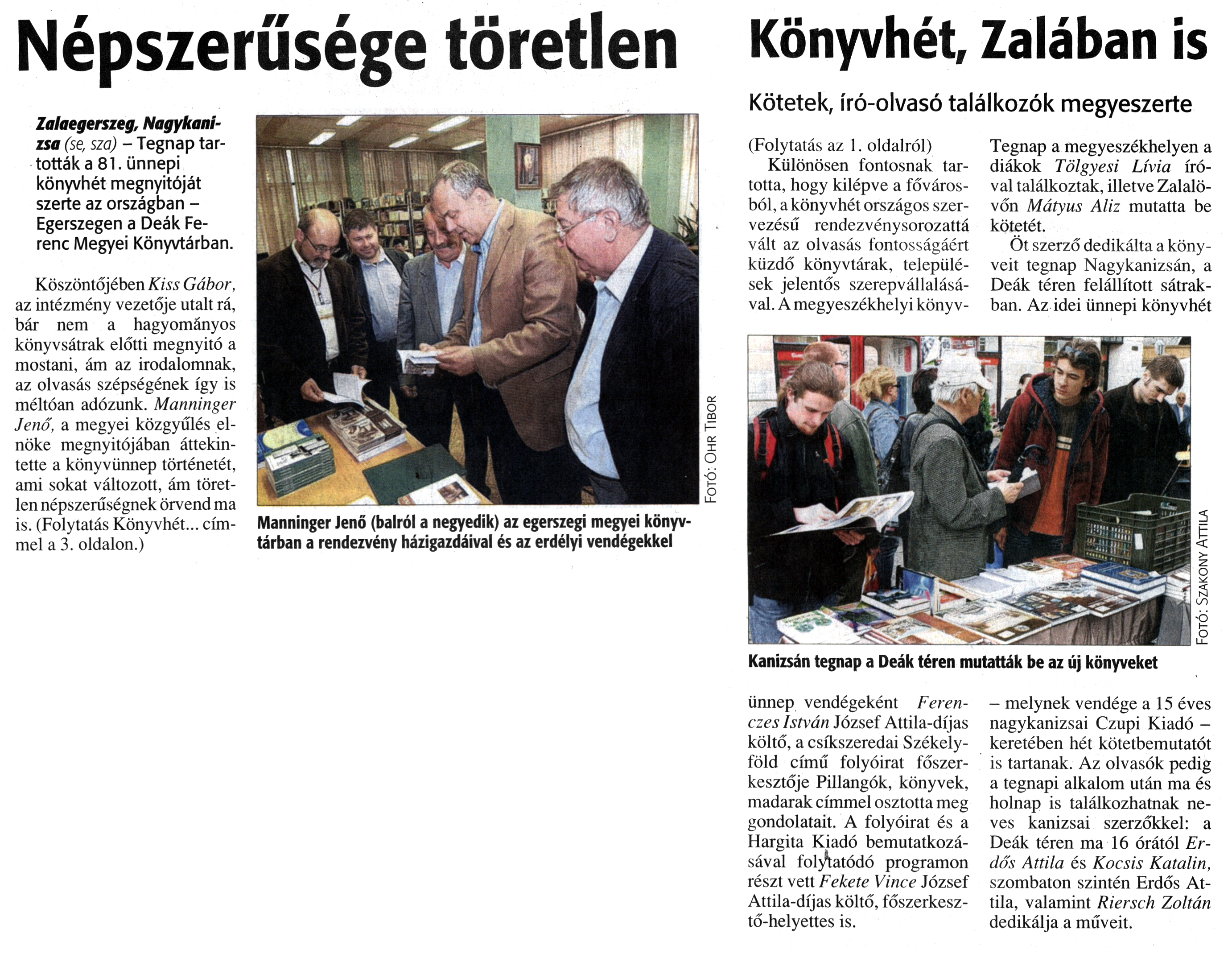 Nyilvános 1516 | 1956 | Zalai Hírlap 2010. június 4. 128. szám 1, 3. oldal - Népszerűsége töretlen - Könyvhét, Zalában is | A cikk szövege: Népszerűsége töretlen Zalaegerszeg, Nagykanizsa (se, sza) - Tegnap tartották a 81. ünnepi könyvhét megnyitóját szerte az országban -Egerszegen a Deák Ferenc Megyei Könyvtárban. Köszöntőjében Kiss Gábor, az intézmény vezetője utalt rá, bár nem a hagyományos könyvsátrak előtti megnyitó a mostani, ám az irodalomnak, az olvasás szépségének így is méltóan adózunk. Manninger Jenő, a megyei közgyűlés elnöke megnyitójában áttekintette a könyvünnep történetét, ami sokat változott, ám töretlen népszerűségnek örvend ma is. (Folytatás Könyvhét... címmel a 3. oldalon.) Manninger Jenő (balról a negyedik) az egerszegi megyei könyvtárban a rendezvény házigazdáival és az erdélyi vendégekkel Könyvhét, Zalában is Kötetek, író-olvasó találkozók megyeszerte (Folytatás az 1. oldalról) Különösen fontosnak tartotta, hogy kilépve a fővárosból, a könyvhét országos szervezésű rendezvénysorozattá vált az olvasás fontosságáért küzdő könyvtárak, települések jelentős szerepvállalásával. A megyeszékhelyi könyv- ünnep vendégeként Ferenczes István József Attila-díjas költő, a csíkszeredai Székelyföld című folyóirat főszerkesztője Pillangók, könyvek, madarak címmel osztotta meg gondolatait. A folyóirat és a Hargita Kiadó bemutatkozásával folytatódó programon részt vett Fekete Vince József Attila-díjas költő, főszerkesztő-helyettes is. Tegnap a megyeszékhelyen a diákok Tölgyesi Lívia íróval találkoztak, illetve Zalalövőn Mátyus Aliz mutatta be kötetét. Öt szerző dedikálta a könyveit tegnap Nagykanizsán, a Deák téren felállított sátrakban. Az idei ünnepi könyvhét — melynek vendége a 15 éves nagykanizsai Czupi Kiadó -keretében hét kötetbemutatót is tartanak. Az olvasók pedig a tegnapi alkalom után ma és holnap is találkozhatnak neves kanizsai szerzőkkel: a Deák téren ma 16 órától Erdős Attila és Kocsis Katalin, szombaton szintén Erdős Attila, valamint Riersch Zoltán dedikálja a műveit. Kanizsán tegnap a Deák téren mutatták be az új könyveket |