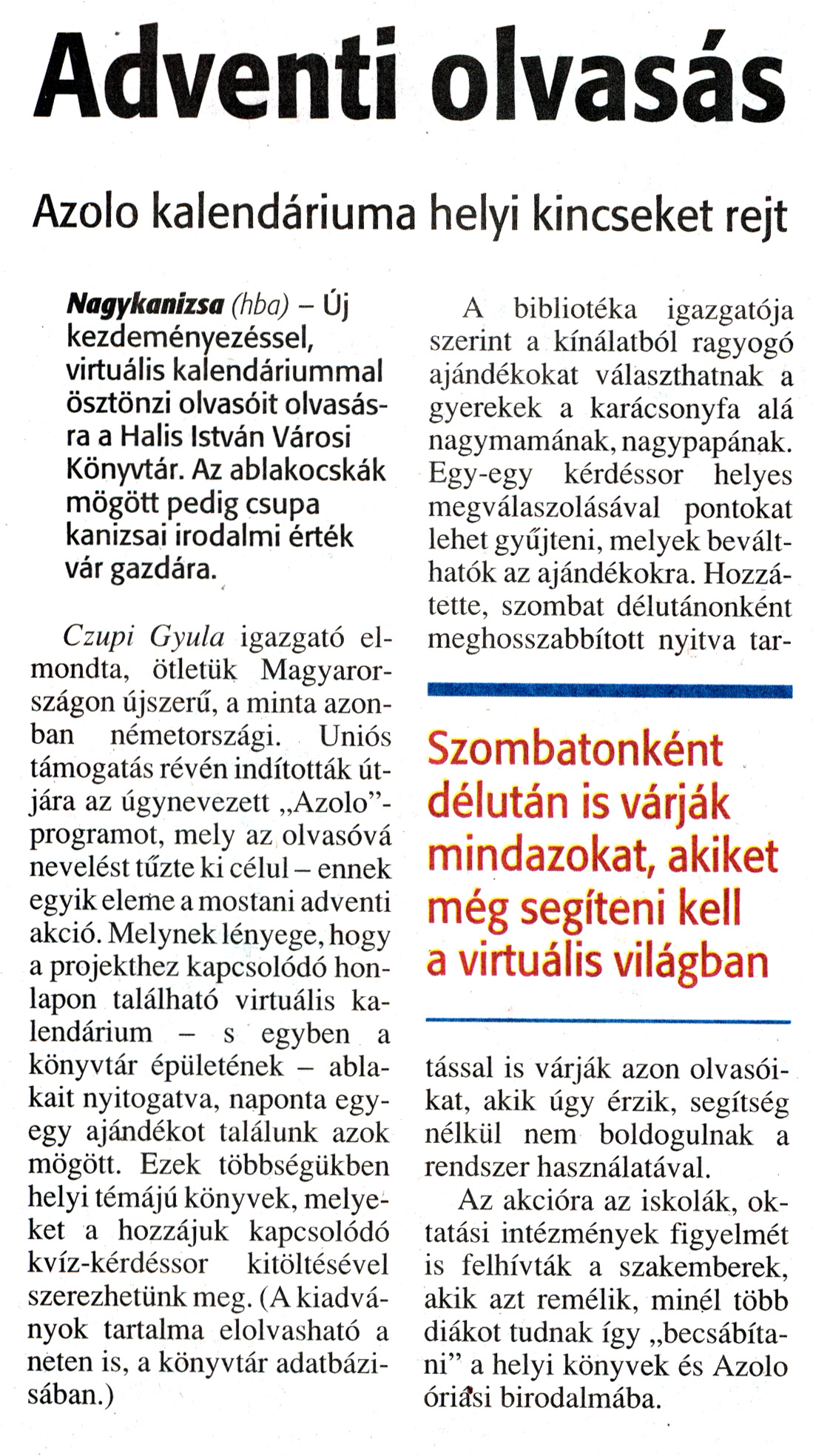 Nyilvános 2267 | 5199 | Zalai Hírlap 2010. december 7. 284. szám 11. oldal - Adventi olvasás | A cikk szövege: Adventi olvasás Azolo kalendáriuma helyi kincseket rejt Nagykanizsa (hba) - Új kezdeményezéssel, virtuális kalendáriummal ösztönzi olvasóit olvasásra a Halis István Városi Könyvtár. Az ablakocskák mögött pedig csupa kanizsai irodalmi érték vár gazdára. Czupi Gyula igazgató elmondta, ötletük Magyarországon újszerű, a minta azonban németországi. Uniós támogatás révén indították útjára az úgynevezett „Azolo"-programot, mely az olvasóvá nevelést tűzte ki célul - ennek egyik eleme a mostani adventi akció. Melynek lényege, hogy a projekthez kapcsolódó honlapon található virtuális kalendárium - s egyben a könyvtár épületének - ablakait nyitogatva, naponta egy-egy ajándékot találunk azok mögött. Ezek többségükben helyi témájú könyvek, melyeket a hozzájuk kapcsolódó kvíz-kérdéssor kitöltésével szerezhetünk meg. (A kiadványok tartalma elolvasható a neten is, a könyvtár adatbázisában.) A bibliotéka igazgatója szerint a kínálatból ragyogó ajándékokat választhatnak a gyerekek a karácsonyfa alá nagymamának, nagypapának. Egy-egy kérdéssor helyes megválaszolásával pontokat lehet gyűjteni, melyek beválthatók az ajándékokra. Hozzátette, szombat délutánonként meghosszabbított nyitva tartással is várják azon olvasóikat, akik úgy érzik, segítség nélkül nem boldogulnak a rendszer használatával. Az akcióra az iskolák, oktatási intézmények figyelmét is felhívták a szakemberek, akik azt remélik, minél több diákot tudnak így „becsábítani" a helyi könyvek és Azolo óriási birodalmába. Szombatonként délután is várják mindazokat, akiket még segíteni kell a virtuális világban |