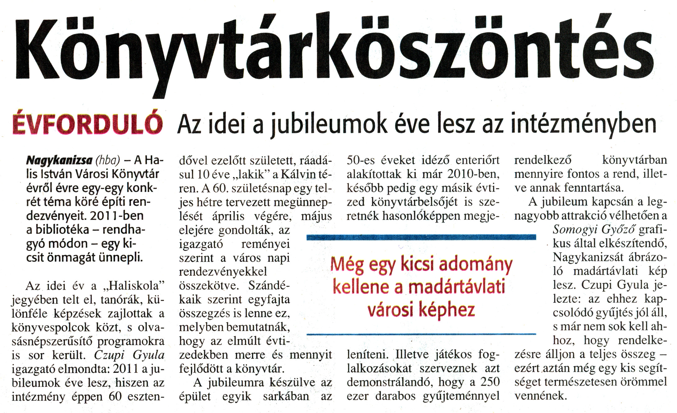 Nyilvános 2328 | 6069 | Zalai Hírlap 2011. január 3. 1. szám 7. oldal - Könyvtárköszöntés | A cikk szövege: Könyvtárköszöntés ÉVFORDULÓ Az idei a jubileumok éve lesz az intézményben Még egy kicsi adomány kellene a madártávlati városi képhez Nagykanizsa (hba) - A Halis István Városi Könyvtár évről évre egy-egy konkrét téma köré építi rendezvényeit. 2011-ben a bibliotéka - rendhagyó módon - egy kicsit önmagát ünnepli. Az idei év a „Haliskola" jegyében telt el, tanórák, különféle képzések zajlottak a könyvespolcok közt, s olvasásnépszerűsítő programokra is sor került. Czupi Gyula igazgató elmondta: 2011 a jubileumok éve lesz, hiszen az intézmény éppen 60 esztendővel ezelőtt született, ráadásul 10 éve „lakik" a Kálvin téren. A 60. születésnap egy teljes hétre tervezett megünneplését április végére, május elejére gondolták, az igazgató reményei szerint a város napi rendezvényekkel összekötve. Szándékaik szerint egyfajta összegzés is lenne ez, melyben bemutatnák, hogy az elmúlt évtizedekben merre és mennyit fejlődött a könyvtár. A jubileumra készülve az épület egyik sarkában az 50-es éveket idéző enteriőrt alakítottak ki már 2010-ben, később pedig egy másik évtized könyvtárbelsőjét is szeretnék hasonlóképpen megjeleníteni. Illetve játékos foglalkozásokat szerveznek azt demonstrálandó, hogy a 250 ezer darabos gyűjteménnyel rendelkező könyvtárban mennyire fontos a rend, illetve annak fenntartása. A jubileum kapcsán a legnagyobb attrakció vélhetően a Somogyi Győző grafikus által elkészítendő, Nagykanizsát ábrázoló madártávlati kép lesz. Czupi Gyula jelezte: az ehhez kapcsolódó gyűjtés jól áll, s már nem sok kell ahhoz, hogy rendelkezésre álljon a teljes összeg - ezért aztán még egy kis segítséget természetesen örömmel vennének. |