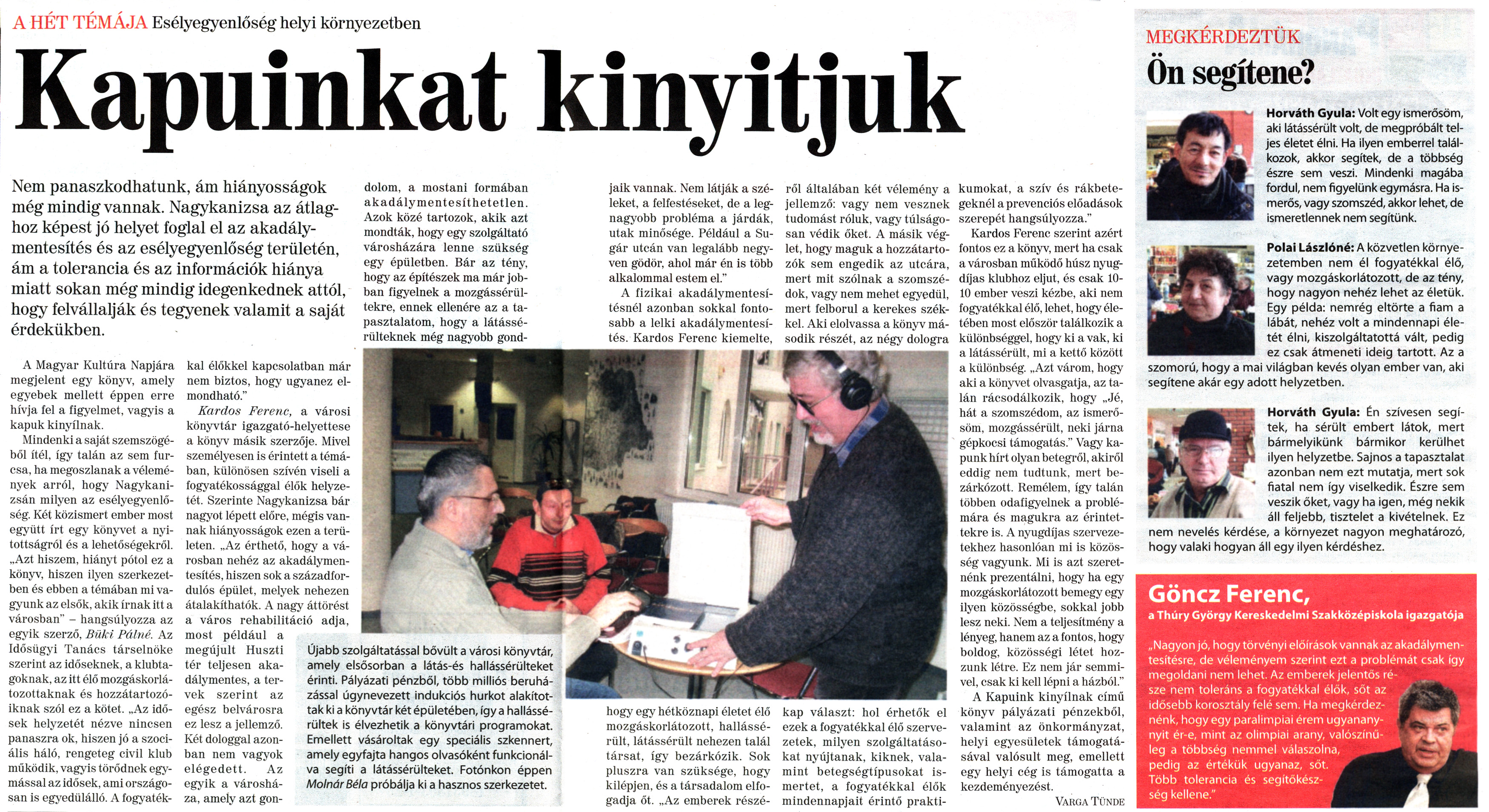 Nyilvános 2326 | 7017 | Nagykanizsai Maraton 2011. január 21. 3. szám 6-7. oldal - Kapuinkat kinyitjuk | A cikk szövege: A HÉT TÉMÁJA Esélyegyenlőség helyi környezetben Kapuinkat kinyitjuk Nem panaszkodhatunk, ám hiányosságok még mindig vannak. Nagykanizsa az átlaghoz képest jó helyet foglal el az akadálymentesítés és az esélyegyenlőség területén, ám a tolerancia és az információk hiánya miatt sokan még mindig idegenkednek attól, hogy felvállalják és tegyenek valamit a saját érdekükben. A Magyar Kultúra Napjára megjelent egy könyv, amely egyebek mellett éppen erre hívja fel a figyelmet, vagyis a kapuk kinyílnak. Mindenki a saját szemszögéből ítél, így talán az sem furcsa, ha megoszlanak a vélemények arról, hogy Nagykanizsán milyen az esélyegyenlőség. Két közismert ember most együtt írt egy könyvet a nyitottságról és a lehetőségekről. „Azt hiszem, hiányt pótol ez a könyv, hiszen ilyen szerkezetben és ebben a témában mi vagyunk az elsők, akik írnak itt a városban" - hangsúlyozza az egyik szerző, Büki Pálné. Az Idősügyi Tanács társelnöke szerint az időseknek, a klubtagoknak, az itt élő mozgáskorlátozottaknak és hozzátartozóiknak szól ez a kötet. „Az idősek helyzetét nézve nincsen panaszra ok. hiszen jó a szociális háló, rengeteg civil klub működik, vagyis törődnek egymással az idősek, ami országosan is egyedülálló. A fogyatékkal élőkkel kapcsolatban már nem biztos, hogy ugyanez elmondható." Kardos Ferenc, a városi könyvtár igazgató-helyettese a könyv másik szerzője. Mivel személyesen is érintett a témában, különösen szívén viseli a fogyatékossággal élők helyzetét. Szerinte Nagykanizsa bár nagyot lépett előre, mégis vannak hiányosságok ezen a területen. „Az érthető, hogy a városban nehéz az akadálymentesítés, hiszen sok a századfordulós épület, melyek nehezen átalakíthatók. A nagy áttörést a város rehabilitáció adja, most például a megújult Huszti tér teljesen akadálymentes, a tervek szerint az egész belvárosra ez lesz a jellemző. Két dologgal azonban nem vagyok elégedett. Az egyik a városháza, amely azt gondolom, a mostani formában akadály mentesít hetet len. Azok közé tartozok, akik azt mondták, hogy egy szolgáltató városházára lenne szükség egy épületben. Bár az tény, hogy az építészek ma már jobban figyelnek a mozgássérültekre, ennek ellenére az a tapasztalatom, hogy a látássérülteknek még nagyobb gondjaik vannak. Nem látják a széleket, a felfestéseket, de a legnagyobb probléma a járdák, utak minősége. Például a Sugár utcán van legalább negyven gödör, ahol már én is több alkalommal estem el." A fizikai akadálymentesítésnél azonban sokkal fontosabb a lelki akadálymentesítés. Kardos Ferenc kiemelte, hogy egy hétköznapi életet élő mozgáskorlátozott, hallássérült, látássérült nehezen talál társat, így bezárkózik. Sok pluszra van szüksége, hogy kilépjen, és a társadalom elfogadja őt. „Az emberek részéről általában két vélemény a jellemző: vagy nem vesznek tudomást róluk, vagy túlságosan védik őket. A másik véglet, hogy maguk a hozzátartozók sem engedik az utcára, mert mit szólnak a szomszédok, vagy nem mehet egyedül, mert felborul a kerekes székkel. Aki elolvassa a könyv második részét, az négy dologra kap választ: hol érhetők el ezek a fogyatékkal élő szervezetek, milyen szolgáltatásokat nyújtanak, kiknek, valamint betegségtípusokat ismertet, a fogyatékkal élők mindennapjait érintő praktikumokat, a szív és rákbetegeknél a prevenciós előadások szerepét hangsúlyozza." Kardos Ferenc szerint azért fontos ez a könyv, mert ha csak a városban működő húsz nyugdíjas klubhoz eljut, és csak 10-10 ember veszi kézbe, aki nem fogyatékkal élő, lehet, hogy életében most először találkozik a különbséggel, hogy ki a vak, ki a látássérült, mi a kettő között a különbség. „Azt várom, hogy aki a könyvet olvasgatja, az talán rácsodálkozik, hogy „Jé, hát a szomszédom, az ismerősöm, mozgássérült, neki járna gépkocsi támogatás." Vagy kapunk hírt olyan betegről, akiről eddig nem tudtunk, mert bezárkózott. Remélem, így talán többen odafigyelnek a problémára és magukra az érintettekre is. A nyugdíjas szervezetekhez hasonlóan mi is közösség vagyunk. Mi is azt szeretnénk prezentálni, hogy ha egy mozgáskorlátozott bemegy egy ilyen közösségbe, sokkal jobb lesz neki. Nem a teljesítmény a lényeg, hanem az a fontos, hogy boldog, közösségi létet hozzunk létre. Ez nem jár semmivel, csak ki kell lépni a házból." A Kapuink kinyílnak című könyv pályázati pénzekből, valamint az önkormányzat, helyi egyesületek támogatásával valósult meg, emellett egy helyi cég is támogatta a kezdeményezést. Varga Tünde Újabb szolgáltatással bővült a városi könyvtár, amely elsősorban a látás-és hallássérülteket érinti. Pályázati pénzből, több milliós beruházással úgynevezett indukciós hurkot alakítottak kl a könyvtár két épületében, így a hallássérültek is élvezhetik a könyvtári programokat. Emellett vásároltak egy speciális szkennert, amely egyfajta hangos olvasóként funkcionálva segíti a látássérülteket. Fotónkon éppen Molnár Béla próbálja kl a hasznos szerkezetet. MEGKÉRDEZTÜK Ön segítene? Horváth Gyula: Volt egy Ismerősöm, aki látássérült volt, de megpróbált teljes életet élni. Ha ilyen emberrel találkozok, akkor segítek, de a többség észre sem veszi. Mindenki magába fordul, nem figyelünk egymásra. Ha ismerős, vagy szomszéd, akkor lehet, de ismeretlennek nem segítünk. Polai Lászlóné: A közvetlen környezetemben nem él fogyatékkal élő, vagy mozgáskorlátozott, de az tény, hogy nagyon nehéz lehet az életük. Egy példa: nemrég 
