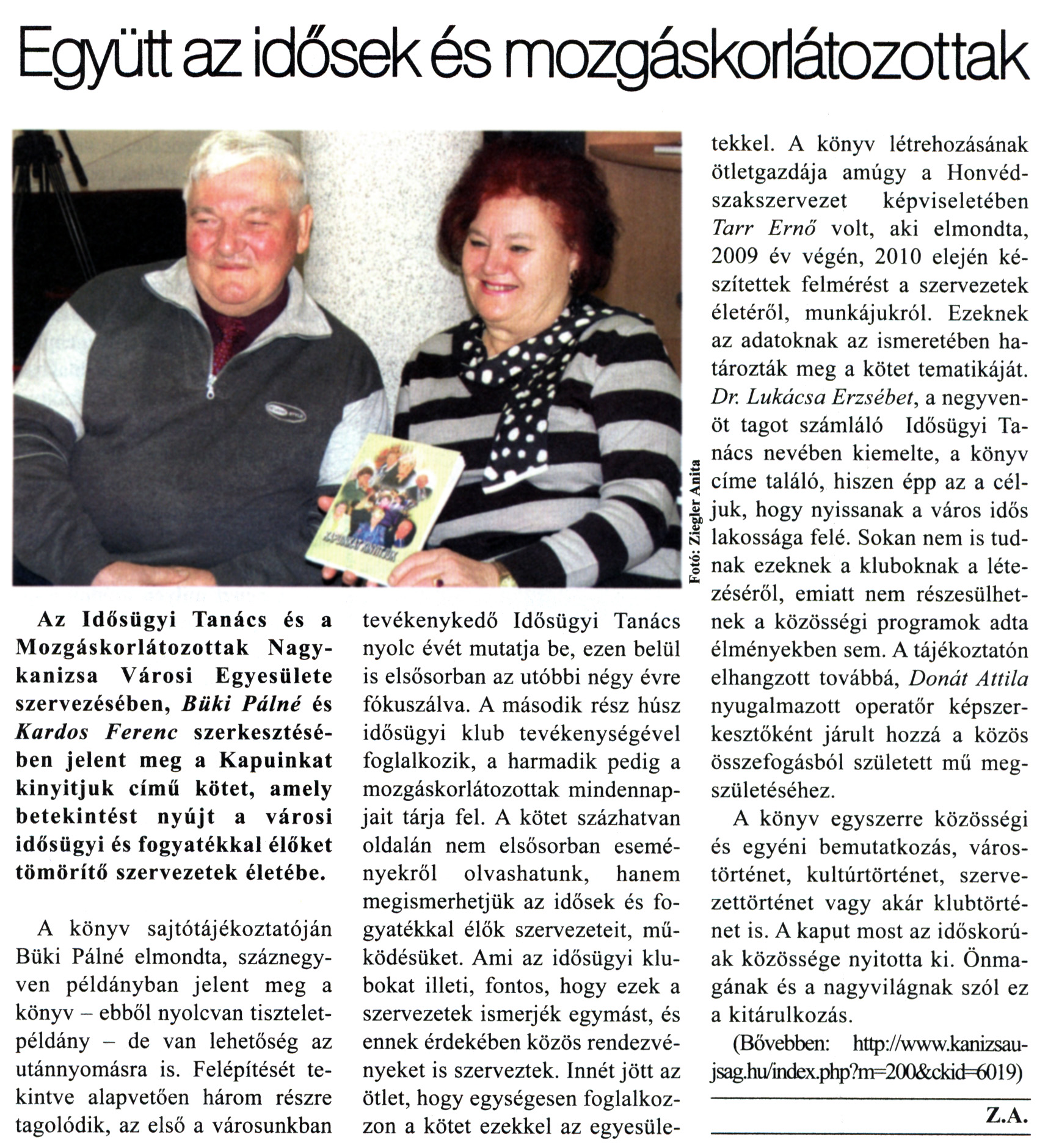 Nyilvános 2974 | 8417 | Kanizsa 2011. január 20. 2. szám 5. oldal - Együtt az idősek és mozgáskorlátozottak | A cikk szövege: Együtt az idősek és mozgáskorlátozottak Az Idősügyi Tanács és a Mozgáskorlátozottak Nagykanizsa Városi Egyesülete szervezésében, Büki Pálné és Kardos Ferenc szerkesztésében jelent meg a Kapuinkat kinyitjuk című kötet, amely betekintést nyújt a városi idősügyi és fogyatékkal élőket tömörítő szervezetek életébe. A könyv sajtótájékoztatóján Büki Pálné elmondta, száznegyven példányban jelent meg a könyv - ebből nyolcvan tiszteletpéldány - de van lehetőség az utánnyomásra is. Felépítését tekintve alapvetően három részre tagolódik, az első a városunkban tevékenykedő Idősügyi Tanács nyolc évét mutatja be, ezen belül is elsősorban az utóbbi négy évre fókuszálva. A második rész húsz idősügyi klub tevékenységével foglalkozik, a harmadik pedig a mozgáskorlátozottak mindennapjait tárja fel. A kötet százhatvan oldalán nem elsősorban eseményekről olvashatunk, hanem megismerhetjük az idősek és fogyatékkal élők szervezeteit, működésüket. Ami az idősügyi klubokat illeti, fontos, hogy ezek a szervezetek ismerjék egymást, és ennek érdekében közös rendezvényeket is szerveztek. Innét jött az ötlet, hogy egységesen foglalkozzon a kötet ezekkel az egyesületekkel. A könyv létrehozásának ötletgazdája amúgy a Honvédszakszervezet képviseletében Tarr Ernő volt, aki elmondta, 2009 év végén, 2010 elején készítettek felmérést a szervezetek életéről, munkájukról. Ezeknek az adatoknak az ismeretében határozták meg a kötet tematikáját. Dr. Lukácsa Erzsébet, a negyvenöt tagot számláló Idősügyi Tanács nevében kiemelte, a könyv címe találó, hiszen épp az a céljuk, hogy nyissanak a város idős lakossága felé. Sokan nem is tudnak ezeknek a kluboknak a létezéséről, emiatt nem részesülhetnek a közösségi programok adta élményekben sem. A tájékoztatón elhangzott továbbá, Donát Attila nyugalmazott operatőr képszerkesztőként járult hozzá a közös összefogásból született mű megszületéséhez. A könyv egyszerre közösségi és egyéni bemutatkozás, várostörténet, kultúrtörténet, szervezettörténet vagy akár klubtörténet is. A kaput most az időskorúak közössége nyitotta ki. Önmagának és a nagyvilágnak szól ez a kitárulkozás. (Bővebben: http://www.kanizsaujsag.hu/index.php?m=200&ckid=6019) Z.A. Fotó: Ziegler Anita |