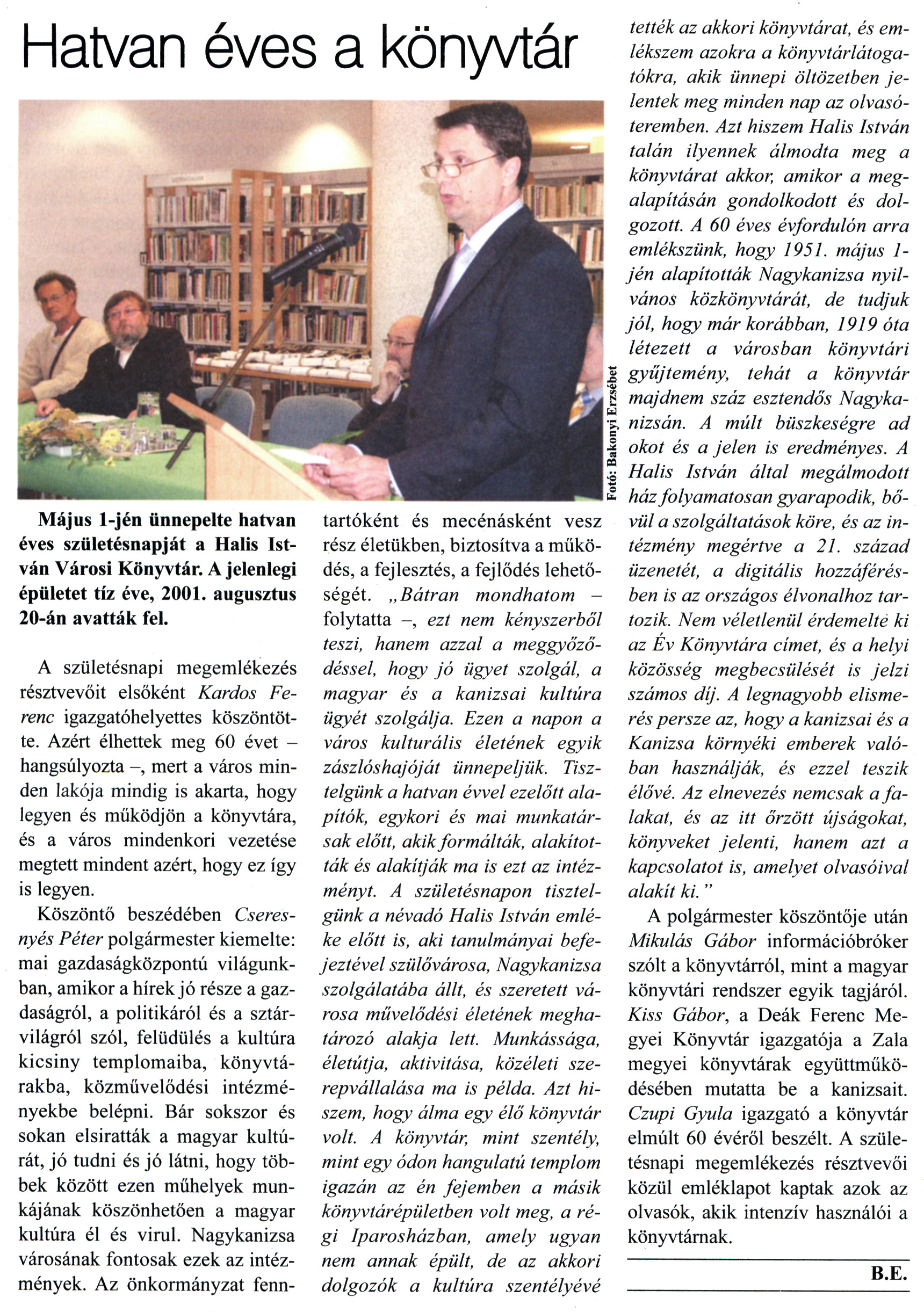 Nyilvános 3067 | 8860 | Kanizsa 2011. május 5. 17. szám 5. oldal - Hatvan éves a könyvtár | A cikk szövege: Hatvan éves a könyvtár Május l-jén ünnepelte hatvan éves születésnapját a Halis István Városi Könyvtár. A jelenlegi épületet tíz éve, 2001. augusztus 20-án avatták fel. A születésnapi megemlékezés résztvevőit elsőként Kardos Ferenc igazgatóhelyettes köszöntötte. Azért élhettek meg 60 évet -hangsúlyozta -, mert a város minden lakója mindig is akarta, hogy legyen és működjön a könyvtára, és a város mindenkori vezetése megtett mindent azért, hogy ez így is legyen. Köszöntő beszédében Cseresnyés Péter polgármester kiemelte: mai gazdaságközpontú világunkban, amikor a hírek jó része a gazdaságról, a politikáról és a sztárvilágról szól, felüdülés a kultúra kicsiny templomaiba, könyvtárakba, közművelődési intézményekbe belépni. Bár sokszor és sokan elsiratták a magyar kultúrát, jó tudni és jó látni, hogy többek között ezen műhelyek munkájának köszönhetően a magyar kultúra él és virul. Nagykanizsa városának fontosak ezek az intézmények. Az önkormányzat fenntartóként és mecénásként vesz rész életükben, biztosítva a működés, a fejlesztés, a fejlődés lehetőségét. „Bátran mondhatom -folytatta -, ezt nem kényszerből teszi, hanem azzal a meggyőződéssel, hogy jó ügyet szolgál, a magyar és a kanizsai kultúra ügyét szolgálja. Ezen a napon a város kulturális életének egyik zászlóshajóját ünnepeljük. Tisztelgünk a hatvan évvel ezelőtt alapítók, egykori és mai munkatársak előtt, akik formálták, alakították és alakítják ma is ezt az intézményt. A születésnapon tisztelgünk a névadó Halis István emléke előtt is, aki tanulmányai befejeztével szülővárosa, Nagykanizsa szolgálatába állt, és szeretett városa művelődési életének meghatározó alakja lett. Munkássága, életútja, aktivitása, közéleti szerepvállalása ma is példa. Azt hiszem, hogy álma egy élő könyvtár volt. A könyvtár, mint szentély, mint egy ódon hangulatú templom igazán az én fejemben a másik könyvtárépületben volt meg, a régi Iparosházban, amely ugyan nem annak épült, de az akkori dolgozók a kultúra szentélyévé tették az akkori könyvtárat, és emlékszem azokra a könyvtárlátogatókra, akik ünnepi öltözetben jelentek meg minden nap az olvasóteremben. Azt hiszem Halis István talán ilyennek álmodta meg a könyvtárat akkor, amikor a megalapításán gondolkodott és dolgozott. A 60 éves évfordulón arra emlékszünk, hogy 1951. május 1-jén alapították Nagykanizsa nyilvános közkönyvtárát, de tudjuk jól, hogy már korábban, 1919 óta létezett a városban könyvtári gyűjtemény, tehát a könyvtár majdnem száz esztendős Nagykanizsán. A múlt büszkeségre ad okot és a jelen is eredményes. A Halis István által megálmodott ház folyamatosan gyarapodik, bővül a szolgáltatások köre, és az intézmény megértve a 21. század üzenetét, a digitális hozzáférésben is az országos élvonalhoz tartozik. Nem véletlenül érdemelte ki az Év Könyvtára címet, és a helyi közösség megbecsülését is jelzi számos díj. A legnagyobb elismerés persze az, hogy a kanizsai és a Kanizsa környéki emberek valóban használják, és ezzel teszik élővé. Az elnevezés nemcsak a falakat, és az itt őrzött újságokat, könyveket jelenti, hanem azt a kapcsolatot is, amelyet olvasóival alakít ki. " A polgármester köszöntője után Mikulás Gábor információbróker szólt a könyvtárról, mint a magyar könyvtári rendszer egyik tagjáról. Kiss Gábor, a Deák Ferenc Megyei Könyvtár igazgatója a Zala megyei könyvtárak együttműködésében mutatta be a kanizsait. Czupi Gyula igazgató a könyvtár elmúlt 60 évéről beszélt. A születésnapi megemlékezés résztvevői közül emléklapot kaptak azok az olvasók, akik intenzív használói a könyvtárnak. |