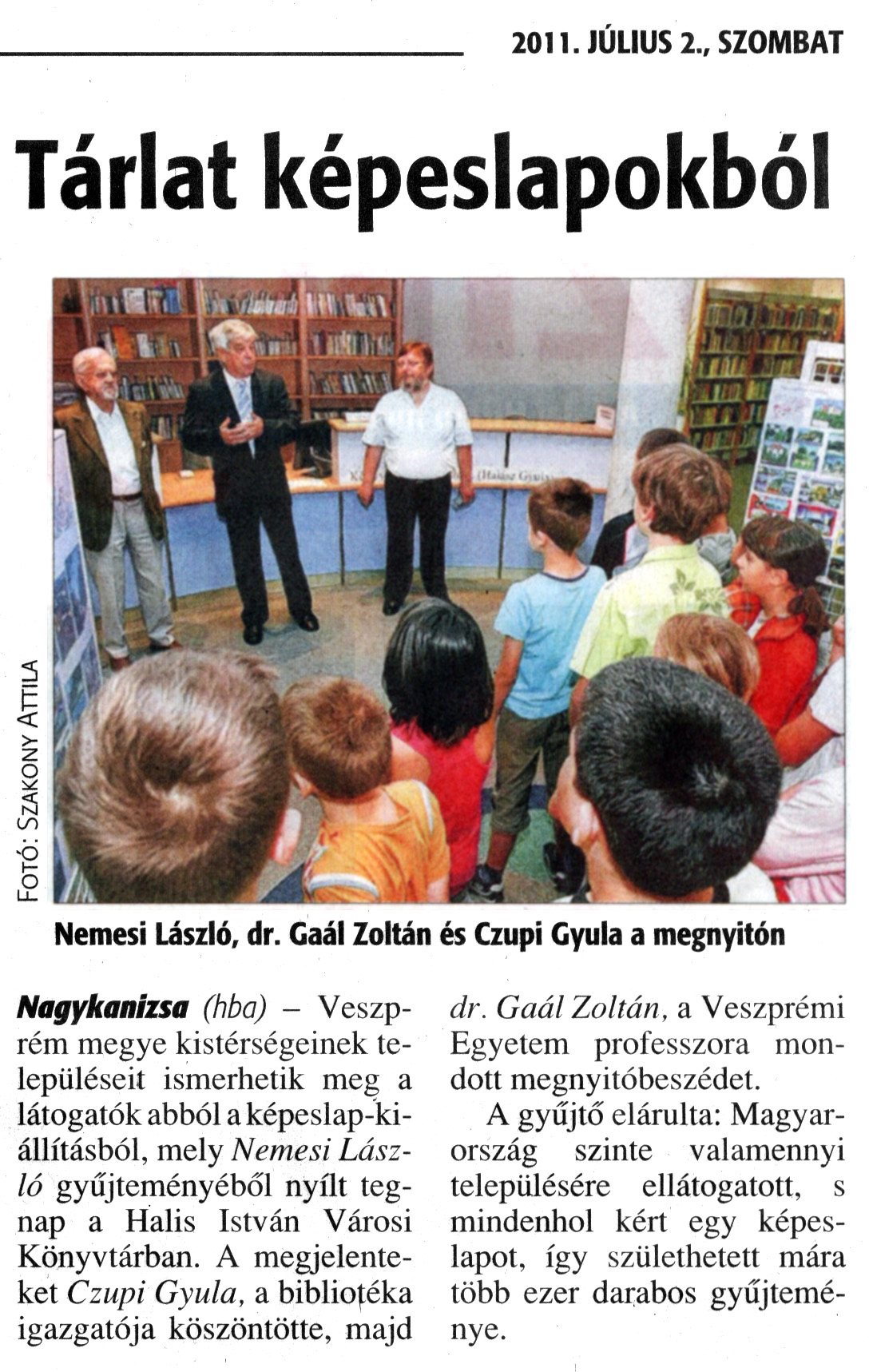 Nyilvános 2152 | 5265 | Zalai Hírlap 2011. július 2. 153. szám 16. oldal - Tárlat képeslapokból | A cikk szövege: Tárlat képeslapokból Nemesi László, dr. Gaál Zoltán és Czupi Gyula a megnyitón Nagykanizsa (hba) - Veszprém megye kistérségeinek településeit ismerhetik meg a látogatók abból a képeslap-kiállításból, mely Nemesi László gyűjteményéből nyílt tegnap a Halis István Városi Könyvtárban. A megjelenteket Czupi Gyula, a bibliotéka igazgatója köszöntötte, majd dr. Gaál Zoltán, a Veszprémi Egyetem professzora mondott megnyitóbeszédet. A gyűjtő elárulta: Magyarország szinte valamennyi településére ellátogatott, s mindenhol kért egy képeslapot, így születhetett mára több ezer darabos gyűjteménye. |