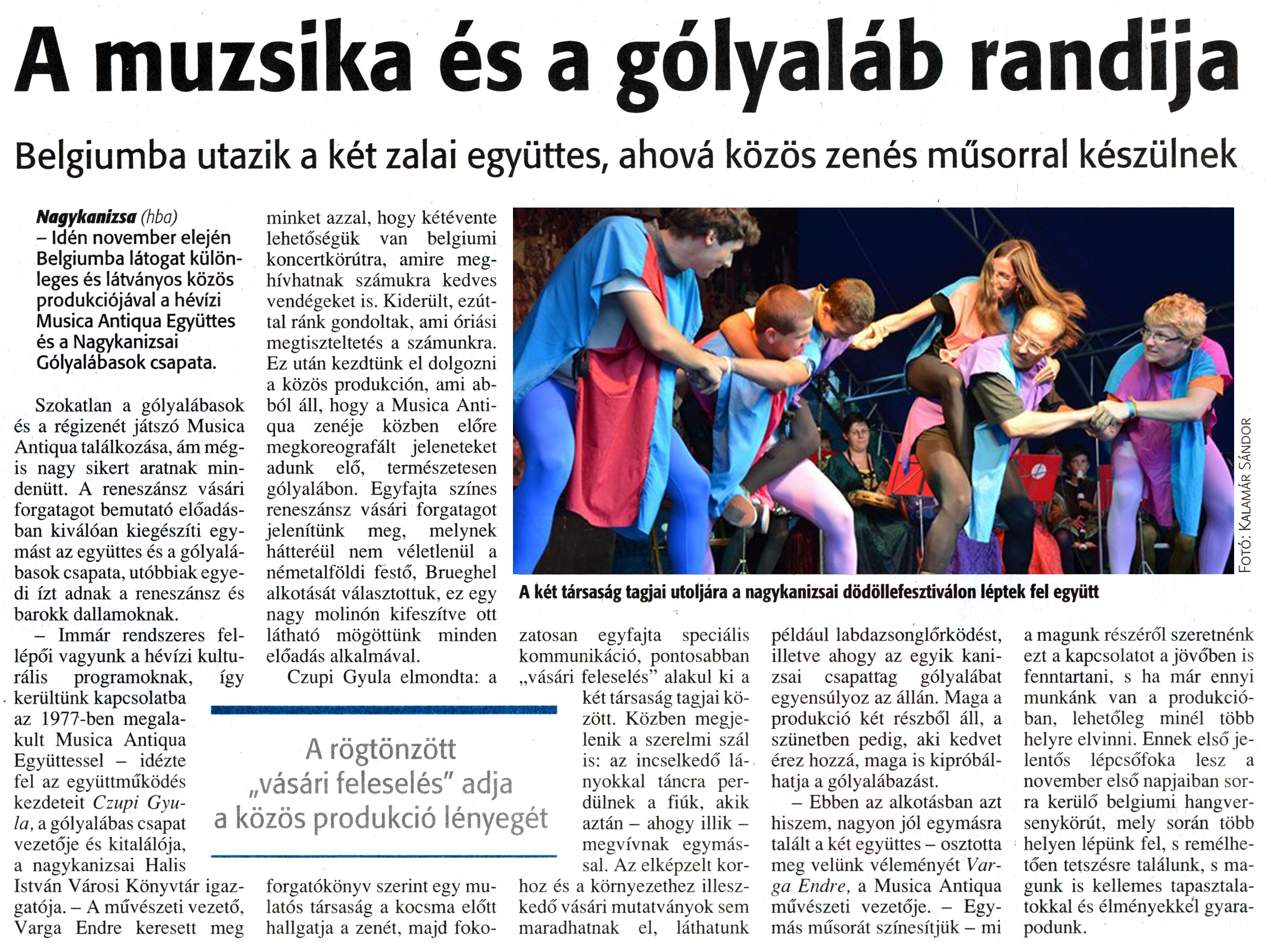 Nyilvános 2740 | 6005 | Zalai Hírlap 2011. szeptember 22. 222. szám 7. oldal - A muzsika és a gólyaláb randija | A muzsika és a gólyaláb randija Belgiumba utazik a két zalai együttes, ahová közös zenés műsorral készülnek A rögtönzött „vásári feleselés" adja a közös produkció lényegét Nagykanizsa (hba) - Idén november elején Belgiumba látogat különleges és látványos közös produkciójával a hévízi Musica Antiqua Együttes és a Nagykanizsai Gólyalábasok csapata. Szokatlan a gólyalábasok és a régizenét játszó Musica Antiqua találkozása, ám mégis nagy sikert aratnak mindenütt. A reneszánsz vásári forgatagot bemutató előadásban kiválóan kiegészíti egymást az együttes és a gólyalábasok csapata, utóbbiak egyedi ízt adnak a reneszánsz és barokk dallamoknak. - Immár rendszeres fellépői vagyunk a hévízi kulturális programoknak, így kerültünk kapcsolatba az 1977-ben megalakult Musica Antiqua Együttessel - idézte fel az együttműködés kezdeteit Czupi Gyula, a gólyalábas csapat vezetője és kitalálója, a nagykanizsai Halis István Városi Könyvtár igazgatója. - A művészeti vezető, Varga Endre keresett meg minket azzal, hogy kétévente lehetőségük van belgiumi koncertkörútra, amire meghívhatnak számukra kedves vendégeket is. Kiderült, ezúttal ránk gondoltak, ami óriási megtiszteltetés a számunkra. Ez után kezdtünk el dolgozni a közös produkción, ami abból áll, hogy a Musica Antiqua zenéje közben előre megkoreografált jeleneteket adunk elő, természetesen gólyalábon. Egyfajta színes reneszánsz vásári forgatagot jelenítünk meg, melynek hátteréül nem véletlenül a németalföldi festő, Brueghel alkotását választottuk, ez egy nagy molinón kifeszítve ott látható mögöttünk minden előadás alkalmával. Czupi Gyula elmondta: a forgatókönyv szerint egy mulatós társaság a kocsma előtt hallgatja a zenét, majd fokozatosan egyfajta speciális kommunikáció, pontosabban „vásári feleselés" alakul ki a két társaság tagjai között. Közben megjelenik a szerelmi szál is: az incselkedő lányokkal táncra perdülnek a fiúk, akik aztán - ahogy illik -megvívnak egymással. Az elképzelt korhoz és a környezethez illeszkedő vásári mutatványok sem maradhatnak el, láthatunk például labdazsonglőrködést, illetve ahogy az egyik kanizsai csapattag gólyalábat egyensúlyoz az állán. Maga a produkció két részből áll, a szünetben pedig, aki kedvet érez hozzá, maga is kipróbálhatja a gólyalábazást. - Ebben az alkotásban azt hiszem, nagyon jól egymásra talált a két együttes - osztotta meg velünk véleményét Varga Endre, a Musica Antiqua művészeti vezetője. - Egymás műsorát színesítjük - mi a magunk részéről szeretnénk ezt a kapcsolatot a jövőben is fenntartani, s ha már ennyi munkánk van a produkcióban, lehetőleg minél több helyre elvinni. Ennek első jelentős lépcsőfoka lesz a november első napjaiban sorra kerülő belgiumi hangversenykörút, mely során több helyen lépünk fel, s remélhetően tetszésre találunk, s magunk is kellemes tapasztalatokkal és élményekkel gyarapodunk. A két társaság tagjai utoljára a nagykanizsai dödöllefesztiválon léptek fel együtt |