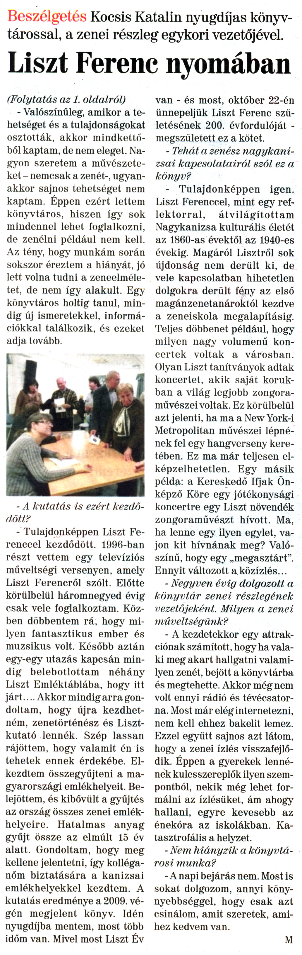 Nyilvános 2531 | 7474 | Nagykanizsai Maraton 2011. október 21. 42. szám 2. oldal - Liszt Ferenc nyomában | A cikk szövege: Beszélgetés Kocsis Katalin nyugdíjas könyvtárossal, a zenei részleg egykori vezetőjével. Liszt Ferenc nyomában (Folytatás az 1. oldalról) - Valószínűleg, amikor a tehetséget és a tulajdonságokat osztották, akkor mindkettőből kaptam, de nem eleget. Nagyon szeretem a művészeteket - nemcsak a zenét-, ugyanakkor sajnos tehetséget nem kaptam. Éppen ezért lettem könyvtáros, hiszen így sok mindennel lehet foglalkozni, de zenélni például nem kell. Az tény, hogy munkám során sokszor éreztem a hiányát, jó lett volna tudni a zeneelméletet, de nem így alakult. Egy könyvtáros holtig tanul, mindig új ismeretekkel, információkkal találkozik, és ezeket adja tovább. - A kutatás is ezért kezdődött? - Tulajdonképpen Liszt Ferenccel kezdődött. 1996-ban részt vettem egy televíziós műveltségi versenyen, amely Liszt Ferencről szólt. Előtte körülbelül háromnegyed évig csak vele foglalkoztam. Közben döbbentem rá, hogy milyen fantasztikus ember és muzsikus volt. Később aztán egy-egy utazás kapcsán mindig belebotlottam néhány Liszt Emléktáblába, hogy itt járt.... Akkor mindig arra gondoltam, hogy újra kezdhetném, zenetörténész és Lisztkutató lennék. Szép lassan rájöttem, hogy valamit én is tehetek ennek érdekébe. Elkezdtem összegyűjteni a magyarországi emlékhelyeit. Belejöttem, és kibővült a gyűjtés az ország összes zenei emlékhelyeire. Hatalmas anyag gyűjt össze az elmúlt 15 év alatt. Gondoltam, hogy meg kellene jelentetni, így kolléganőm biztatására a kanizsai emlékhelyekkel kezdtem. A kutatás eredménye a 2009. végén megjelent könyv. Idén nyugdíjba mentem, most több időm van. Mivel most Liszt Év van - és most, október 22-én ünnepeljük Liszt Ferenc születésének 200. évfordulóját -megszületett ez a kötet. - Tehát a zenész nagykanizsai kapcsolatairól szól ez a könyv? - Tulajdonképpen igen. Liszt Ferenccel, mint egy reflektorral, átvilágítottam Nagykanizsa kulturális életét az 1860-as évektől az 1940-es évekig. Magáról Lisztről sok újdonság nem derült ki, de vele kapcsolatban hihetetlen dolgokra derült fény az első magánzenetanároktól kezdve a zeneiskola megalapításig. Teljes döbbenet például, hogy milyen nagy volumenű koncertek voltak a városban. Olyan Liszt tanítványok adtak koncertet, akik saját korukban a világ legjobb zongoraművészeivoltak. Ez körülbelül azt jelenti, ha ma a New York-i Metropolitan művészei lépnének fel egy hangverseny keretében. Ez ma már teljesen elképzelhetetlen. Egy másik példa: a Kereskedő Ifjak Önképző Köre egy jótékonysági koncertre egy Liszt növendék zongoraművészt hívott. Ma, ha lenne egy ilyen egylet, vajon kit hívnának meg? Valószínű, hogy egy „megasztárt". Ennyit változott a közízlés... - Negyven évig dolgozott a könyvtár zenei részlegének vezetőjeként. Milyen a zenei műveltségűnk? - A kezdetekkor egy attrakciónak számított, hogy ha valaki meg akart hallgatni valamilyen zenét, bejött a könyvtárba és megtehette. Akkor még nem volt ennyi rádió és tévécsatorna. Most már elég internetezni, nem kell ehhez bakelit lemez. Ezzel együtt sajnos azt látom, hogy a zenei ízlés visszafejlődik. Éppen a gyerekek lennének kulcsszereplők ilyen szempontból, nekik még lehet formálni az ízlésüket, ám ahogy hallani, egyre kevesebb az énekóra az iskolákban. Katasztrofális a helyzet. - Nem hiányzik a könyvtárosi munka? - A napi bejárás nem. Most is sokat dolgozom, annyi köny-nyebbséggel, hogy csak azt csinálom, amit szeretek, amihez kedvem van. |