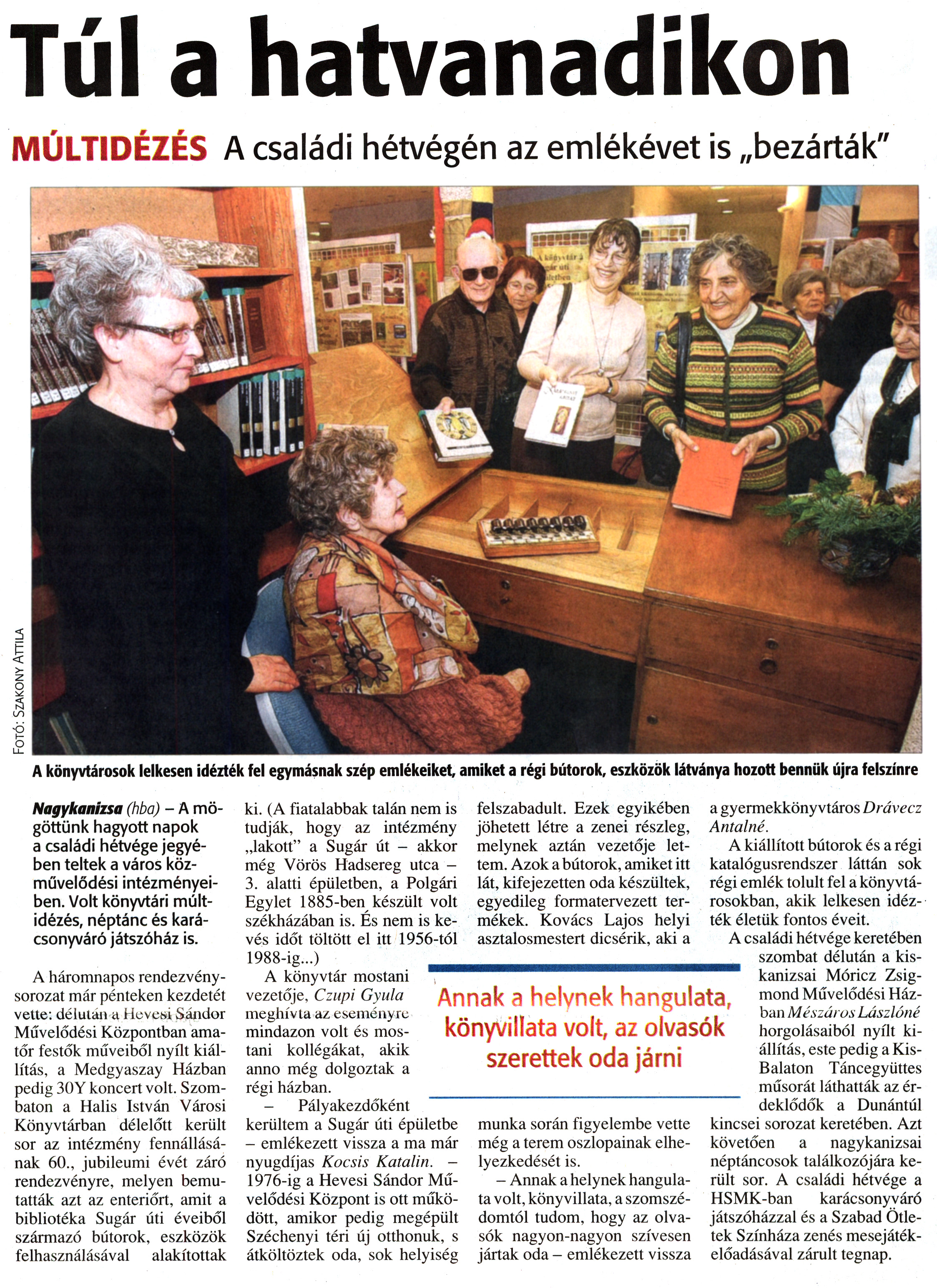 Nyilvános 2253 | 4789 | Zalai Hírlap 2011. december 12. 290. szám 11. oldal - Túl a hatvanadikon | Túl a hatvanadikon MÚLTIDÉZÉS A családi hétvégén az emlékévet is „bezárták" A könyvtárosok lelkesen idézték fel egymásnak szép emlékeiket, amiket a régi bútorok, eszközök látványa hozott bennük újra felszínre Nagykanizsa (hba) - A mögöttünk hagyott napok a családi hétvége jegyében teltek a város közművelődési intézményeiben. Volt könyvtári múltidézés, néptánc és karácsonyváró játszóház is. A háromnapos rendezvénysorozat már pénteken kezdetét vette: délután a Hevesi Sándor Művelődési Központban amatőr festők műveiből nyílt kiállítás, a Medgyaszay Házban pedig 30Y koncert volt. Szombaton a Halis István Városi Könyvtárban délelőtt került sor az intézmény fennállásának 60., jubileumi évét záró rendezvényre, melyen bemutatták azt az enteriőrt, amit a bibliotéka Sugár úti éveiből származó bútorok, eszközök felhasználásával alakítottak ki. (A fiatalabbak talán nem is tudják, hogy az intézmény „lakott" a Sugár út - akkor még Vörös Hadsereg utca -3. alatti épületben, a Polgári Egylet 1885-ben készült volt székházában is. És nem is kevés időt töltött el itt 1956-tól 1988-ig...) A könyvtár mostani vezetője, Czupi Gyula meghívta az eseményre mindazon volt és mostani kollégákat, akik anno még dolgoztak a régi házban. - Pályakezdőként kerültem a Sugár úti épületbe - emlékezett vissza a ma már nyugdíjas Kocsis Katalin. -1976-ig a Hevesi Sándor Művelődési Központ is ott működött, amikor pedig megépült Széchenyi téri új otthonuk, s átköltöztek oda, sok helyiség felszabadult. Ezek egyikében jöhetett létre a zenei részleg, melynek aztán vezetője lettem. Azok a bútorok, amiket itt lát, kifejezetten oda készültek, egyedileg formatervezett termékek. Kovács Lajos helyi asztalosmestert dicsérik, aki a munka során figyelembe vette még a terem oszlopainak elhelyezkedését is. - Annak a helynek hangulata volt, könyvillata, a szomszédomtól tudom, hogy az olvasók nagyon-nagyon szívesen jártak oda - emlékezett vissza a gyermekkönyvtáros Drávecz Antalné. A kiállított bútorok és a régi katalógusrendszer láttán sok régi emlék tolult fel a könyvtárosokban, akik lelkesen idézték életük fontos éveit. A családi hétvége keretében szombat délután a kis-kanizsai Móricz Zsigmond Művelődési Házban Mészáros László/lé horgolásaiból nyílt kiállítás, este pedig a Kis-Balaton Táncegyüttes műsorát láthatták az érdeklődők a Dunántúl kincsei sorozat keretében. Azt követően a nagykanizsai néptáncosok találkozójára került sor. A családi hétvége a HSMK-ban karácsonyváró játszóházzal és a Szabad Ötletek Színháza zenés mesejátékelőadásával zárult tegnap. Fotó: Szakony Attila |
