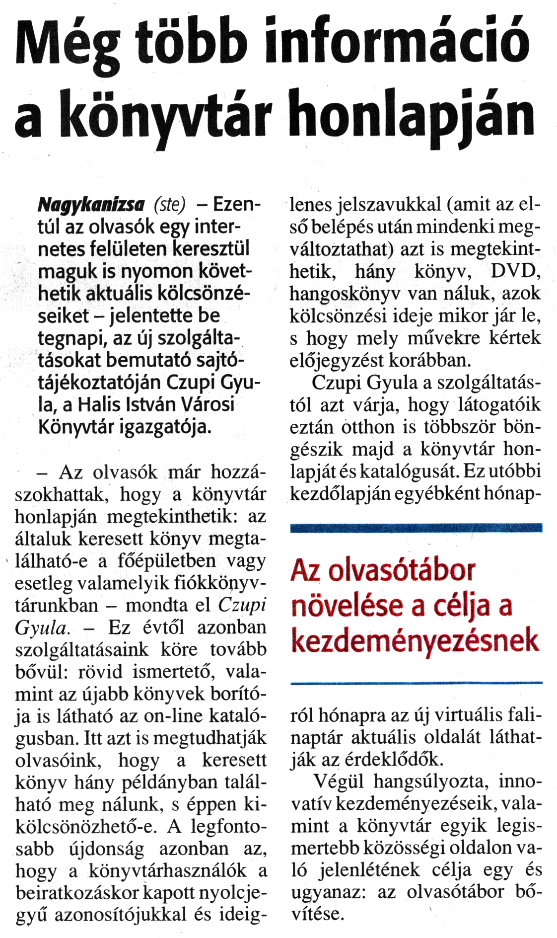 Nyilvános 2230 | 4720 | Zalai Hírlap 2012. január 3. 2. szám 7. oldal - Még több információ a könyvtár honlapján | Még több információ a könyvtár honlapján Nagykanizsa (ste) - Ezentúl az olvasók egy internetes felületen keresztül maguk is nyomon követhetik aktuális kölcsönzéseiket - jelentette be tegnapi, az új szolgáltatásokat bemutató sajtótájékoztatóján Czupi Gyula, a Halis István Városi Könyvtár igazgatója. - Az olvasók már hozzászokhattak, hogy a könyvtár honlapján megtekinthetik: az általuk keresett könyv megtalálható-e a főépületben vagy esetleg valamelyik fiókkönyvtárunkban - mondta el Czupi Gyula. - Ez évtől azonban szolgáltatásaink köre tovább bővül: rövid ismertető, valamint az újabb könyvek borítója is látható az on-line katalógusban. Itt azt is megtudhatják olvasóink, hogy a keresett könyv hány példányban található meg nálunk, s éppen kikölcsönözhető-e. A legfontosabb újdonság azonban az, hogy a könyvtárhasználók a beiratkozáskor kapott nyolcjegyű azonosítójukkal és ideig- lenes jelszavukkal (amit az első belépés után mindenki megváltoztathat) azt is megtekinthetik, hány könyv, DVD, hangoskönyv van náluk, azok kölcsönzési ideje mikor jár le, s hogy mely művekre kértek előjegyzést korábban. Czupi Gyula a szolgáltatástól azt várja, hogy látogatóik eztán otthon is többször böngészik majd a könyvtár honlapját és katalógusát. Ez utóbbi kezdőlapján egyébként hónap- Az olvasótábor növelése a célja a kezdeményezésnek ról hónapra az új virtuális falinaptár aktuális oldalát láthatják az érdeklődők. Végül hangsúlyozta, innovatív kezdeményezéseik, valamint a könyvtár egyik legismertebb közösségi oldalon való jelenlétének célja egy és ugyanaz: az olvasótábor bővítése. |