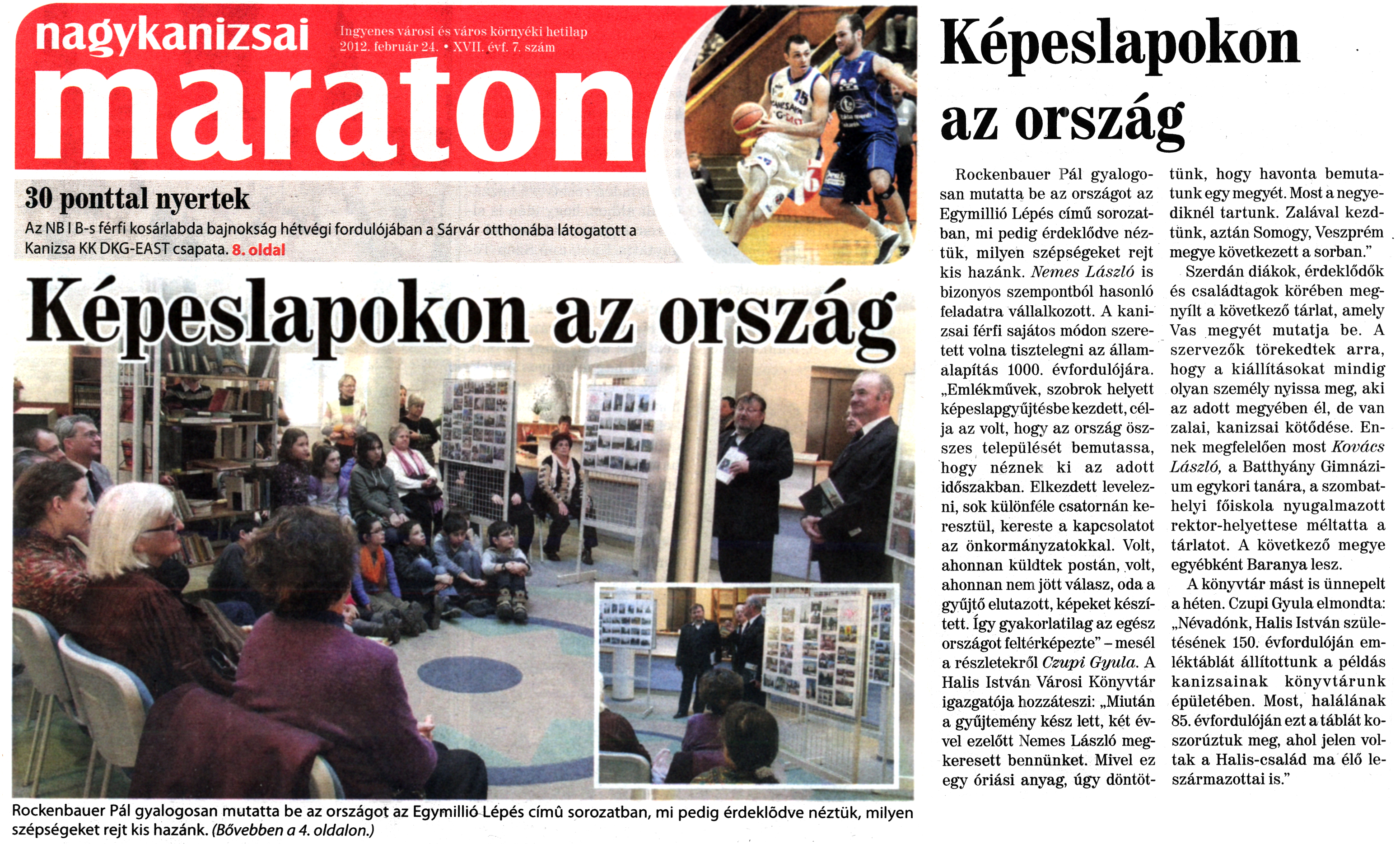 Nyilvános 2463 | 6632 | Nagykanizsai Maraton 2012. február 24. 7. szám 1, 4. oldal - Képeslapokon az ország | Képeslapokon az ország Rockenbauer Pál gyalogosan mutatta be az országot az Egymillió Lépés című sorozatban, mi pedig érdeklődve néztük, milyen szépségeket rejt kis hazánk. Nemes László is bizonyos szempontból hasonló feladatra vállalkozott. A kanizsai férfi sajátos módon szeretett volna tisztelegni az államalapítás 1000. évfordulójára. „Emlékművek, szobrok helyett képeslapgyűjtésbe kezdett, célja az volt, hogy az ország összes települését bemutassa, hogy néznek ki az adott időszakban. Elkezdett levelezni, sok különféle csatornán keresztül, kereste a kapcsolatot az önkormányzatokkal. Volt, ahonnan küldtek postán, volt, ahonnan nem jött válasz, oda a gyűjtő elutazott, képeket készített. Így gyakorlatilag az egész országot feltérképezte" - mesél a részletekről Czupi Gyula. A Halis István Városi Könyvtár igazgatója hozzáteszi: „Miután a gyűjtemény kész lett, két évvel ezelőtt Nemes László megkeresett bennünket. Mivel ez egy óriási anyag, úgy döntöttünk, hogy havonta bemutatunk egy megyét. Most a negyediknél tartunk. Zalával kezdtünk, aztán Somogy, Veszprém megye következett a sorban." Szerdán diákok, érdeklődők és családtagok körében megnyílt a következő tárlat, amely Vas megyét mutatja be. A szervezők törekedtek arra, hogy a kiállításokat mindig olyan személy nyissa meg, aki az adott megyében él, de van zalai, kanizsai kötődése. Ennek megfelelően most Kovács László, a Batthyány Gimnázium egykori tanára, a szombathelyi főiskola nyugalmazott rektor-helyettese méltatta a tárlatot. A következő megye egyébként Baranya lesz. A könyvtár mást is ünnepelt a héten. Czupi Gyula elmondta: „Névadónk, Halis István születésének 150. évfordulóján emléktáblát állítottunk a példás kanizsainak könyvtárunk épületében. Most, halálának 85. évfordulóján ezt a táblát koszorúztuk meg, ahol jelen voltak a Halis-család ma élő leszármazottai is." |