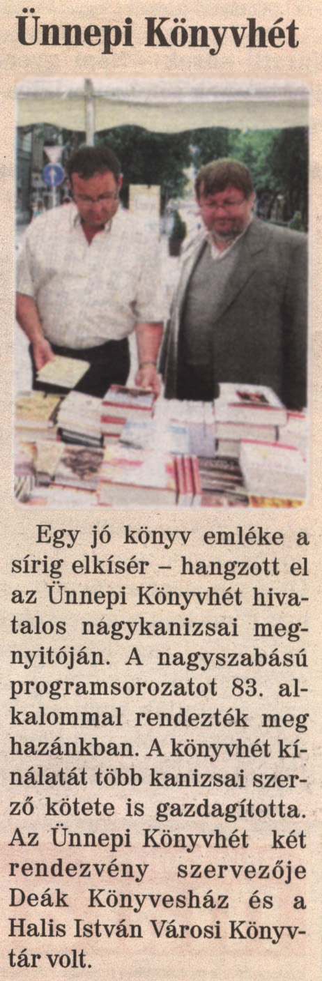Nyilvános 2245 | 5386 | Nagykanizsai Maraton 2012. június 15. 23. szám 1. oldal - Ünnepi Könyvhét | Ünnepi Könyvhét Egy jó könyv emléke a sírig elkísér - hangzott el az Ünnepi Könyvhét hivatalos nagykanizsai megnyitóján. A nagyszabású programsorozatot 83. alkalommal rendezték meg hazánkban. A könyvhét kínálatát több kanizsai szerző kötete is gazdagította. Az Ünnepi Könyvhét két rendezvény szervezője Deák Könyvesház és a Halis István Városi Könyvtár volt. |
