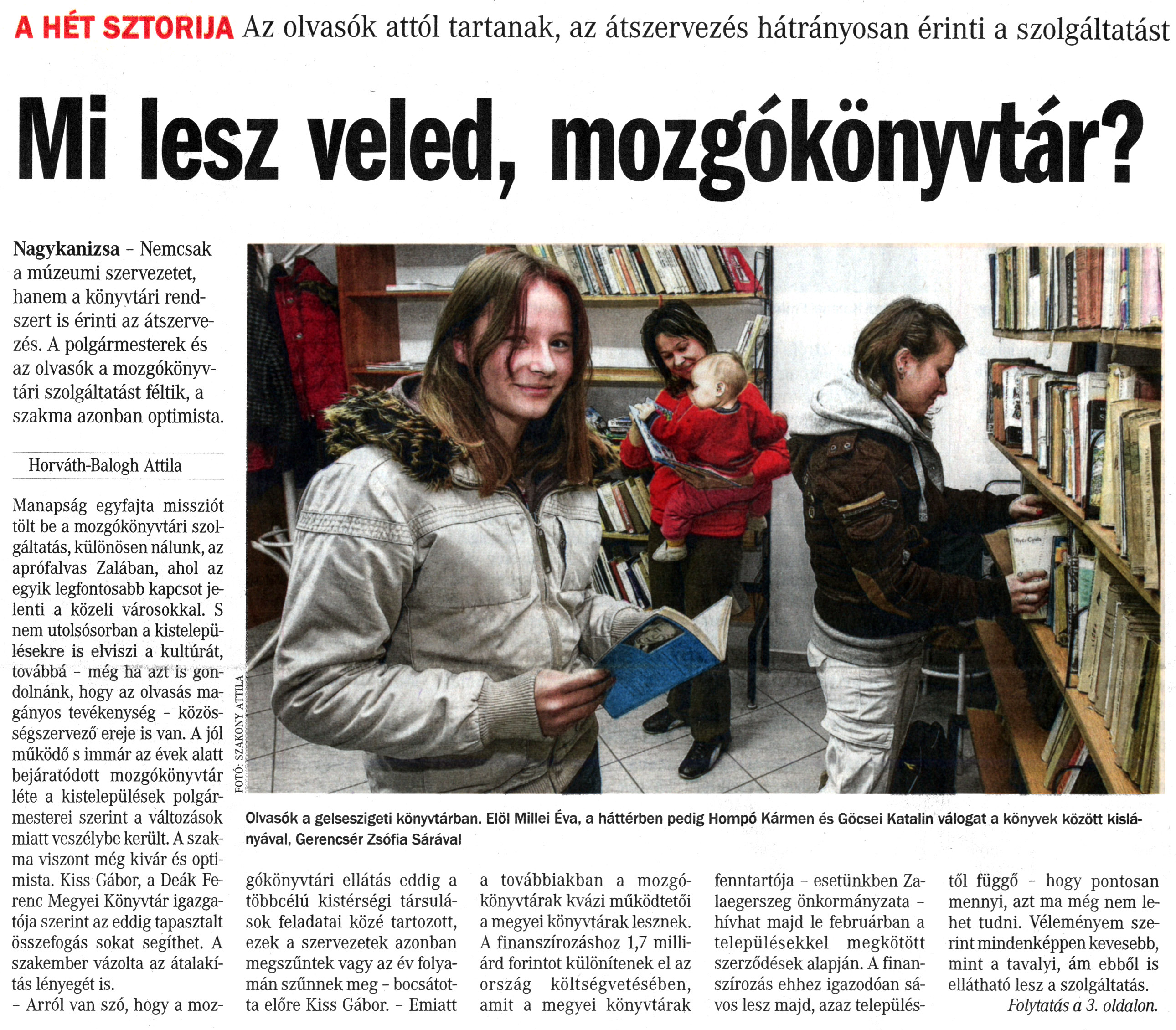 Nyilvános 2100 | 4636 | Vasárnapi Zalai Hírlap 2013. január 13. 2. szám 1. oldal - Mi lesz veled, mozgókönyvtár? | A HÉT SZTORIJA Az olvasók attól tartanak, az átszervezés hátrányosan érinti a szolgáltatást Mi lesz veled, mozgókönyvtár? Olvasók a gelseszigeti könyvtárban. Elöl Millei Éva, a háttérben pedig Hompó Kármen és Göcsei Katalin válogat a könyvek között kislányával, Gerencsér Zsófia Sárával FOTÓ: SZAKONY ATTILA Nagykanizsa - Nemcsak a múzeumi szervezetet, hanem a könyvtári rendszert is érinti az átszervezés. A polgármesterek és az olvasók a mozgókönyvtári szolgáltatást féltik, a szakma azonban optimista. Horváth-Balogh Attila Manapság egyfajta missziót tölt be a mozgókönyvtári szolgáltatás, különösen nálunk, az aprófalvas Zalában, ahol az egyik legfontosabb kapcsot jelenti a közeli városokkal. S nem utolsósorban a kistelepülésekre is elviszi a kultúrát, továbbá - még ha azt is gondolnánk, hogy az olvasás magányos tevékenység - közösségszervező ereje is van. A jól működő s immár az évek alatt bejáratódott mozgókönyvtár léte a kistelepülések polgármesterei szerint a változások miatt veszélybe került. A szakma viszont még kivár és optimista. Kiss Gábor, a Deák Ferenc Megyei Könyvtár igazgatója szerint az eddig tapasztalt összefogás sokat segíthet. A szakember vázolta az átalakítás lényegét is. - Arról van szó, hogy a mozgókönyvtári ellátás eddig a többcélú kistérségi társulások feladatai közé tartozott, ezek a szervezetek azonban megszűntek vagy az év folyamán szűnnek meg - bocsátotta előre Kiss Gábor. - Emiatt a továbbiakban a mozgókönyvtárak kvázi működtetői a megyei könyvtárak lesznek. A finanszírozáshoz 1,7 milliárd forintot különítenek el az ország költségvetésében, amit a megyei könyvtárak fenntartója - esetünkben Zalaegerszeg önkormányzata -hívhat majd le februárban a településekkel megkötött szerződések alapján. A finanszírozás ehhez igazodóan sávos lesz majd, azaz településtől függő - hogy pontosan mennyi, azt ma még nem lehet tudni. Véleményem szerint mindenképpen kevesebb, mint a tavalyi, ám ebből is ellátható lesz a szolgáltatás. Folytatás a 3. oldalon. |