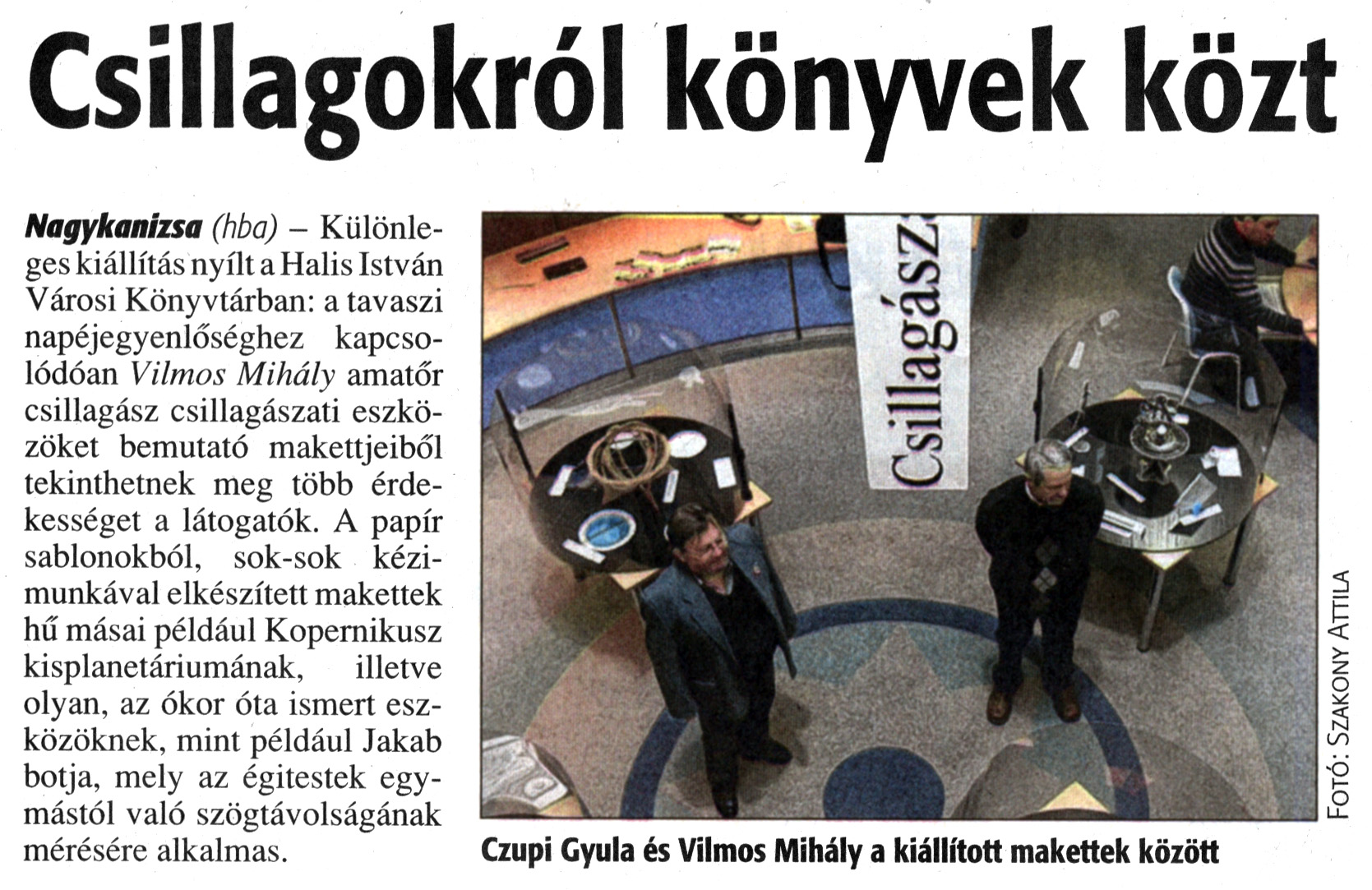 Nyilvános 2063 | 4523 | Zalai Hírlap 2013. március 18. 64. szám 12. oldal - Csillagokról könyvek közt | Csillagokról könyvek közt Nagykanizsa (hba) - Különleges kiállítás nyílt a Halis István Városi Könyvtárban: a tavaszi napéjegyenlőséghez kapcsolódóan Vilmos Mihály amatőr csillagász csillagászati eszközöket bemutató makettjeiből tekinthetnek meg több érdekességet a látogatók. A papír sablonokból, sok-sok kézimunkával elkészített makettek hű másai például Kopernikusz kisplanetáriumának, illetve olyan, az ókor óta ismert eszközöknek, mint például Jakab botja, mely az égitestek egymástól való szögtávolságának mérésére alkalmas. Czupi Gyula és Vilmos Mihály a kiállított makettek között Fotó: Szakony Attila |