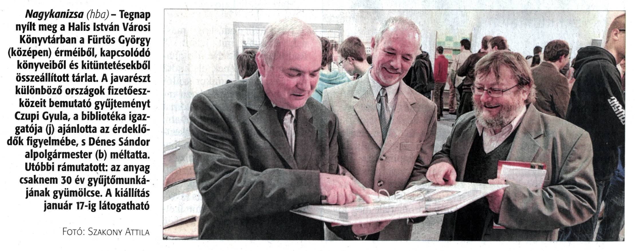 Nyilvános 2244 | 4100 | Zalai Hírlap 2013. december 11. 288. szám 3. oldal - Érmekiállítás | Nagykanizsa (hba) - Tegnap nyílt meg a Halis István Városi Könyvtárban a Fürtös György (középen) érméiből, kapcsolódó könyveiből és kitüntetésekből összeállított tárlat. A javarészt különböző országok fizetőeszközeit bemutató gyűjteményt Czupi Gyula, a bibliotéka igazgatója (j) ajánlotta az érdeklődők figyelmébe, s Dénes Sándor alpolgármester (b) méltatta. Utóbbi rámutatott: az anyag csaknem 30 év gyűjtőmunkájának gyümölcse. A kiállítás január 17-ig látogatható Fotó: Szakony Attila |