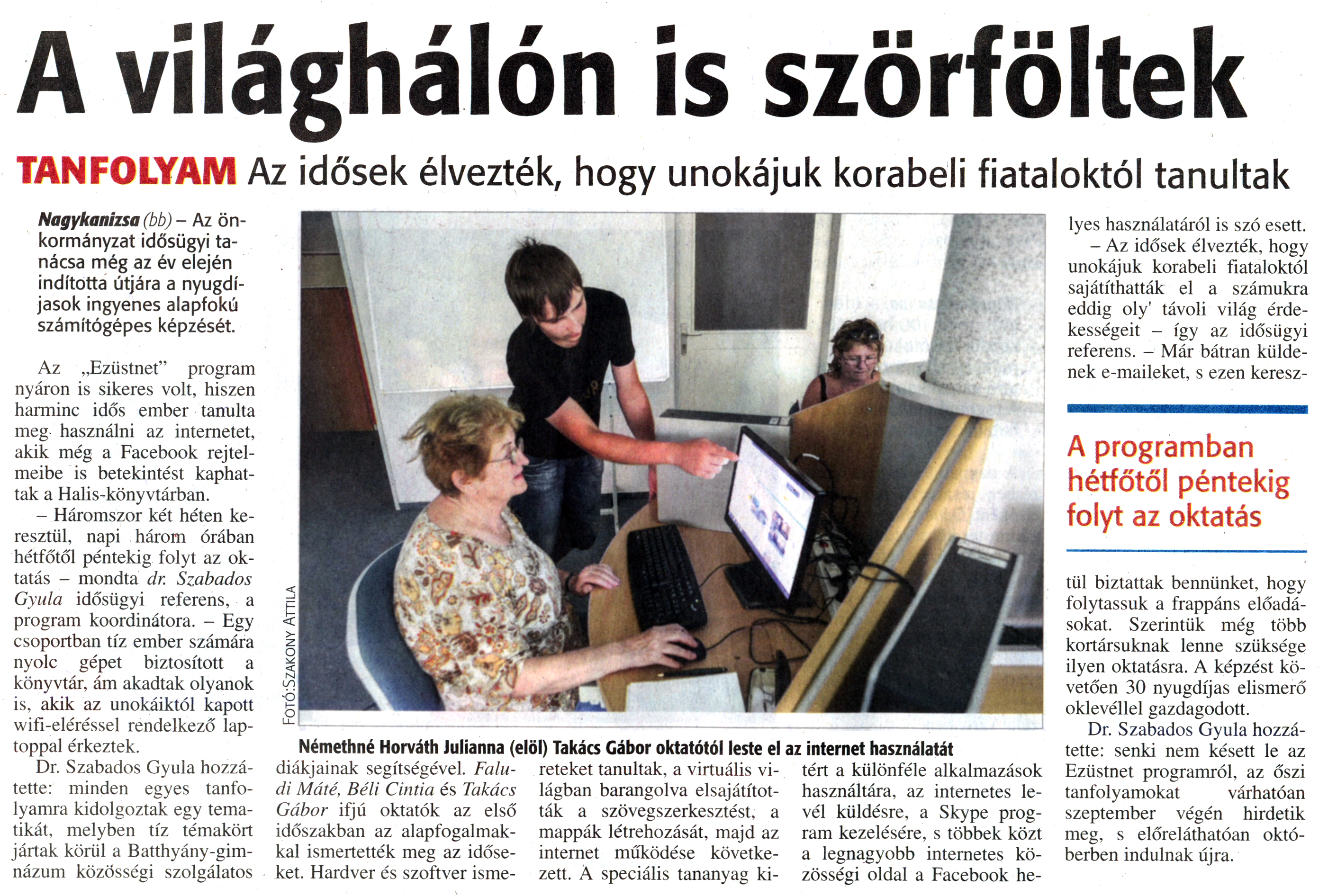 Nyilvános 2280 | 4005 | Zalai Hírlap 2014. szeptember 4. 206. szám 4. oldal | A világhálón is szörföltek TANFOLYAM Az idősek élvezték, hogy unokájuk korabeli fiataloktól tanultak Nagykanizsa (bb) - Az önkormányzat idősügyi tanácsa még az év elején indította útjára a nyugdíjasok ingyenes alapfokú számítógépes képzését. Az „Ezüstnet" program nyáron is sikeres volt, hiszen harminc idős ember tanulta meg használni az internetet, akik még a Facebook rejtelmeibe is betekintést kaphattak a Halis-könyvtárban. - Háromszor két héten keresztül, napi három órában hétfőtől péntekig folyt az oktatás - mondta dr. Szabados Gyula idősügyi referens, a program koordinátora. - Egy csoportban tíz ember számára nyolc gépet biztosított a könyvtár, ám akadtak olyanok is, akik az unokáiktól kapott wifi-eléréssel rendelkező laptoppal érkeztek. Dr. Szabados Gyula hozzátette: minden egyes tanfolyamra kidolgoztak egy tematikát, melyben tíz témakört jártak körül a Batthyány-gimnázum közösségi szolgálatos diákjainak segítségével. Faludi Máté, Béli Cintia és Takács Gábor ifjú oktatók az első időszakban az alapfogalmakkal ismertették meg az időseket. Hardver és szoftver ismereteket tanultak, a virtuális világban barangolva elsajátították a szövegszerkesztést, a mappák létrehozását, majd az internet működése következett. A speciális tananyag kitért a különféle alkalmazások használatára, az internetes levél küldésre, a Skype program kezelésére, s többek közt a legnagyobb internetes közösségi oldal a Facebook helyes használatáról is szó esett. - Az idősek élvezték, hogy unokájuk korabeli fiataloktól sajátíthatták el a számukra eddig oly\' távoli világ érdekességeit - így az idősügyi referens. - Már bátran küldenek e-maileket, s ezen keresztül biztattak bennünket, hogy folytassuk a frappáns előadásokat. Szerintük még több kortársuknak lenne szüksége ilyen oktatásra. A képzést követően 30 nyugdíjas elismerő oklevéllel gazdagodott. Dr. Szabados Gyula hozzátette: senki nem késett le az Ezüstnet programról, az őszi tanfolyamokat várhatóan szeptember végén hirdetik meg, s előreláthatóan októberben indulnak újra. Némethné Horváth Julianna (elöl) Takács Gábor oktatótól leste el az internet használatát A programban hétfőtől péntekig folyt az oktatás |