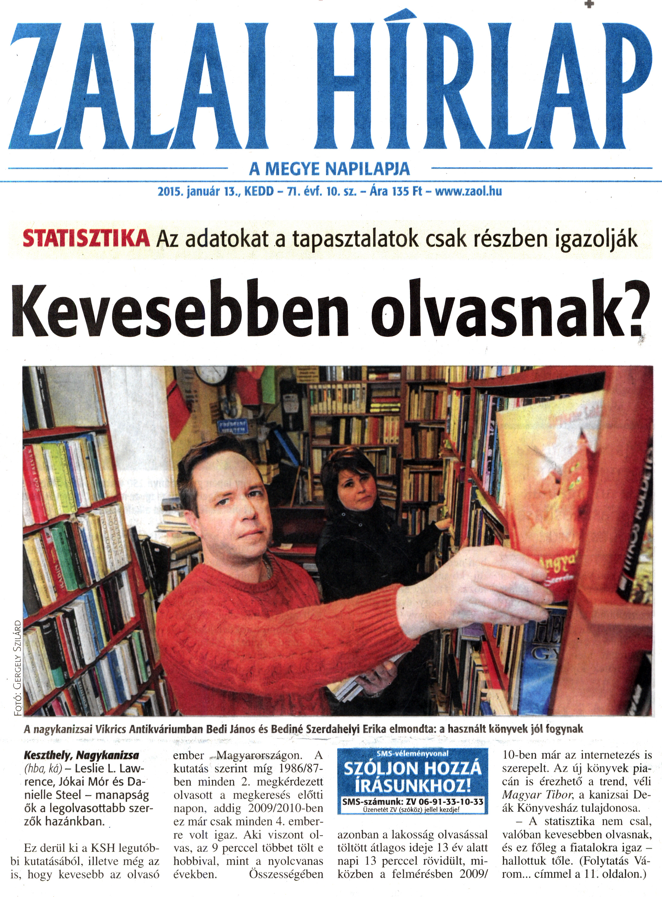 Nyilvános 2083 | 3864 | Zalai Hírlap 2015. január 13. 10. szám 1. oldal - Kevesebben olvasnak | HÍRLAP A MEGYE NAPILAPJA 2015. január 13., KEDD - 71. évf. 10. sz. - Ara 135 Ft - www.zaol.hu STATISZTIKA Az adatokat a tapasztalatok csak részben igazolják Kevesebben olvasnak? A nagykanizsai Vikrics Antikváriumban Bedi János és Bediné Szerdahelyi Erika elmondta: a használt könyvek jól fogynak Keszthely, Nagykanizsa (hba, ka) - Leslie L. Lawrence, Jókai Mór és Danielle Steel - manapság ők a legolvasottabb szerzők hazánkban. Ez derül ki a KSH legutóbbi kutatásából, illetve még az is, hogy kevesebb az olvasó ember Magyarországon. A kutatás szerint míg 1986/87-ben minden 2. megkérdezett olvasott a megkeresés előtti napon, addig 2009/2010-ben ez már csak minden 4. emberre volt igaz. Aki viszont olvas, az 9 perccel többet tölt e hobbival, mint a nyolcvanas években. Összességében azonban a lakosság olvasással töltött átlagos ideje 13 év alatt napi 13 perccel rövidült, miközben a felmérésben 2009/ 10-ben már az internetezés is szerepelt. Az új könyvek piacán is érezhető a trend, véli Magyar Tibor, a kanizsai Deák Könyvesház tulajdonosa. - A statisztika nem csal, valóban kevesebben olvasnak, és ez főleg a fiatalokra igaz - hallottuk tőle. (Folytatás Várom... címmel a 11. oldalon.) |