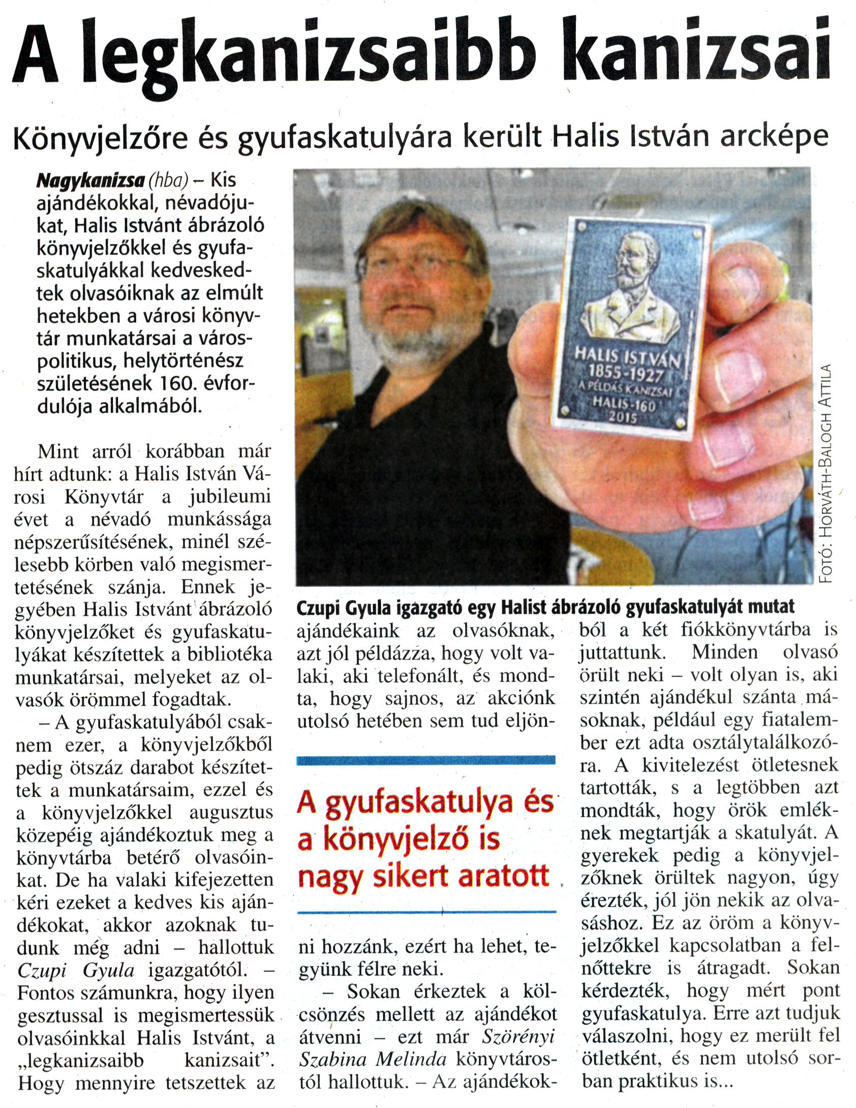 Nyilvános 1884 | 3656 | Zalai Hírlap 2015. szeptember 10. 212. szám 4. oldal | A legkanizsaibb kanizsai Könyvjelzőre és gyufaskatulyára került Halis István arcképe Czupi Gyula igazgató egy Halist ábrázoló gyufaskatulyát mutat A gyufaskatulya és a könyvjelző is nagy sikert aratott Nagykanizsa (hba) - Kis ajándékokkal, névadójukat, Halis Istvánt ábrázoló könyvjelzőkkel és gyufaskatulyákkal kedveskedtek olvasóiknak az elmúlt hetekben a városi könyvtár munkatársai a várospolitikus, helytörténész születésének 160. évfordulója alkalmából. Mint arról korábban már hírt adtunk: a Halis István Városi Könyvtár a jubileumi évet a névadó munkássága népszerűsítésének, minél szélesebb körben való megismertetésének szánja. Ennek jegyében Halis Istvánt ábrázoló könyvjelzőket és gyufaskatulyákat készítettek a bibliotéka munkatársai, melyeket az olvasók örömmel fogadtak. - A gyufaskatulyából csaknem ezer, a könyvjelzőkből pedig ötszáz darabot készítettek a munkatársaim, ezzel és a könyvjelzőkkel augusztus közepéig ajándékoztuk meg a könyvtárba betérő olvasóinkat. De ha valaki kifejezetten kéri ezeket a kedves kis ajándékokat, akkor azoknak tudunk még adni - hallottuk Czupi Gyula igazgatótól. -Fontos számunkra, hogy ilyen gesztussal is megismertessük olvasóinkkal Halis Istvánt, a „legkanizsaibb kanizsait". Hogy mennyire tetszettek az ajándékaink az olvasóknak, azt jól példázza, hogy volt valaki, aki telefonált, és mondta, hogy sajnos, az akciónk utolsó hetében sem tud eljönni hozzánk, ezért ha lehet, tegyünk félre neki. - Sokan érkeztek a kölcsönzés mellett az ajándékot átvenni - ezt már Szörényi Szabina Melinda könyvtárostól hallottuk. - Az ajándékok- ból a két fiókkönyvtárba is juttattunk. Minden olvasó Örült neki - volt olyan is, aki szintén ajándékul szánta másoknak, például egy fiatalember ezt adta osztálytalálkozóra. A kivitelezést ötletesnek tartották, s a legtöbben azt mondták, hogy örök emléknek megtartják a skatulyát. A gyerekek pedig a könyvjelzőknek örültek nagyon, úgy érezték, jól jön nekik az olvasáshoz. Ez az öröm a könyvjelzőkkel kapcsolatban a felnőttekre is átragadt. Sokan kérdezték, hogy mért pont gyufaskatulya. Erre azt tudjuk válaszolni, hogy ez merült fel ötletként, és nem utolsó sorban praktikus is... |