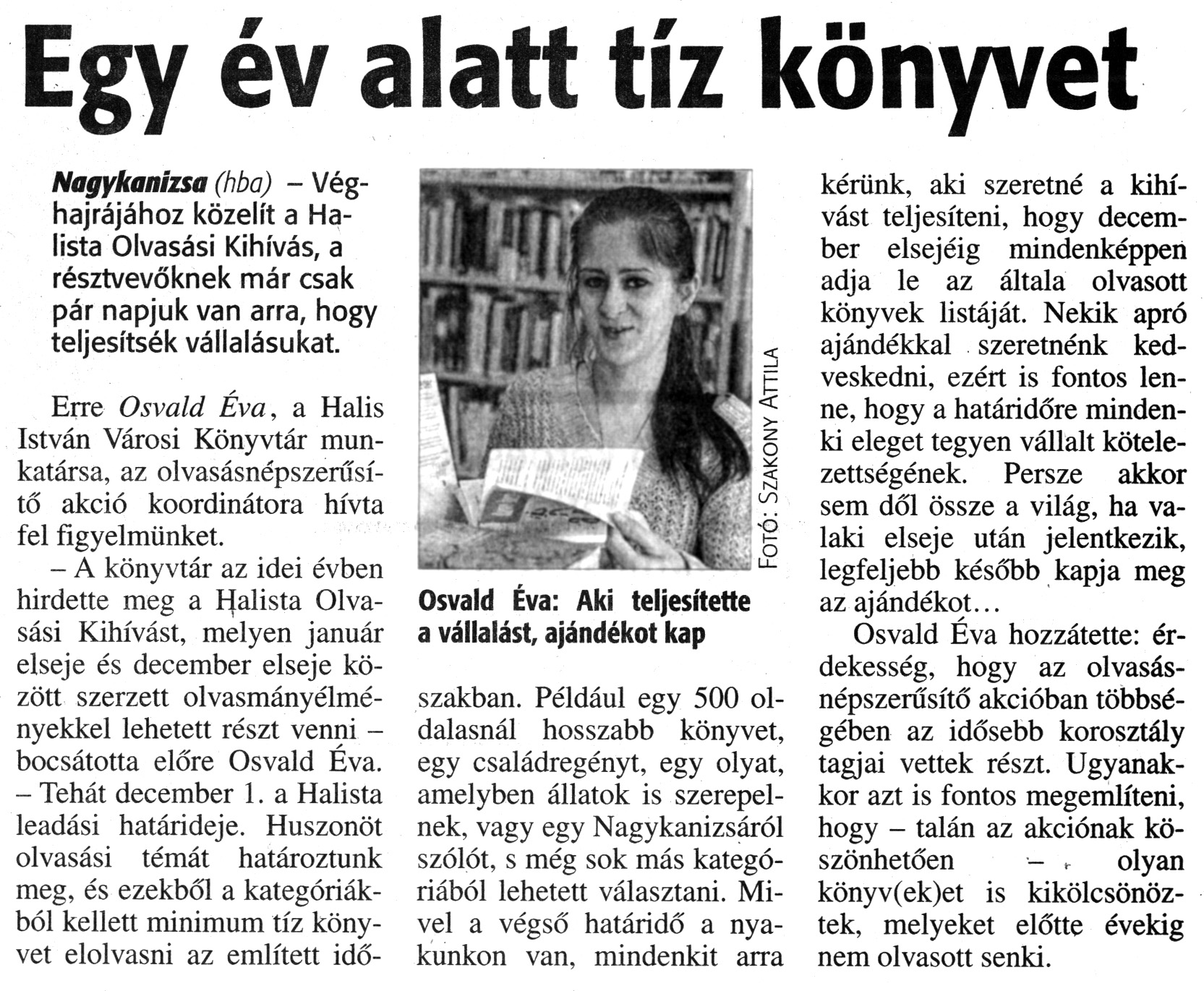 Nyilvános 2096 | 3723 | Zalai Hírlap 2015. november 26. 277. szám 7. oldal | Egy év alatt tíz könyvet Nagykanizsa (hba) - Véghajrájához közelít a Ha-lista Olvasási Kihívás, a résztvevőknek már csak pár napjuk van arra, hogy teljesítsék vállalásukat. Erre Osvald Éva, a Halis István Városi Könyvtár munkatársa, az olvasásnépszerűsítő akció koordinátora hívta fel figyelmünket. - A könyvtár az idei évben hirdette meg a Halista Olvasási Kihívást, melyen január elseje és december elseje között szerzett olvasmányélményekkel lehetett részt venni -bocsátotta előre Osvald Éva. - Tehát december 1. a Halista leadási határideje. Huszonöt olvasási témát határoztunk meg, és ezekből a kategóriákból kellett minimum tíz könyvet elolvasni az említett időszakban. Például egy 500 oldalasnál hosszabb könyvet, egy családregényt, egy olyat, amelyben állatok is szerepelnek, vagy egy Nagykanizsáról szólót, s még sok más kategóriából lehetett választani. Mivel a végső határidő a nyakunkon van, mindenkit arra kérünk, aki szeretné a kihívást teljesíteni, hogy december elsejéig mindenképpen adja le az általa olvasott könyvek listáját. Nekik apró ajándékkal szeretnénk kedveskedni, ezért is fontos lenne, hogy a határidőre mindenki eleget tegyen vállalt kötelezettségének. Persze akkor sem dől össze a világ, ha valaki elseje után jelentkezik, legfeljebb később kapja meg az ajándékot... Osvald Éva hozzátette: érdekesség, hogy az olvasás-népszerűsítő akcióban többségében az idősebb korosztály tagjai vettek részt. Ugyanakkor azt is fontos megemlíteni, hogy - talán az akciónak köszönhetően - olyan könyv(ek)et is kikölcsönöztek, melyeket előtte évekig nem olvasott senki. Osvald Éva: Aki teljesítette a vállalást, ajándékot kap |