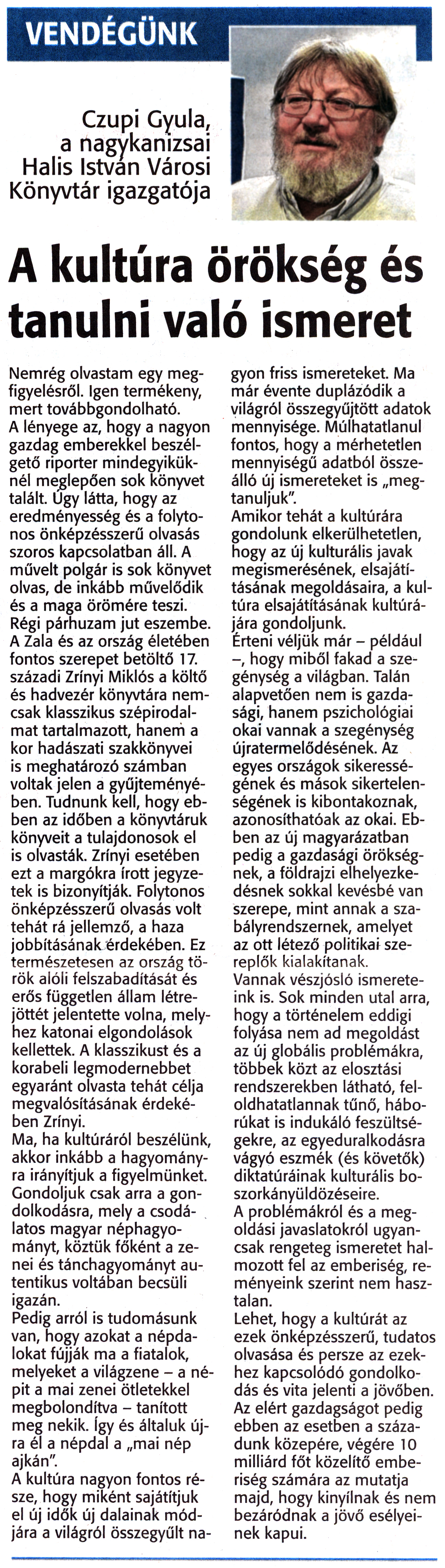 Nyilvános 2267 | 3770 | Zalai Hírlap 2016. január 16. 13. szám 2. oldal | VENDÉGÜNK Czupi Gyula, a nagykanizsai Halis István Városi Könyvtár igazgatója A kultúra örökség és tanulni való ismeret Nemrég olvastam egy megfigyelésről. Igen termékeny, mert továbbgondolható. A lényege az, hogy a nagyon gazdag emberekkel beszélgető riporter mindegyiküknél meglepően sok könyvet talált. Úgy látta, hogy az eredményesség és a folytonos önképzésszerű olvasás szoros kapcsolatban áll. A művelt polgár is sok könyvet olvas, de inkább művelődik és a maga örömére teszi. Régi párhuzam jut eszembe. A Zala és az ország életében fontos szerepet betöltő 17. századi Zrínyi Miklós a költő és hadvezér könyvtára nemcsak klasszikus szépirodalmat tartalmazott, hanem a kor hadászati szakkönyvei is meghatározó számban voltak jelen a gyűjteményében. Tudnunk kell, hogy ebben az időben a könyvtáruk könyveit a tulajdonosok el is olvasták. Zrínyi esetében ezt a margókra írott jegyzetek is bizonyítják. Folytonos önképzésszerű olvasás volt tehát rá jellemző, a haza jobbításának érdekében. Ez természetesen az ország török alóli felszabadítását és erős független állam létrejöttét jelentette volna, melyhez katonai elgondolások kellettek. A klasszikust és a korabeli legmodernebbet egyaránt olvasta tehát célja megvalósításának érdekében Zrínyi. Ma, ha kultúráról beszélünk, akkor inkább a hagyományra irányítjuk a figyelmünket. Gondoljuk csak arra a gondolkodásra, mely a csodálatos magyar néphagyományt, köztük főként a zenei és tánchagyományt autentikus voltában becsüli igazán. Pedig arról is tudomásunk van, hogy azokat a népdalokat fújják ma a fiatalok, melyeket a világzene - a népit a mai zenei ötletekkel megbolondítva - tanított meg nekik. Így és általuk újra él a népdal a „mai nép ajkán". A kultúra nagyon fontos része, hogy miként sajátítjuk el új idők új dalainak módjára a világról összegyűlt nagyon friss ismereteket. Ma már évente duplázódik a világról összegyűjtött adatok mennyisége. Múlhatatlanul fontos, hogy a mérhetetlen mennyiségű adatból összeálló új ismereteket is „megtanuljuk". Amikor tehát a kultúrára gondolunk elkerülhetetlen, hogy az új kulturális javak megismerésének, elsajátításának megoldásaira, a kultúra elsajátításának kultúrájára gondoljunk. Érteni véljük már - például hogy miből fakad a szegénység a világban. Talán alapvetően nem is gazdasági, hanem pszichológiai okai vannak a szegénység újratermelődésének. Az egyes országok sikerességének és mások sikertelenségének is kibontakoznak, azonosíthatóak az okai. Ebben az új magyarázatban pedig a gazdasági örökségnek, a földrajzi elhelyezkedésnek sokkal kevésbé van szerepe, mint annak a szabályrendszernek, amelyet az ott létező politikai szereplők kialakítanak. Vannak vészjósló ismereteink is. Sok minden utal arra, hogy a történelem eddigi folyása nem ad megoldást az új globális problémákra, többek közt az elosztási rendszerekben látható, feloldhatatlannak tűnő, háborúkat is indukáló feszültségekre, az egyeduralkodásra vágyó eszmék (és követők) diktatúráinak kulturális boszorkányüldözéseire. A problémákról és a megoldási javaslatokról ugyancsak rengeteg ismeretet halmozott fel az emberiség, reményeink szerint nem hasztalan. Lehet, hogy a kultúrát az ezek önképzésszerű, tudatos olvasása és persze az ezekhez kapcsolódó gondolkodás és vita jelenti a jövőben. Az elért gazdagságot pedig ebben az esetben a századunk közepére, végére 10 milliárd főt közelítő emberiség számára az mutatja majd, hogy kinyílnak és nem bezáródnak a jövő esélyeinek kapui. |