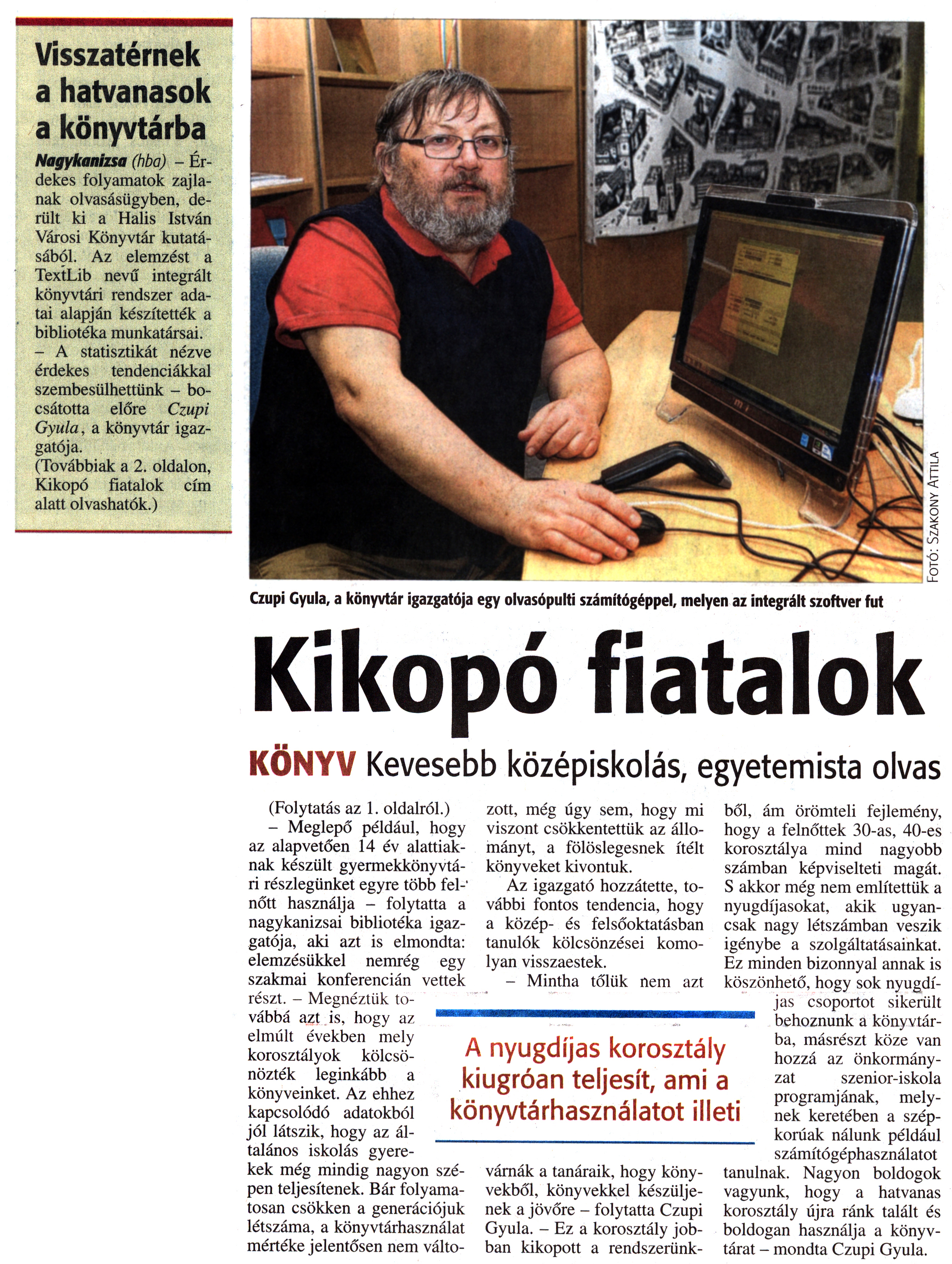 Nyilvános 2129 | 3703 | Zalai Hírlap 2016. március 16. 63. szám 1, 2. oldal | Visszatérnek a hatvanasok a könyvtárba Nagykanizsa (hba) - Érdekes folyamatok zajlanak olvasásügyben, derült ki a Halis István Városi Könyvtár kutatásából. Az elemzést a TextLib nevű integrált könyvtári rendszer adatai alapján készítették a bibliotéka munkatársai. - A statisztikát nézve érdekes tendenciákkal szembesülhettünk - bocsátotta előre Czupi Gyula, a könyvtár igazgatója. (Továbbiak a 2. oldalon, Kikopó fiatalok cím alatt olvashatók.) Czupi Gyula, a könyvtár igazgatója egy olvasópulti számítógéppel, melyen az integrált szoftver fut Kikopó fiatalok KÖNYV Kevesebb középiskolás, egyetemista olvas A nyugdíjas korosztály kiugróan teljesít, ami a könyvtárhasználatot illeti (Folytatás az 1. oldalról.) - Meglepő például, hogy az alapvetően 14 év alattiaknak készült gyermekkönyvtári részlegünket egyre több fel-\' nőtt használja - folytatta a nagykanizsai bibliotéka igazgatója, aki azt is elmondta: elemzésükkel nemrég egy szakmai konferencián vettek részt. - Megnéztük továbbá azt is, hogy az elmúlt években mely korosztályok kölcsönözték leginkább a könyveinket. Az ehhez kapcsolódó adatokból jól látszik, hogy az általános iskolás gyerekek még mindig nagyon szépen teljesítenek. Bár folyamatosan csökken a generációjuk létszáma, a könyvtárhasználat mértéke jelentősen nem változott, még úgy sem, hogy mi viszont csökkentettük az állományt, a fölöslegesnek ítélt könyveket kivontuk. Az igazgató hozzátette, további fontos tendencia, hogy a közép- és felsőoktatásban tanulók kölcsönzései komolyan visszaestek. - Mintha tőlük nem azt várnák a tanáraik, hogy könyvekből, könyvekkel készüljenek a jövőre - folytatta Czupi Gyula. - Ez a korosztály jobban kikopott a rendszerünkből, ám örömteli fejlemény, hogy a felnőttek 30-as, 40-es korosztálya mind nagyobb számban képviselteti magát. S akkor még nem említettük a nyugdíjasokat, akik ugyancsak nagy létszámban veszik igénybe a szolgáltatásainkat. Ez minden bizonnyal annak is köszönhető, hogy sok nyugdíjas csoportot sikerült behoznunk a könyvtárba, másrészt köze van hozzá az önkormányzat szenior-iskola programjának, melynek keretében a szépkorúak nálunk például számítógéphasználatot tanulnak. Nagyon boldogok vagyunk, hogy a hatvanas korosztály újra ránk talált és boldogan használja a könyvtárat - mondta Czupi Gyula. |