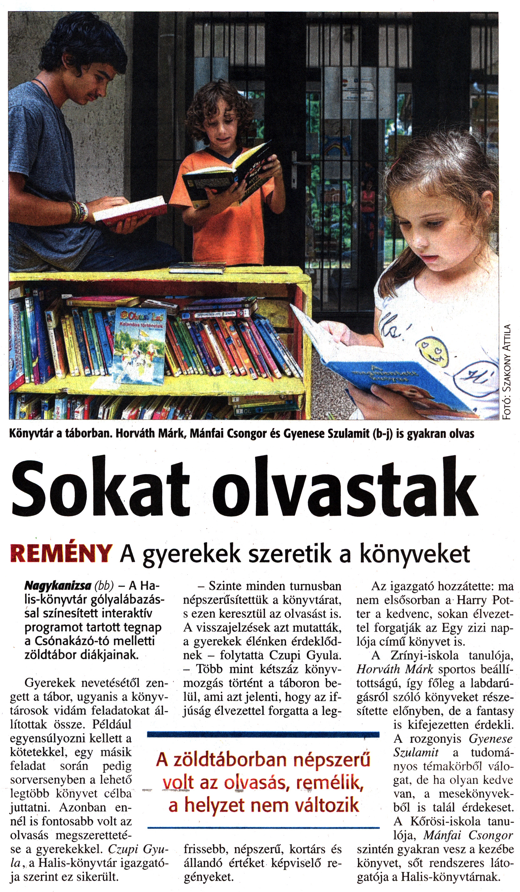 Nyilvános 2161 | 3666 | Zalai Hírlap 2016. augusztus 19. 195. szám 2. oldal - Sokat olvastak | Sokat olvastak REMÉNY A gyerekek szeretik a könyveket Nagykanizsa (bb) - A Halis-könyvtár gólyalábazással színesített interaktív programot tartott tegnap a Csónakázó-tó melletti zöldtábor diákjainak. Gyerekek nevetésétől zengett a tábor, ugyanis a könyvtárosok vidám feladatokat állítottak össze. Például egyensúlyozni kellett a kötetekkel, egy másik feladat során pedig sorversenyben a lehető legtöbb könyvet célba juttatni. Azonban ennél is fontosabb volt az olvasás megszerettetése a gyerekekkel. Czupi Gyula, a Halis-könyvtár igazgatója szerint ez sikerült. - Szinte minden turnusban népszerűsítettük a könyvtárat, s ezen keresztül az olvasást is. A visszajelzések azt mutatták, a gyerekek élénken érdeklődnek - folytatta Czupi Gyula. - Több mint kétszáz könyvmozgás történt a táboron belül, ami azt jelenti, hogy az ifjúság élvezettel forgatta a legfrissebb, népszerű, kortárs és állandó értéket képviselő regényeket. Az igazgató hozzátette: ma nem elsősorban a Harry Potter a kedvenc, sokan élvezettel forgatják az Egy zizi naplója című könyvet is. A Zrínyi-iskola tanulója, Horváth Márk sportos beállítottságú, így főleg a labdarúgásról szóló könyveket részesítette előnyben, de a fantasy is kifejezetten érdekli. A rozgonyis Gyenese Szulamit a tudományos témakörből válogat, de ha olyan kedve van, a mesekönyvekből is talál érdekeset. A Kőrösi-iskola tanulója, Mánfai Csongor szintén gyakran vesz a kezébe könyvet, sőt rendszeres látogatója a Halis-könyvtárnak. |