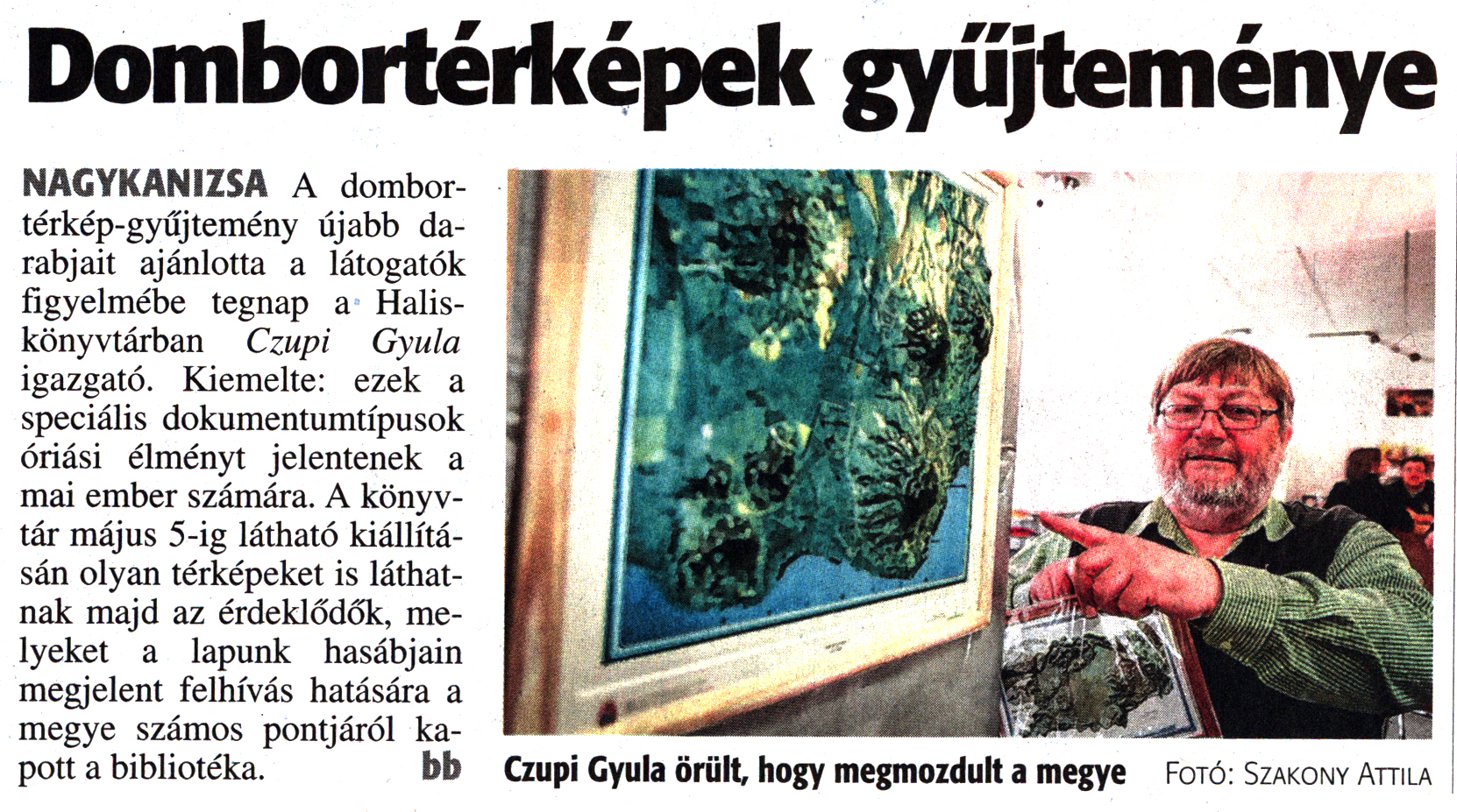 Nyilvános 2125 | 3764 | Zalai Hírlap 2017. április 25. 95. szám 2. oldal | Dombortérképek gyűjteménye NAGYKANIZSA A dombortérkép-gyűjtemény újabb darabjait ajánlotta a látogatók figyelmébe tegnap a Halis-könyvtárban Czupi Gyula igazgató. Kiemelte: ezek a speciális dokumentumtípusok óriási élményt jelentenek a mai ember számára. A könyvtár május 5-ig látható kiállításán olyan térképeket is láthatnak majd az érdeklődők, melyeket a lapunk hasábjain megjelent felhívás hatására a megye számos pontjáról kapott a bibliotéka. bb Czupi Gyula örült, hogy megmozdult a megye Fotó: Szakony Attila |