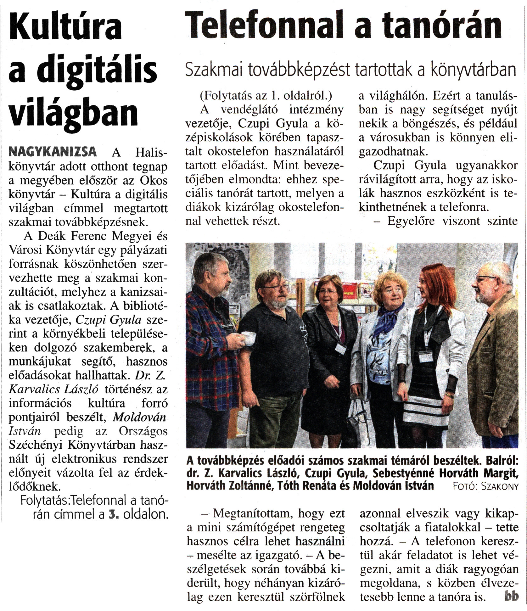 Nyilvános 2049 | 3565 | Zalai Hírlap 2017. november 21. 271. szám 1, 3. oldal | Kultúra a digitális világban NAGYKANIZSA A Halis könyvtár adott otthont tegnap a megyében először az Okos könyvtár - Kultúra a digitális világban címmel megtartott szakmai továbbképzésnek. A Deák Ferenc Megyei és Városi Könyvtár egy pályázati forrásnak köszönhetően szervezhette meg a szakmai konzultációt, melyhez a kanizsaiak is csatlakoztak. A bibliotéka vezetője, Czupi Gyula szerint a környékbeli településeken dolgozó szakemberek, a munkájukat segítő, hasznos előadásokat hallhattak. Dr. Z. Karvalics László történész az információs kultúra forró pontjairól beszélt, Moldován István pedig az Országos Széchényi Könyvtárban használt új elektronikus rendszer előnyeit vázolta fel az érdeklődőknek. Folytatás:Telefonnal a tanórán címmel a 3. oldalon. A továbbképzés előadói számos szakmai témáról beszéltek. Balról: dr. Z. Karvalics László, Czupi Gyula, Sebestyénné Horváth Margit, Horváth Zoltánné, Tóth Renáta és Moldován István Fotó: Szakony Telefonnal a tanórán Szakmai továbbképzést tartottak a könyvtárban (Folytatás az 1. oldalról.) A vendéglátó intézmény vezetője, Czupi Gyula a középiskolások körében tapasztalt okostelefon használatáról tartott előadást. Mint bevezetőjében elmondta: ehhez speciális tanórát tartott, melyen a diákok kizárólag okostelefonnal vehettek részt. - Megtanítottam, hogy ezt a mini számítógépet rengeteg hasznos célra lehet használni - mesélte az igazgató. - A beszélgetések során továbbá kiderült, hogy néhányan kizárólag ezen keresztül szörfölnek a világhálón. Ezért a tanulásban is nagy segítséget nyújt nekik a böngészés, és például a városukban is könnyen eligazodhatnak. Czupi Gyula ugyanakkor rávilágított arra, hogy az iskolák hasznos eszközként is tekinthetnének a telefonra. - Egyelőre viszont szinte azonnal elveszik vagy kikapcsoltatják a fiatalokkal - tette hozzá. - A telefonon keresztül akár feladatot is lehet végezni, amit a diák ragyogóan megoldana, s közben élvezetesebb lenne a tanóra is. bb |