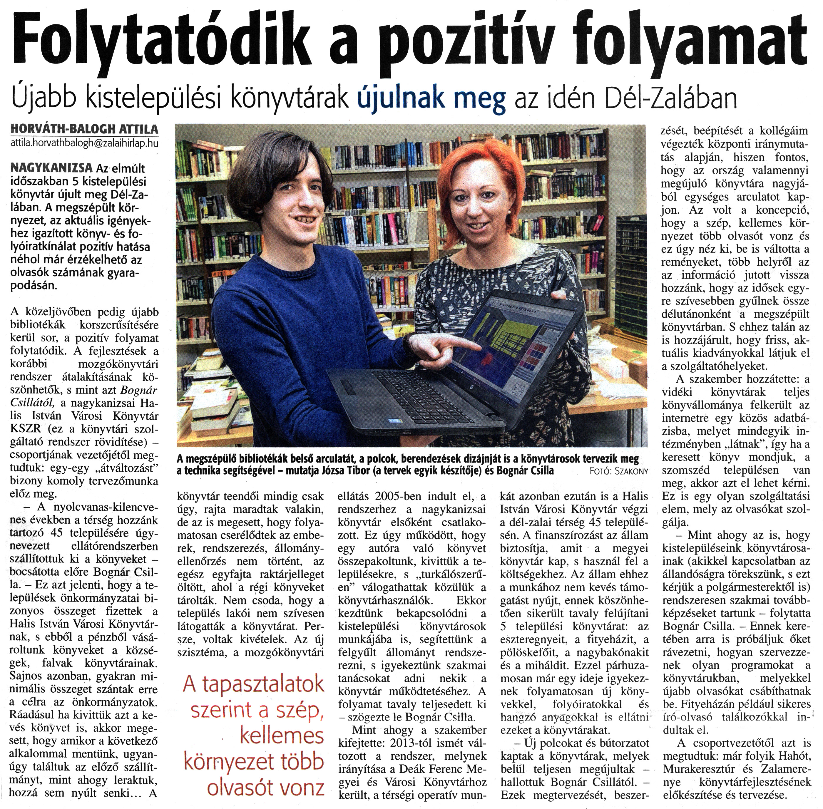 Nyilvános 1889 | 3286 | Zalai Hírlap 2018. február 15. 39. szám 6. oldal | Folytatódik a pozitív folyamat Újabb kistelepülési könyvtárak újulnak meg az idén Dél-Zalában A megszépülő bibliotékák belső arculatát, a polcok, berendezések dizájnját is a könyvtárosok tervezik meg a technika segítségével - mutatja Józsa Tibor (a tervek egyik készítője) és Bognár Csilla Fotó: Szakony HORVÁTH-BALOGH ATTILA attila.horvathbalogh@zalaihirlap.hu NAGYKANIZSA Az elmúlt időszakban 5 kistelepülési könyvtár újult meg Dél-Zalában. A megszépült környezet, az aktuális igényekhez igazított könyv- és folyóiratkínálat pozitív hatása néhol már érzékelhető az olvasók számának gyarapodásán. A közeljövőben pedig újabb bibliotékák korszerűsítésére kerül sor, a pozitív folyamat folytatódik. A fejlesztések a korábbi mozgókönyvtári rendszer átalakításának köszönhetők, s mint azt Bognár Csillától, a nagykanizsai Ha-lis István Városi Könyvtár KSZR (ez a könyvtári szolgáltató rendszer rövidítése) -csoportjának vezetőjétől megtudtuk: egy-egy „átváltozást" bizony komoly tervezőmunka előz meg. - A nyolcvanas-kilencvenes években a térség hozzánk tartozó 45 településére úgynevezett ellátórendszerben szállítottuk ki a könyveket -bocsátotta előre Bognár Csilla. - Ez azt jelenti, hogy a települések önkormányzatai bizonyos összeget fizettek a Halis István Városi Könyvtárnak, s ebből a pénzből vásároltunk könyveket a községek, falvak könyvtárainak. Sajnos azonban, gyakran minimális összeget szántak erre a célra az önkormányzatok. Ráadásul ha kivittük azt a kevés könyvet is, akkor megesett, hogy amikor a következő alkalommal mentünk, ugyanúgy találtuk az előző szállítmányt, mint ahogy leraktuk, hozzá sem nyúlt senki... A könyvtár teendői mindig csak úgy, rajta maradtak valakin, de az is megesett, hogy folyamatosan cserélődtek az emberek, rendszerezés, állományellenőrzés nem történt, az egész egyfajta raktárjelleget öltött, ahol a régi könyveket tárolták. Nem csoda, hogy a település lakói nem szívesen látogatták a könyvtárat. Persze, voltak kivételek. Az új szisztéma, a mozgókönyvtári A tapasztalatok szerint a szép, kellemes környezet több olvasót vonz ellátás 2005-ben indult el, a rendszerhez a nagykanizsai könyvtár elsőként csatlakozott. Ez úgy működött, hogy egy autóra való könyvet összepakoltunk, kivittük a településekre, s „turkálószerűen" válogathattak közülük a könyvtárhasználók. Ekkor kezdtünk bekapcsolódni a kistelepülési könyvtárosok munkájába is, segítettünk a felgyűlt állományt rendszerezni, s igyekeztünk szakmai tanácsokat adni nekik a könyvtár működtetéséhez. A folyamat tavaly teljesedett ki - szögezte le Bognár Csilla. Mint ahogy a szakember kifejtette: 2013-tól ismét változott a rendszer, melynek irányítása a Deák Ferenc Megyei és Városi Könyvtárhoz került, a térségi operatív mun- kát azonban ezután is a Halis István Városi Könyvtár végzi a dél-zalai térség 45 településén. A finanszírozást az állam biztosítja, amit a megyei könyvtár kap, s használ fel a költségekhez. Az állam ehhez a munkához nem kevés támogatást nyújt, ennek köszönhetően sikerült tavaly felújítani 5 települési könyvtárat: az eszteregnyeit, a fityeházit, a pölöskefőit, a nagybakónakit és a miháldit. Ezzel párhuzamosan már egy ideje igyekeznek folyamatosan új könyvekkel, folyóiratokkal és hangzó anyagokkal is ellátni ezeket a könyvtárakat. - Új polcokat és bútorzatot kaptak a könyvtárak, melyek belül teljesen megújultak -hallottuk Bognár Csillától. - Ezek megtervezését, beszerzését, beépítését a kollégáim végezték központi iránymutatás alapján, hiszen fontos, hogy az ország valamennyi megújuló könyvtára nagyjából egységes arculatot kapjon. Az volt a koncepció, hogy a szép, kellemes környezet több olvasót vonz és ez úgy néz ki, be is váltotta a reményeket, több helyről az az információ jutott vissza hozzánk, hogy az idősek egyre szívesebben gyűlnek össze délutánonként a megszépült könyvtárban. S ehhez talán az is hozzájárult, hogy friss, aktuális kiadványokkal látjuk el a szolgáltatóhelyeket. A szakember hozzátette: a vidéki könyvtárak teljes könyvállománya felkerült az internetre egy közös adatbázisba, melyet mindegyik intézményben „látnak", így ha a keresett könyv mondjuk, a szomszéd településen van meg, akkor azt el lehet kérni. Ez is egy olyan szolgáltatási elem, mely az olvasókat szolgálja. - Mint ahogy az is, hogy kistelepüléseink könyvtárosainak (akikkel kapcsolatban az állandóságra törekszünk, s ezt kérjük a polgármesterektől is) rendszeresen szakmai továbbképzéseket tartunk - folytatta Bognár Csilla. - Ennek keretében arra is próbáljuk őket rávezetni, hogyan szervezzenek olyan programokat a könyvtárukban, melyekkel újabb olvasókat csábíthatnak be. Fityeházán például sikeres író-olvasó találkozókkal indultak el. A csoportvezetőtől azt is megtudtuk: már folyik Hahót, Murakeresztúr és Zalamerenye könyvtárfejlesztésének előkészítése és tervezése. |