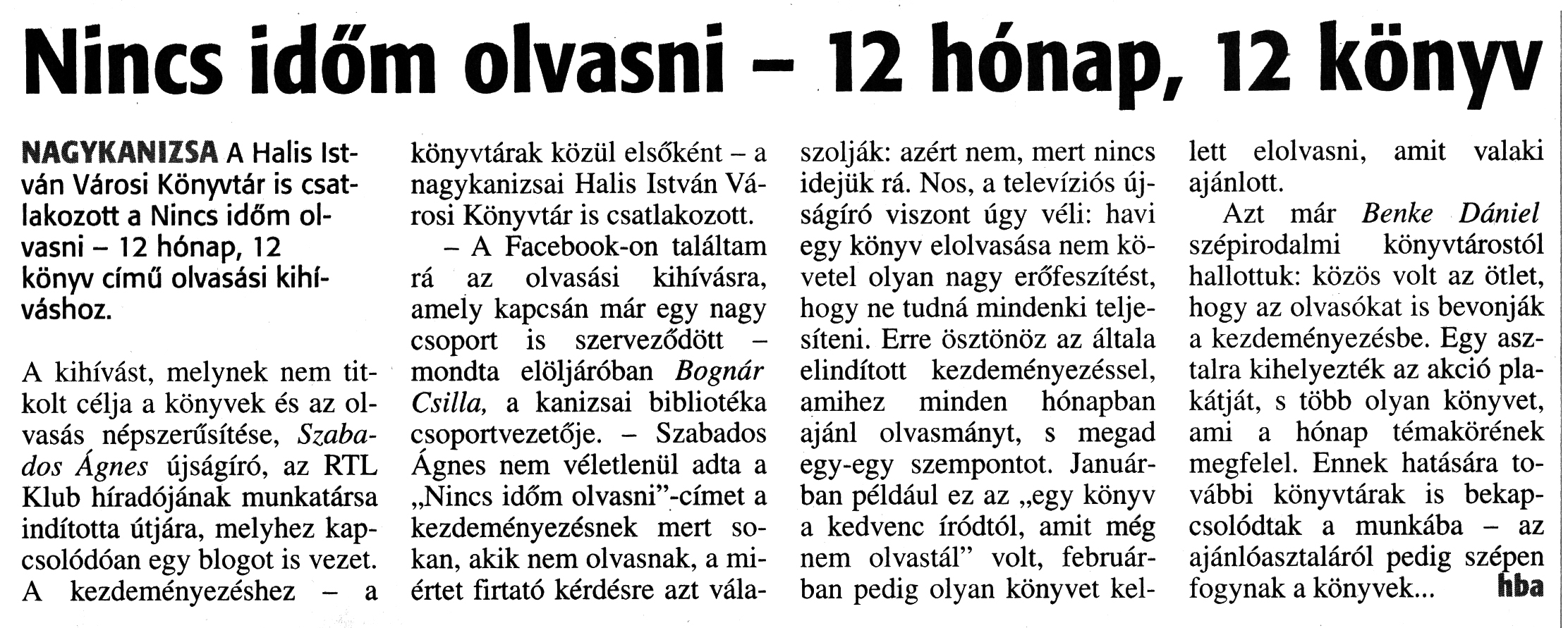 Nyilvános 2080 | 3484 | Zalai Hírlap 2018. március 6. 55. szám 13. oldal | Nincs időm olvasni - 12 hónap, 12 könyv NAGYKANIZSA A Halis István Városi Könyvtár is csatlakozott a Nincs időm olvasni - 12 hónap, 12 könyv című olvasási kihíváshoz. A kihívást, melynek nem titkolt célja a könyvek és az olvasás népszerűsítése, Szabados Ágnes újságíró, az RTL Klub híradójának munkatársa indította útjára, melyhez kapcsolódóan egy blogot is vezet. A kezdeményezéshez - a könyvtárak közül elsőként - a nagykanizsai Halis István Városi Könyvtár is csatlakozott. - A Facebook-on találtam rá az olvasási kihívásra, amely kapcsán már egy nagy csoport is szerveződött -mondta elöljáróban Bognár Csilla, a kanizsai bibliotéka csoportvezetője. - Szabados Ágnes nem véletlenül adta a „Nincs időm olvasni"-címet a kezdeményezésnek mert sokan, akik nem olvasnak, a miértet firtató kérdésre azt válaszolják: azért nem, mert nincs idejük rá. Nos, a televíziós újságíró viszont úgy véli: havi egy könyv elolvasása nem követel olyan nagy erőfeszítést, hogy ne tudná mindenki teljesíteni. Erre ösztönöz az általa elindított kezdeményezéssel, amihez minden hónapban ajánl olvasmányt, s megad egy-egy szempontot. Januárban például ez az „egy könyv a kedvenc íródtól, amit még nem olvastál" volt, februárban pedig olyan könyvet kellett elolvasni, amit valaki ajánlott. Azt már Benke Dániel szépirodalmi könyvtárostól hallottuk: közös volt az ötlet, hogy az olvasókat is bevonják a kezdeményezésbe. Egy asztalra kihelyezték az akció plakátját, s több olyan könyvet, ami a hónap témakörének megfelel. Ennek hatására további könyvtárak is bekapcsolódtak a munkába - az ajánlóasztaláról pedig szépen fogynak a könyvek... hba |