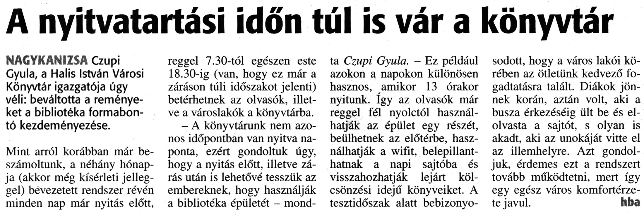 Nyilvános 2045 | 3417 | Zalai Hírlap 2018. május 11. 108. szám 3. oldal | A nyitvatartási időn túl is vár a könyvtár NAGYKANIZSA Czupi Gyula, a Halis István Városi Könyvtár igazgatója úgy véli: beváltotta a reményeket a bibliotéka formabontó kezdeményezése. Mint arról korábban már beszámoltunk, a néhány hónapja (akkor még kísérleti jelleggel) bevezetett rendszer révén minden nap már nyitás előtt. reggel 7.30-tól egészen este 18.30-ig (van, hogy ez már a záráson túli időszakot jelenti) betérhetnek az olvasók, illetve a városlakók a könyvtárba. - A könyvtárunk nem azonos időpontban van nyitva naponta, ezért gondoltuk úgy, hogy a nyitás előtt, illetve zárás után is lehetővé tesszük az embereknek, hogy használják a bibliotéka épületét - mondta Czupi Gyula. - Ez például azokon a napokon különösen hasznos, amikor 13 órakor nyitunk. Így az olvasók már reggel fél nyolctól használhatják az épület egy részét, beülhetnek az előtérbe, használhatják a wifit, belepillanthatnak a napi sajtóba és visszahozhatják lejárt kölcsönzési idejű könyveiket. A tesztidőszak alatt bebizonyosodott, hogy a város lakói körében az ötletünk kedvező fogadtatásra talált. Diákok jönnek korán, aztán volt, aki a busza érkezéséig ült be és elolvasta a sajtót, s olyan is akadt, aki az unokáját vitte el az illemhelyre. Azt gondoljuk, érdemes ezt a rendszert tovább működtetni, mert így egy egész város komfortérzete javul. hba |