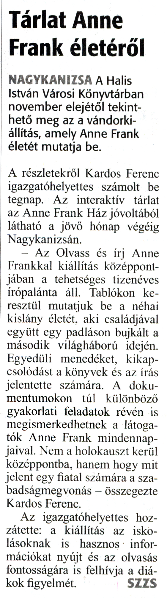 Nyilvános 1969 | 2979 | Zalai Hírlap 2018. október 31. 253. szám 1. oldal | Tárlat Anne Frank életéről NAGYKANIZSA A Halis István Városi Könyvtárban november elejétől tekinthető meg az a vándorkiállítás, amely Anne Frank életét mutatja be. A részletekről Kardos Ferenc igazgatóhelyettes számolt be tegnap. Az interaktív tárlat az Anne Frank Ház jóvoltából látható a jövő hónap végéig Nagykanizsán. - Az Olvass és írj Anne Frankkal kiállítás középpontjában a tehetséges tizenéves írópalánta áll. Tablókon keresztül mutatjuk be a néhai kislány életét, aki családjával együtt egy padláson bujkált a második világháború idején. Egyedüli menedéket, kikapcsolódást a könyvek és az írás jelentette számára. A dokumentumokon túl különböző gyakorlati feladatok révén is megismerkedhetnek a látogatók Anne Frank mindennapjaival. Nem a holokauszt kerül középpontba, hanem hogy mit jelent egy fiatal számára a szabadságmegvonás - összegezte Kardos Ferenc. Az igazgatóhelyettes hozzátette: a kiállítás az iskolásoknak is hasznos információkat nyújt és az olvasás fontosságára is felhívja a diákok figyelmét. SZZS |