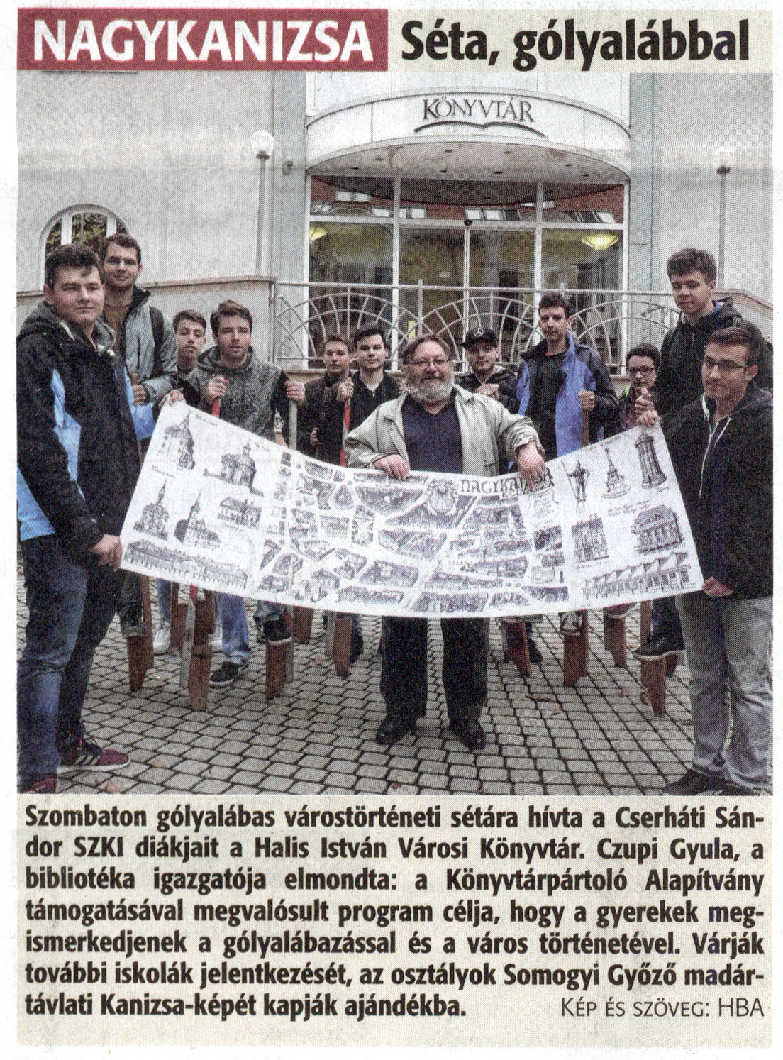 Nyilvános 1975 | 3026 | Zalai Hírlap 2018. november 12. 262. szám 16. oldal - Séta, gólyalábbal | NAGYKANIZSA Séta, gólyalábbal Szombaton gólyalábas várostörténeti sétára hívta a Cserháti Sándor SZKI diákjait a Halis István Városi Könyvtár. Czupi Gyula, a bibliotéka igazgatója elmondta: a Könyvtárpártoló Alapítvány támogatásával megvalósult program célja, hogy a gyerekek megismerkedjenek a gólyalábazással és a város történetével. Várják további iskolák jelentkezését, az osztályok Somogyi Győző madártávlati Kanizsa-képét kapják ajándékba. kép és szöveg: MBA |