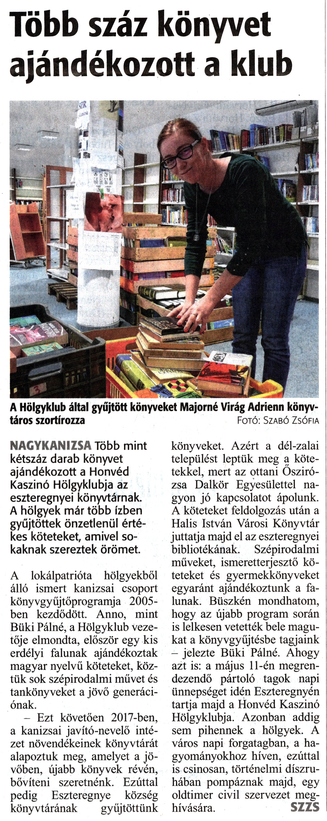 Nyilvános 1987 | 3200 | Zalai Hírlap 2019. április 25. 95. szám 16. oldal | Több száz könyvet ajándékozott a klub A Hölgyklub által gyűjtött könyveket Majorné Virág Adrienn könyvtáros szortírozza Fotó: Szabó Zsófia NAGYKANIZSA Több mint kétszáz darab könyvet ajándékozott a Honvéd Kaszinó Hölgyklubja az eszteregnyei könyvtárnak. A hölgyek már több ízben gyűjtöttek önzetlenül értékes köteteket, amivel sokaknak szereztek örömet. A lokálpatrióta hölgyekből álló ismert kanizsai csoport könyvgyűjtőprogramja 2005-ben kezdődött. Anno, mint Büki Pálné, a Hölgyklub vezetője elmondta, először egy kis erdélyi falunak ajándékoztak magyar nyelvű köteteket, köztük sok szépirodalmi müvet és tankönyveket a jövő generációnak. - Ezt követően 2017-ben, a kanizsai javító-nevelő intézet növendékeinek könyvtárát alapoztuk meg, amelyet a jövőben, újabb könyvek révén, bővíteni szeretnénk. Ezúttal pedig Eszteregnye község könyvtárának gyűjtöttünk könyveket. Azért a dél-zalai települést leptük meg a kötetekkel, mert az ottani Őszirózsa Dalkör Egyesülettel nagyon jó kapcsolatot ápolunk. A köteteket feldolgozás után a Halis István Városi Könyvtár juttatja majd el az eszteregnyei bibliotékának. Szépirodalmi műveket, ismeretterjesztő köteteket és gyermekkönyveket egyaránt ajándékoztunk a falunak. Büszkén mondhatom, hogy az újabb program során is lelkesen vetették bele magukat a könyvgyűjtésbe tagjaink - jelezte Büki Pálné. Ahogy azt is: a május 11-én megrendezendő pártoló tagok napi ünnepséget idén Eszteregnyén tartja majd a Honvéd Kaszinó Hölgyklubja. Azonban addig sem pihennek a hölgyek. A város napi forgatagban, a hagyományokhoz híven, ezúttal is csinosan, történelmi díszruhában pompáznak majd, egy oldtimer civil szervezet meghívására. SZZS |