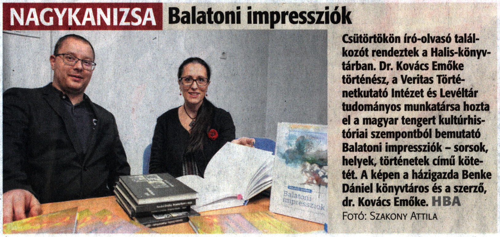 Nyilvános 1855 | 2749 | Zalai Hírlap 2020. február 1. 27. szám 5. oldal - Balatoni impressziók | Csütörtökön író-olvasó találkozót rendeztek a Halis-könyvtárban. Dr. Kovács Emőke történész, a Veritas Történetkutató Intézet és Levéltár tudományos munkatársa hozta el a magyar tengert kultúrhistóriai szempontból bemutató Balatoni impressziók - sorsok, helyek, történetek című kötetét. A képen a házigazda Benke Dániel könyvtáros és a szerző, dr. Kovács Emőke. HBA Fotó: Szakony Attila |